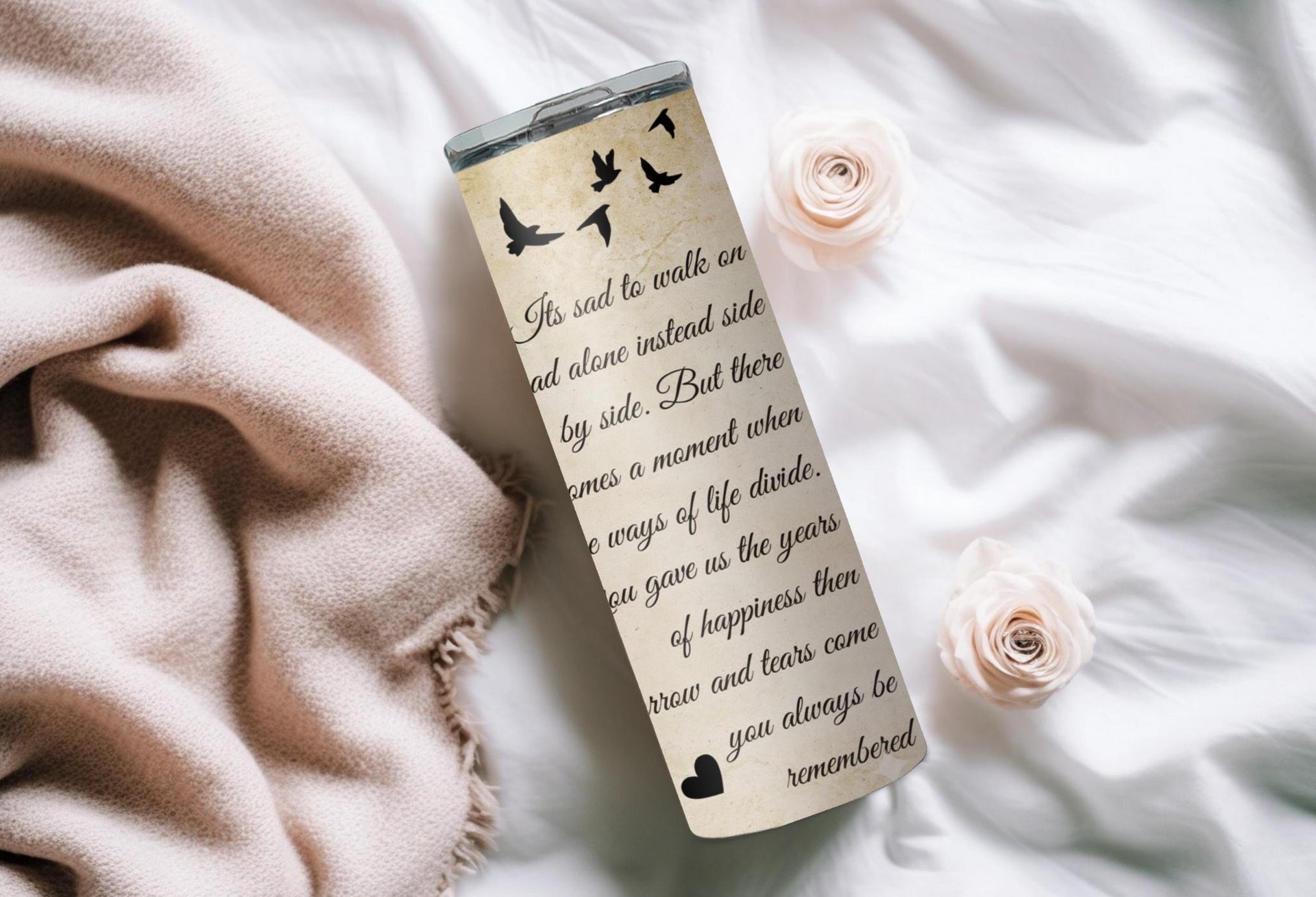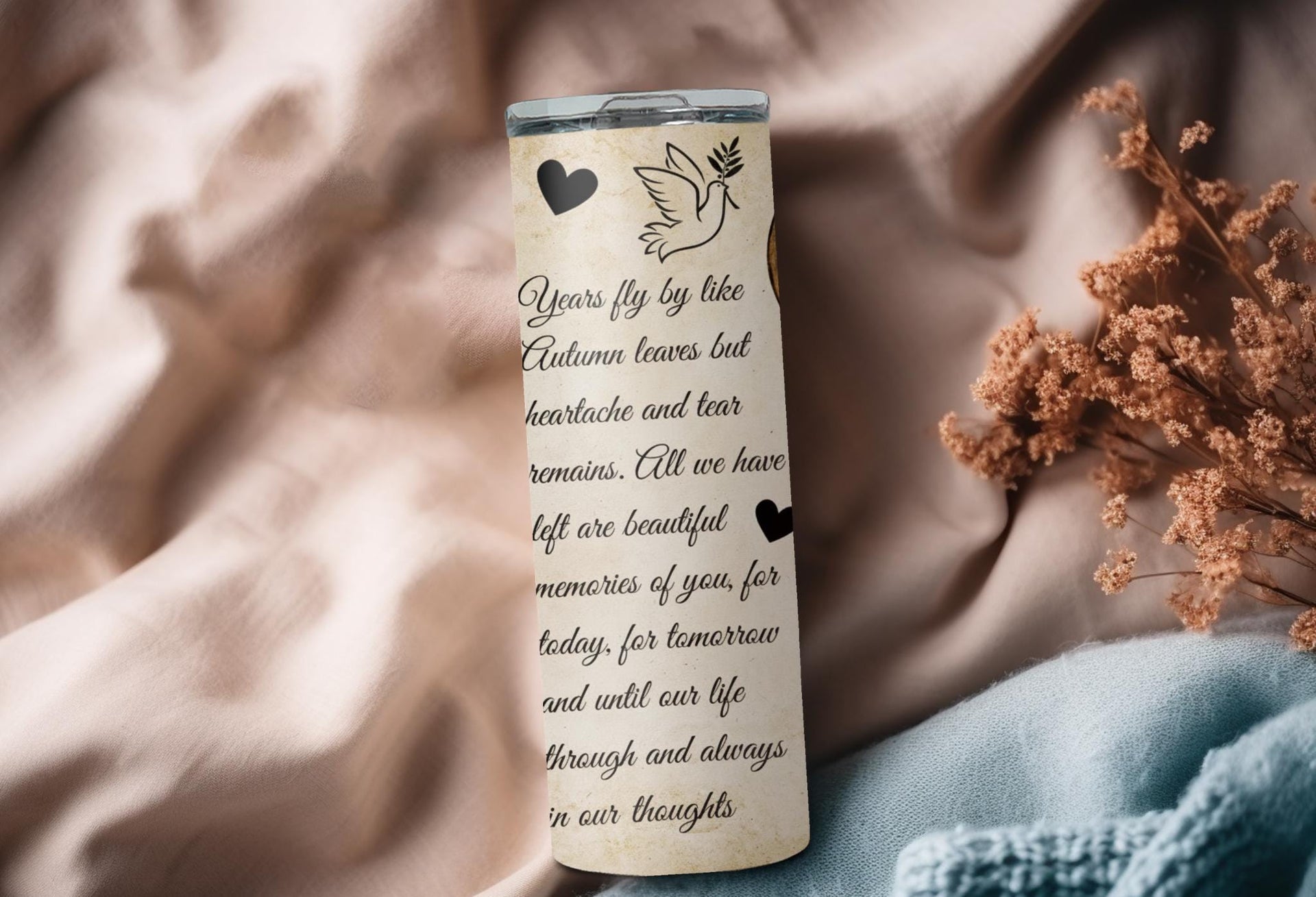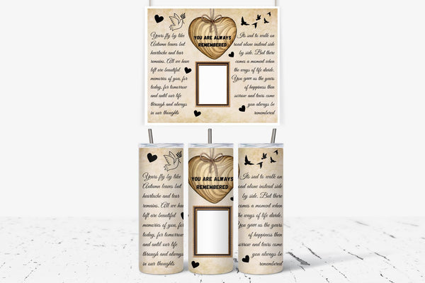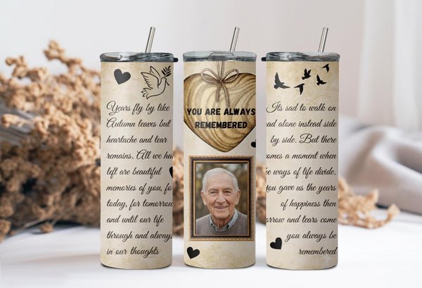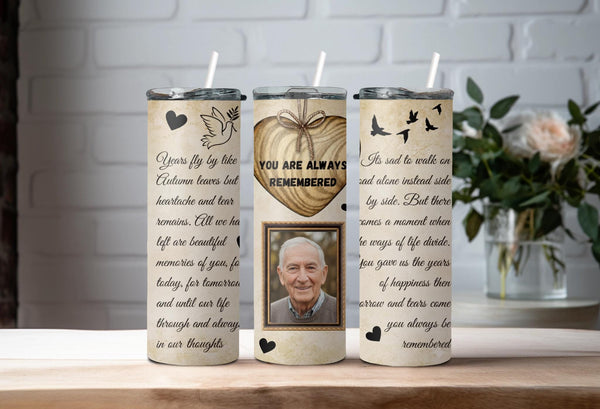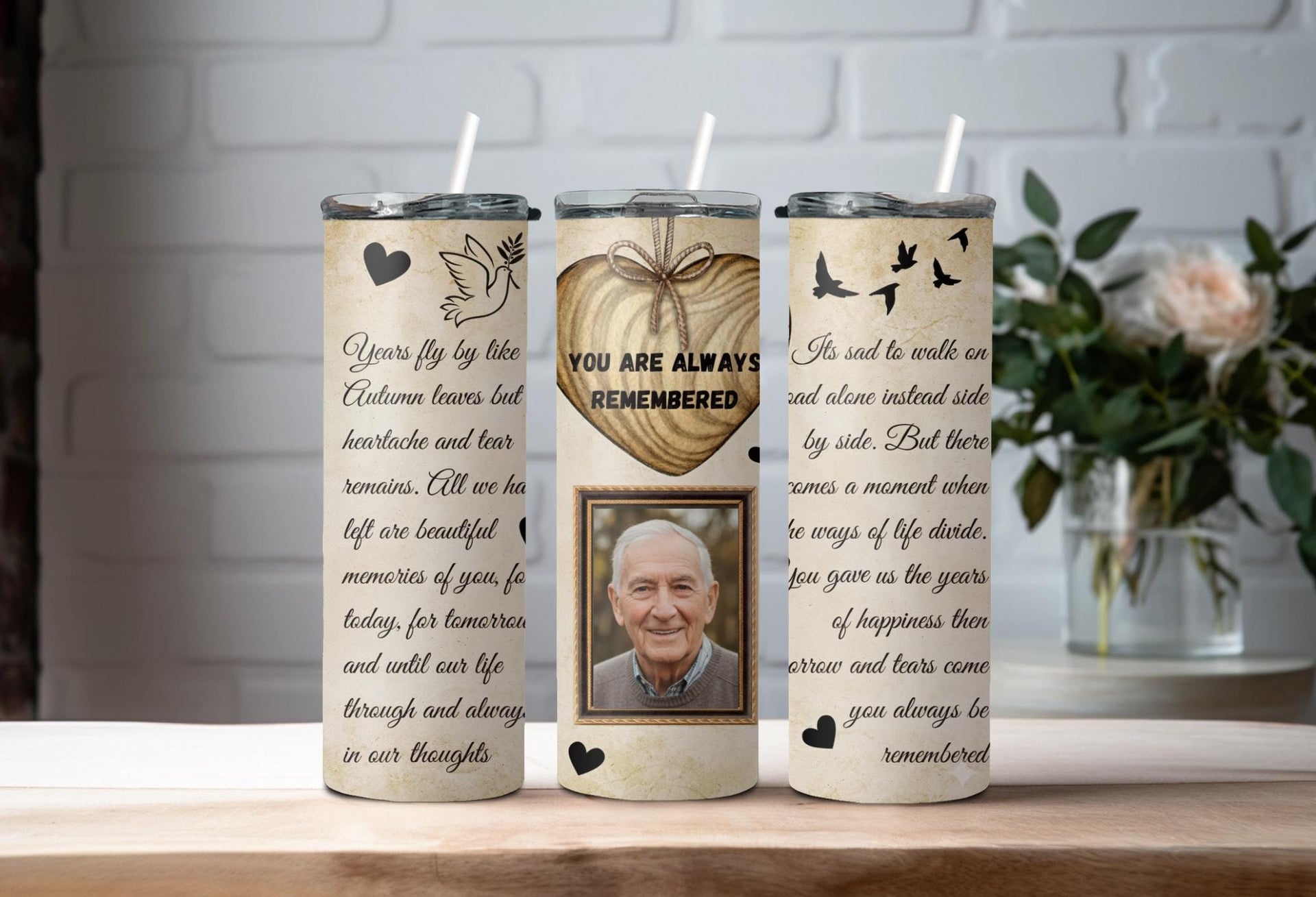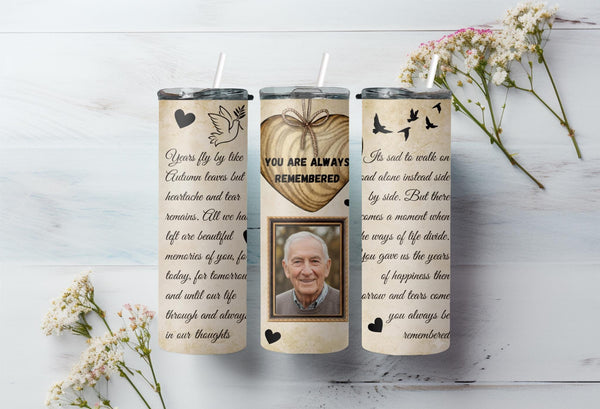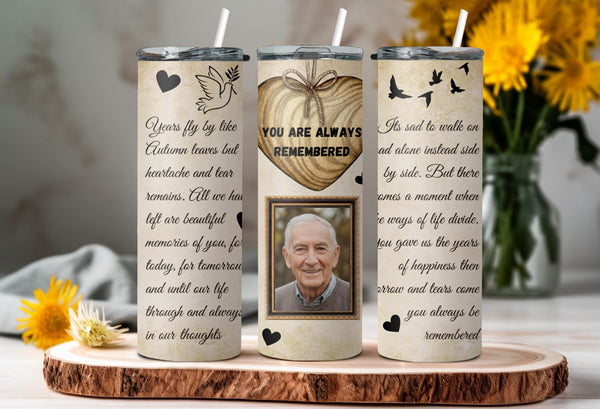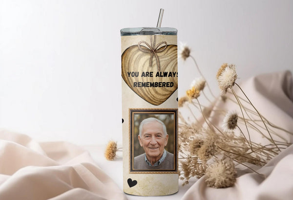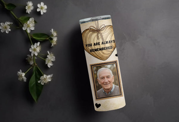 This heartfelt tumbler, featuring a rustic wooden heart and a bow, will always remind you of your loved one. Inscribed with the inspiring words "YOU ARE ALWAYS REMEMBERED" and with a space for a personalized photo, it keeps drinks hot for up to 6 hours and cold for up to 24 hours. Personalize it with a name and keep your memories close.