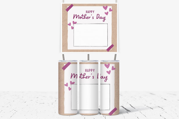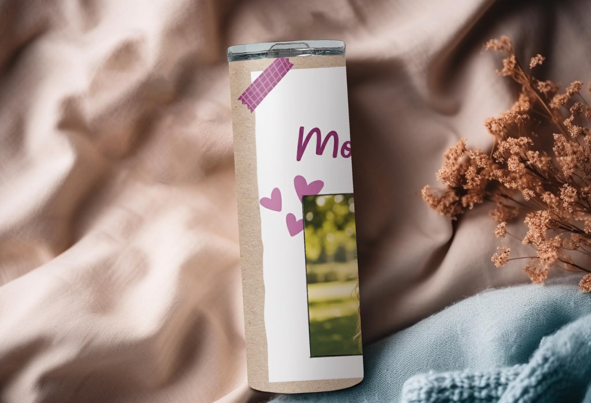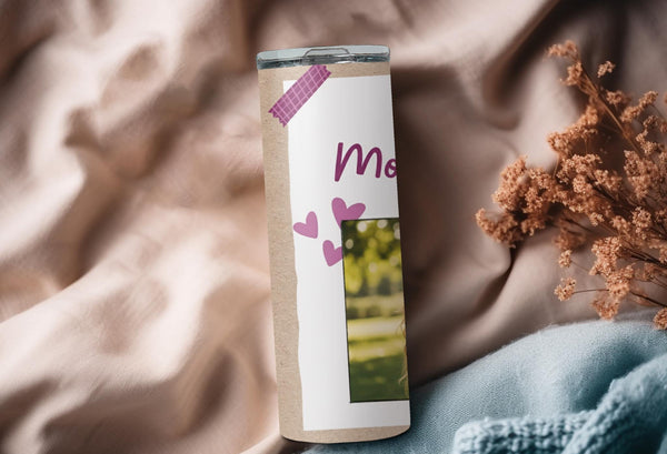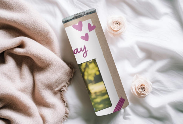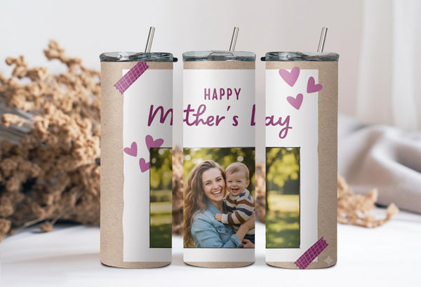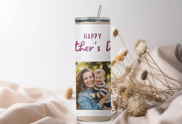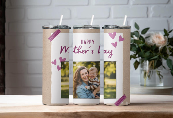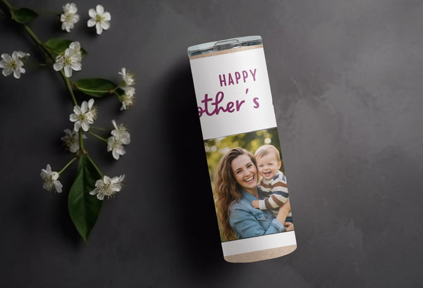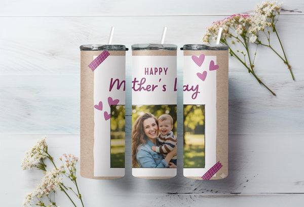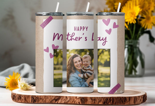 Celebrate your mom with our Mother's Day Photo Tumbler! Adorned with "HAPPY Mother’s Day" and purple hearts, personalize it with a photo and name. Keep your drinks hot for 6 hours or cold for 24 hours. Show her your love with every sip!