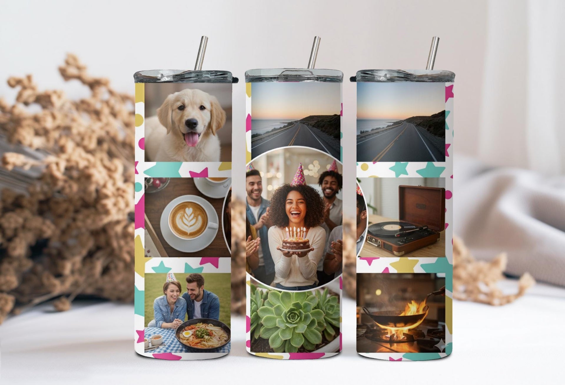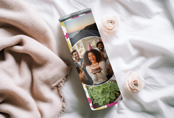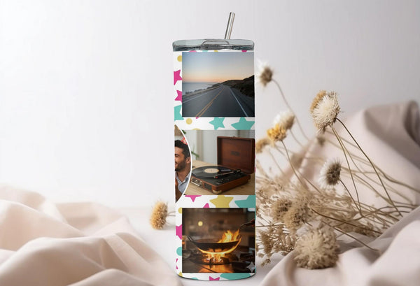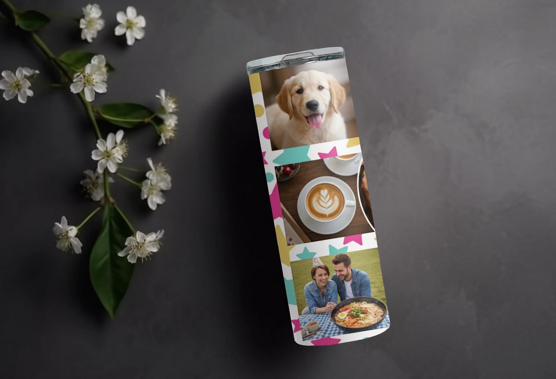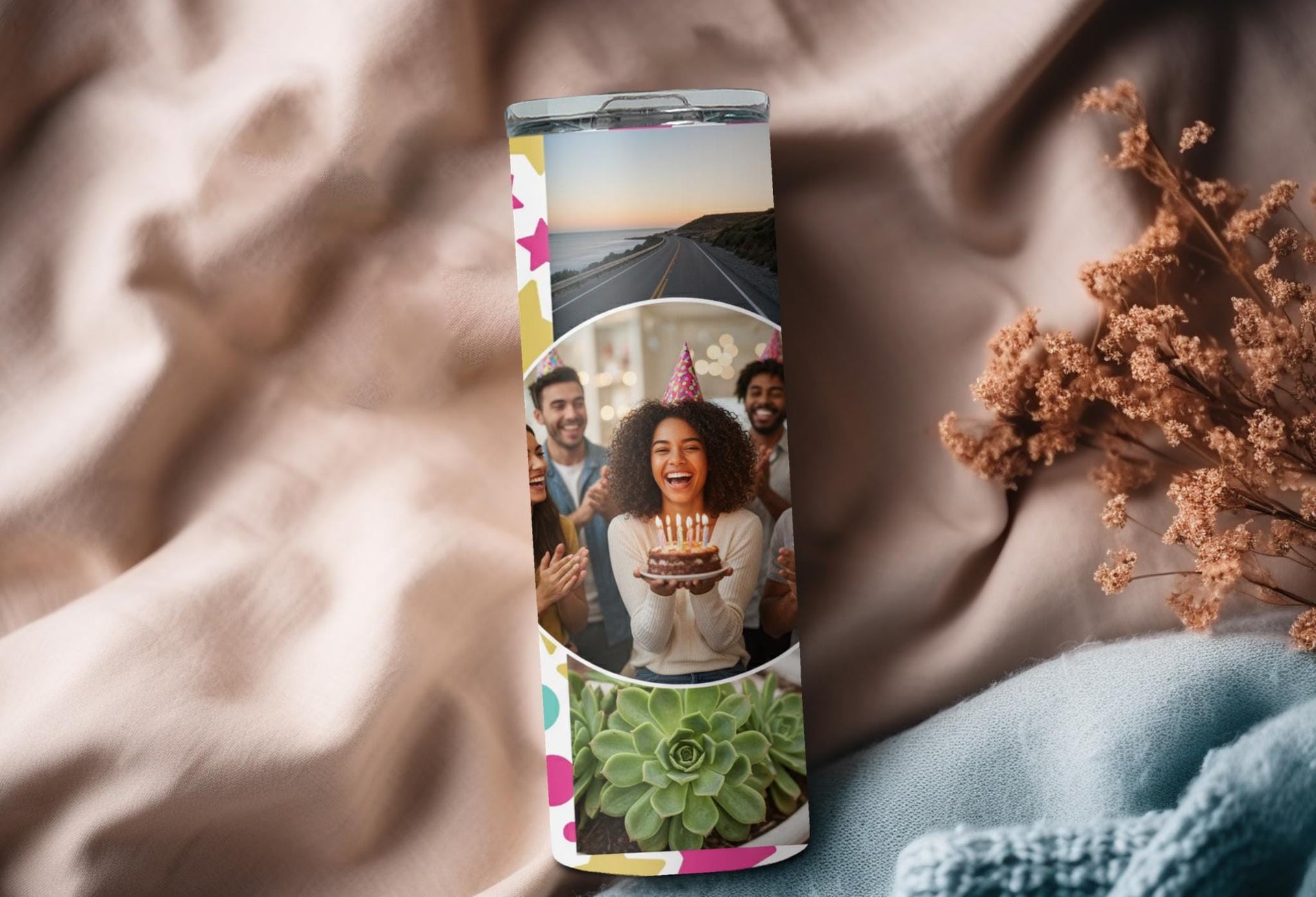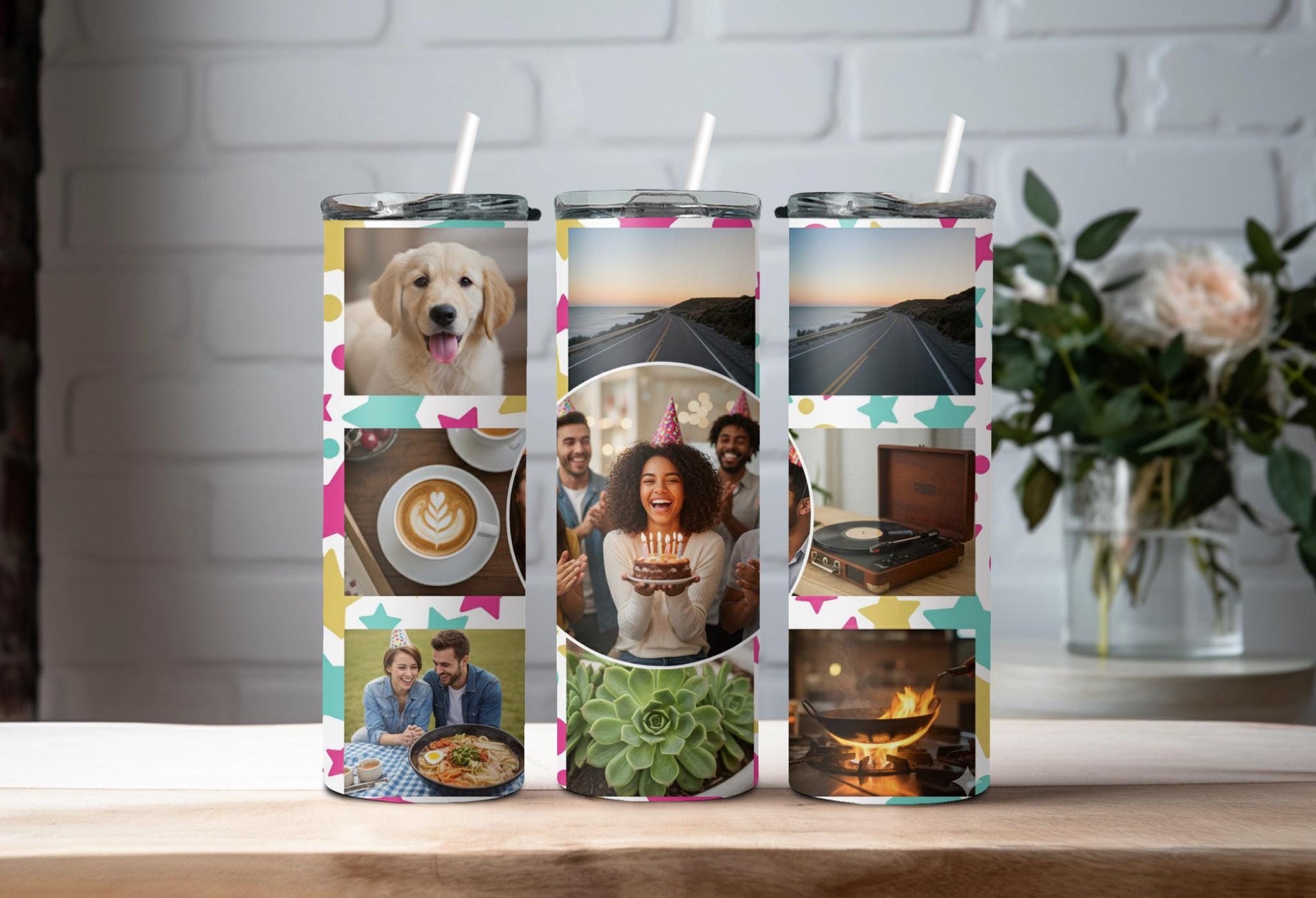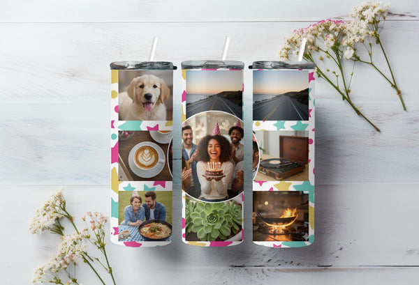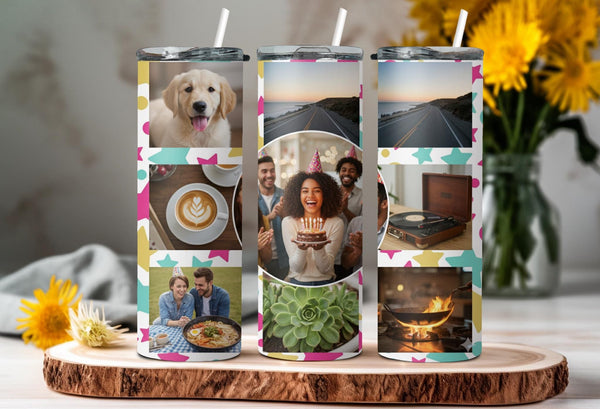 Experience the vibrant memories every time you take a sip from our Customizable Photo Collage Tumbler! Featuring a colorful design and space for 9 personal photos, keep your drinks hot for up to 6 hours and cold for up to 24. Personalize with a name for the perfect touch. Cheers to lasting memories!