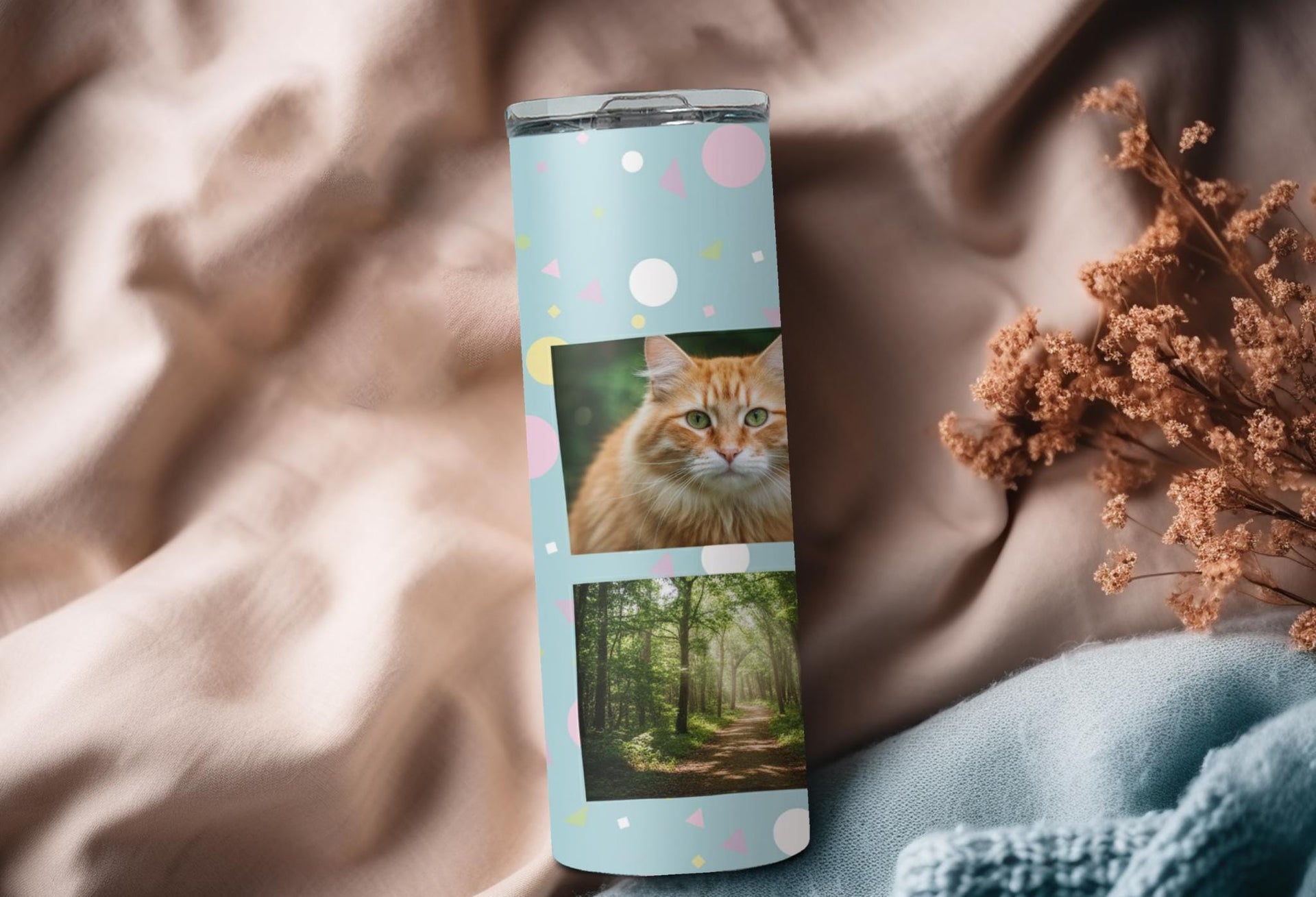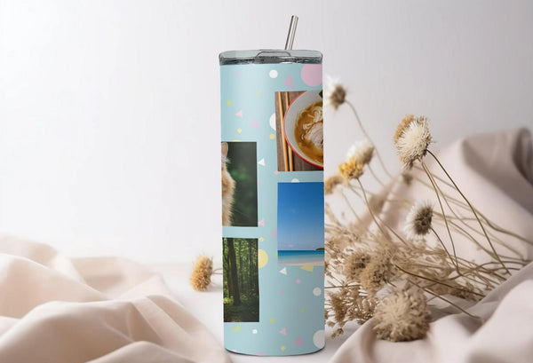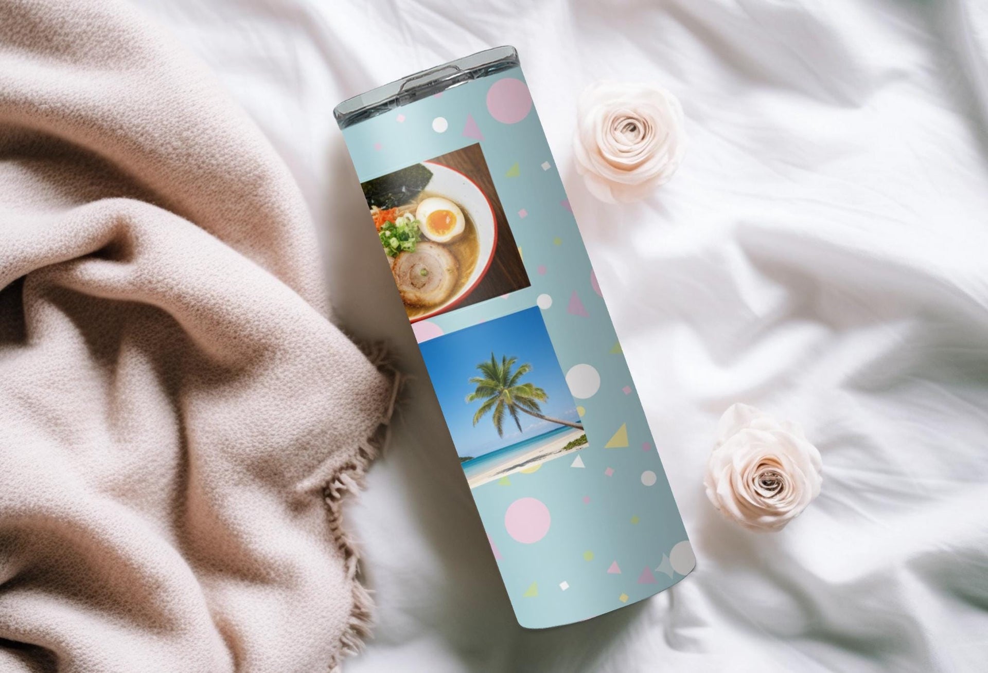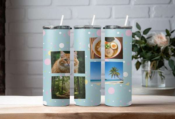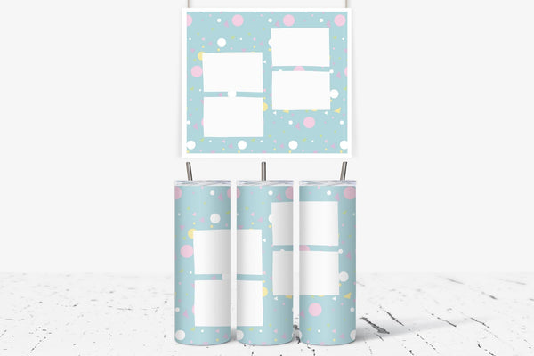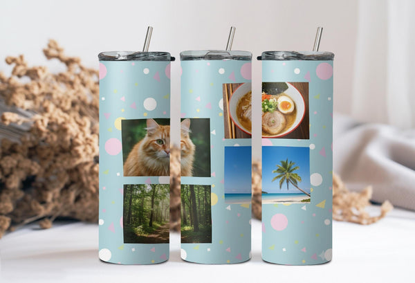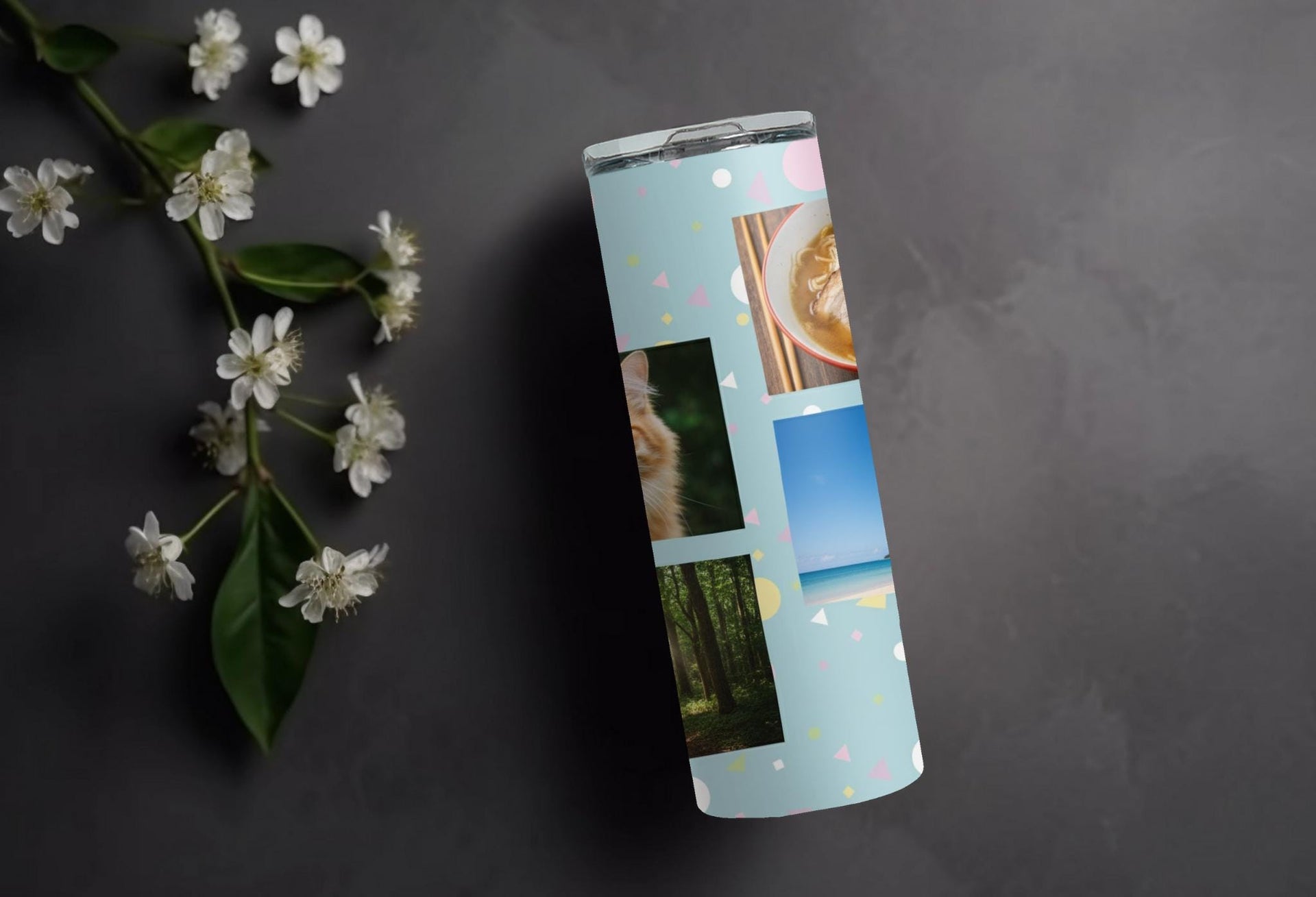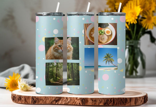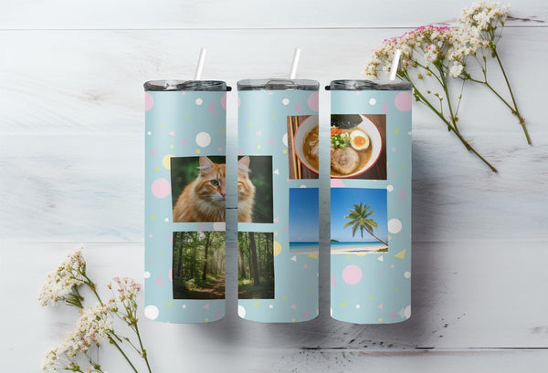 Stay hydrated in style with our Pastel Geometric Pattern Photo Tumbler! Featuring a light blue background with soft pastel shapes, this tumbler also has 4 spaces for your favorite photos. Keep your drink hot for up to 6 hours or cold for up to 24 hours. Personalize with a name for the perfect gift.