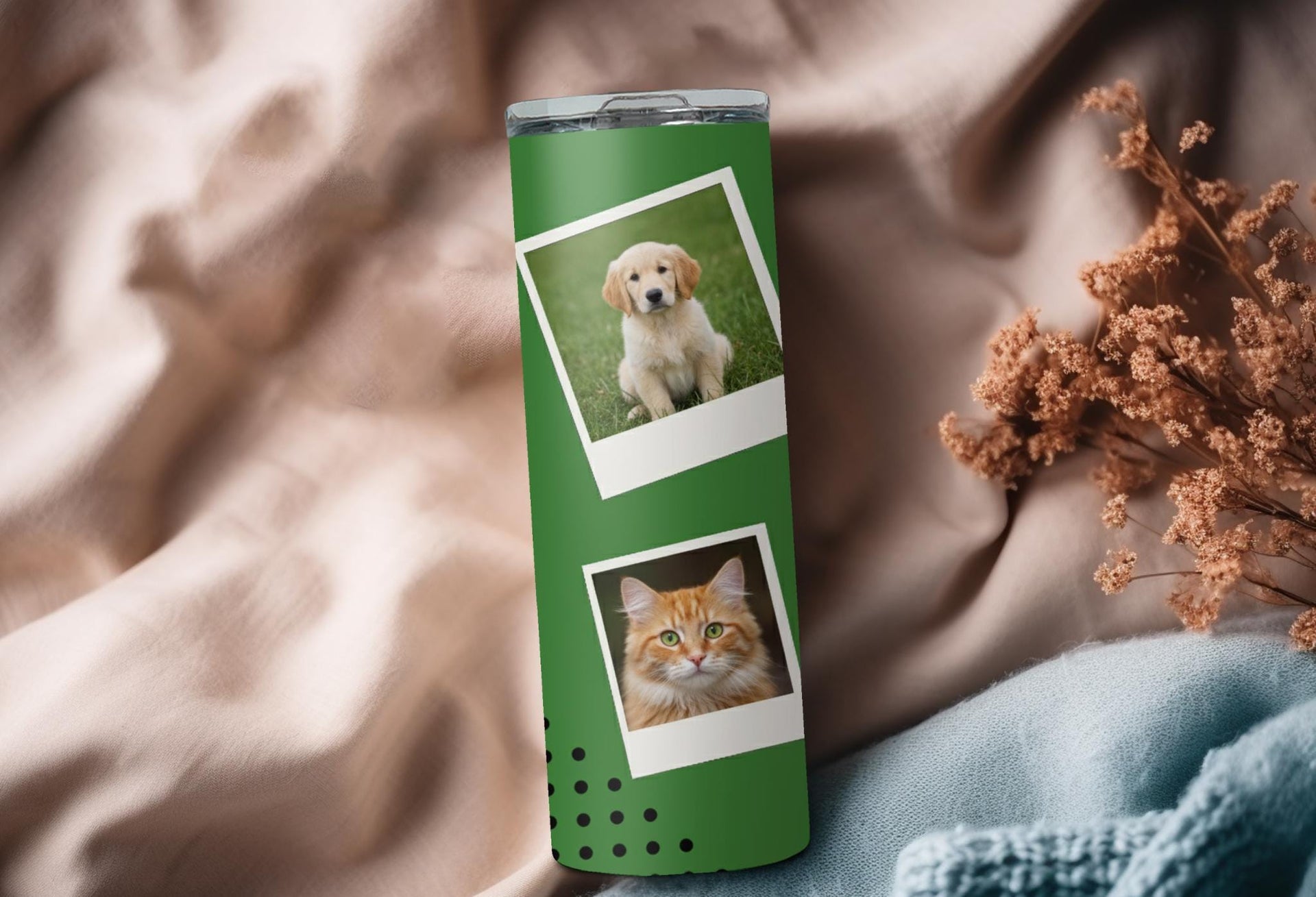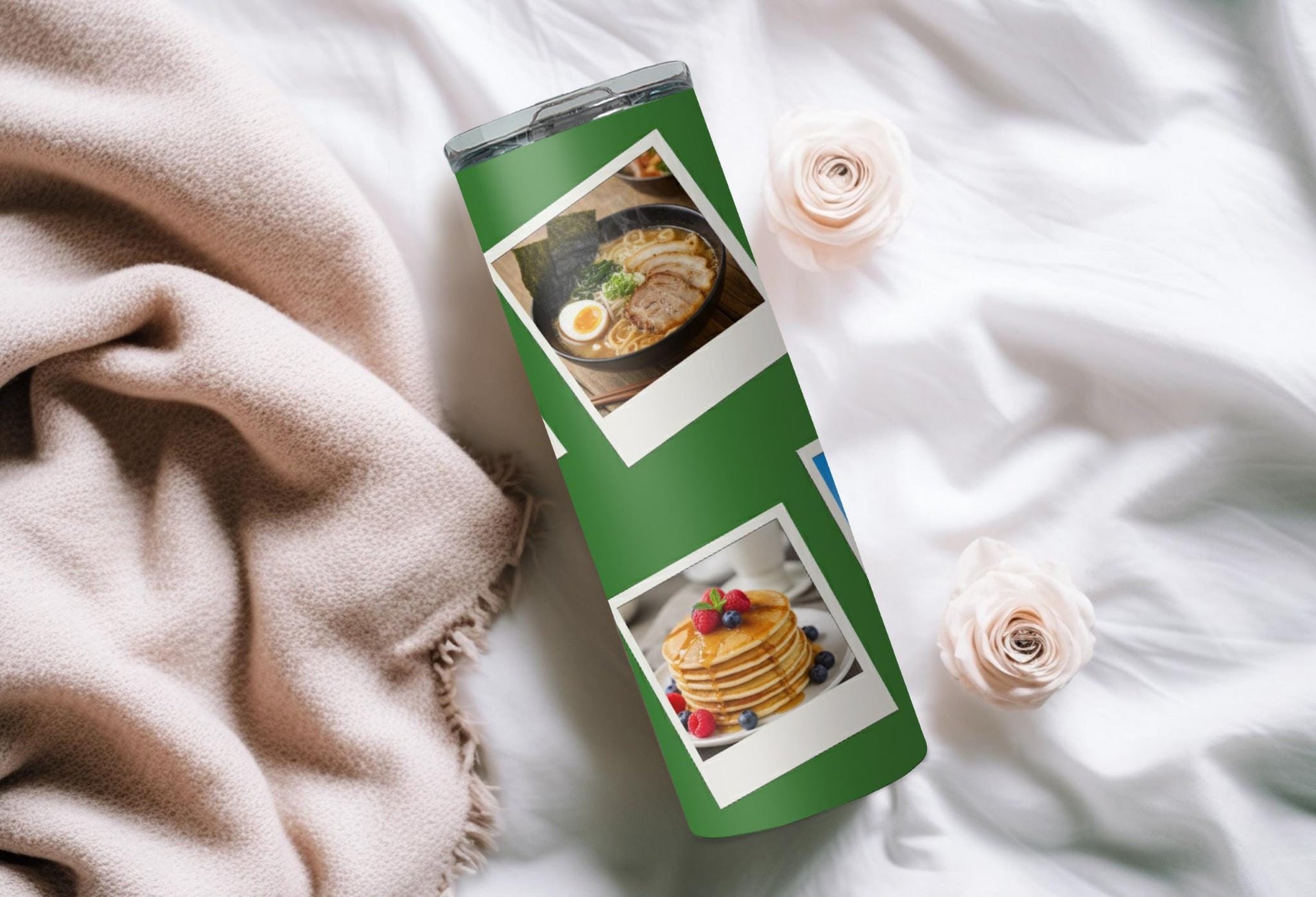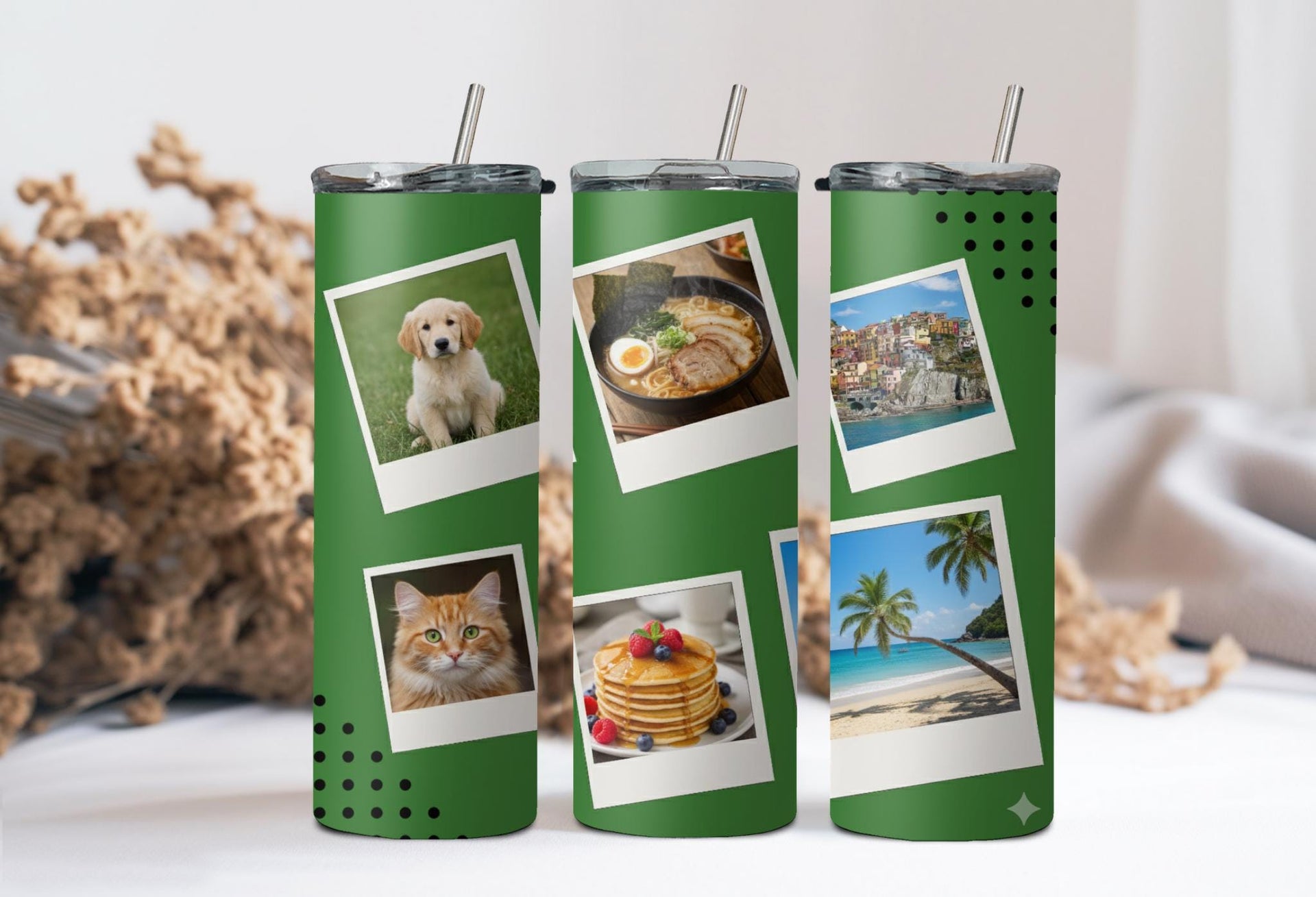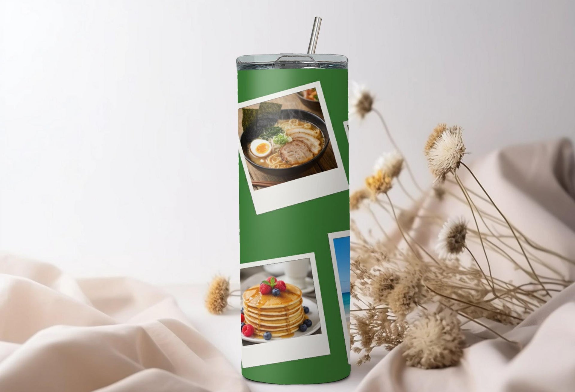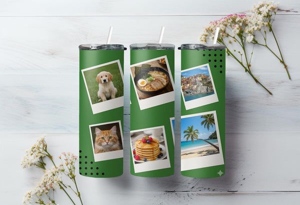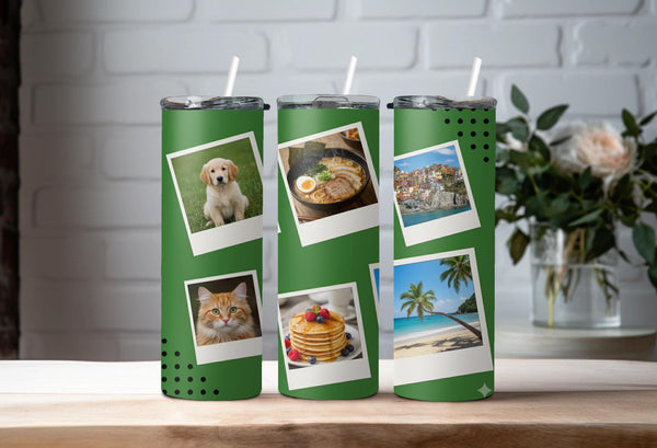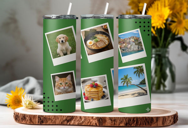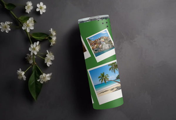 Create a custom tumbler to go with your every adventure! Our green tumbler with six photo spaces keeps drinks hot for up to 6 hours and cold for up to 24 hours. Personalize it with a name for a meaningful touch. Go ahead, take it with you and make every moment picture-perfect!