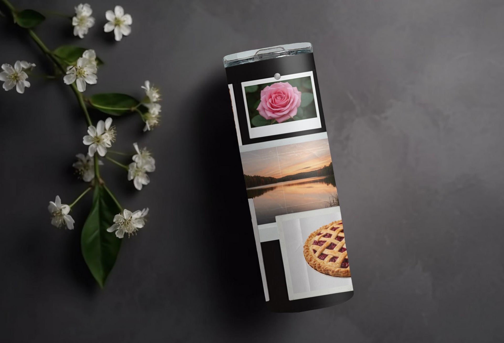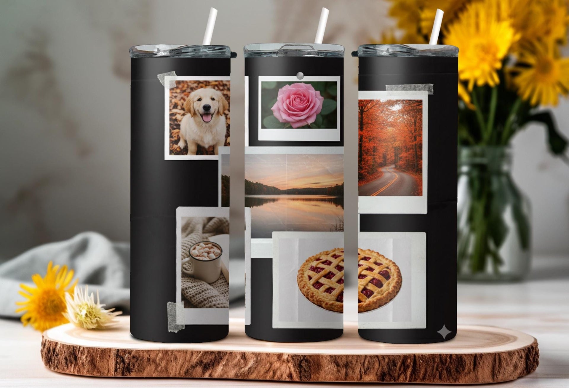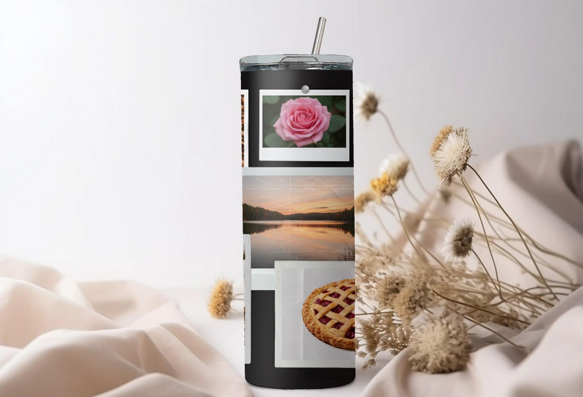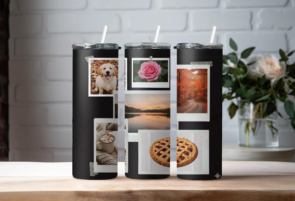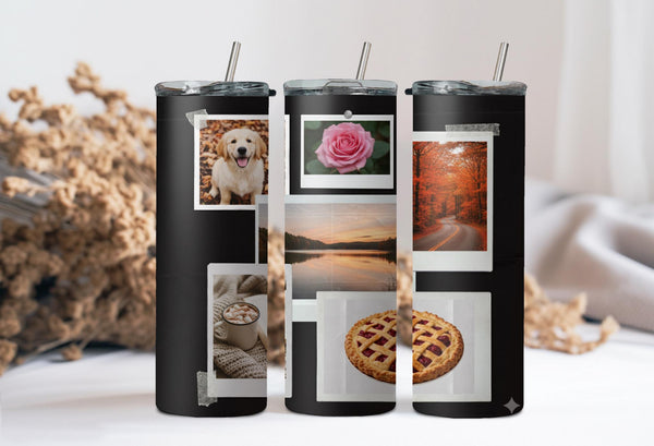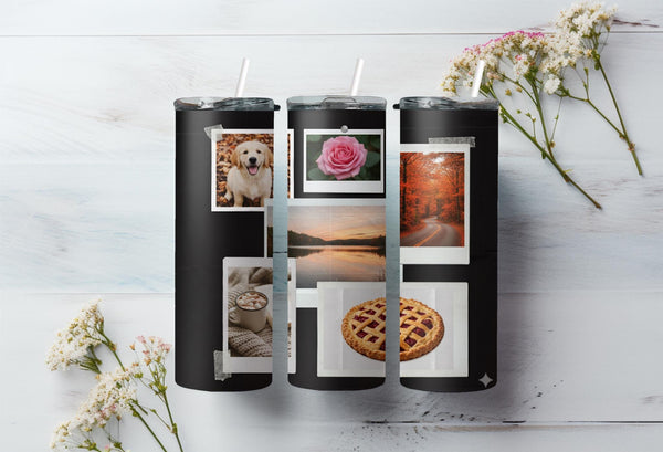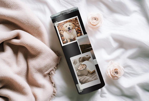 Relive your cherished moments on the go with Capture & Carry: Your Custom Photo Tumbler. Featuring a sleek black and white design, this tumbler has 6 gray spaces for your favorite photos. Keep your drinks hot for up to 6 hours or cold for up to 24 hours. Make it even more special by personalizing it with a name!