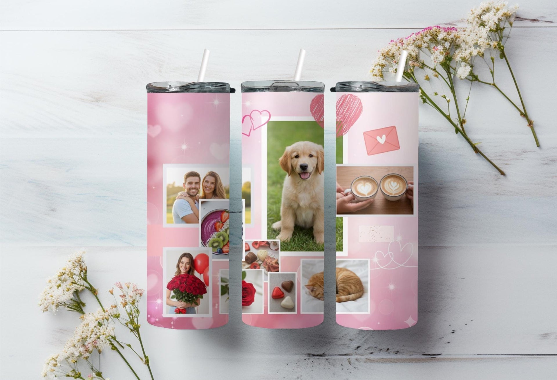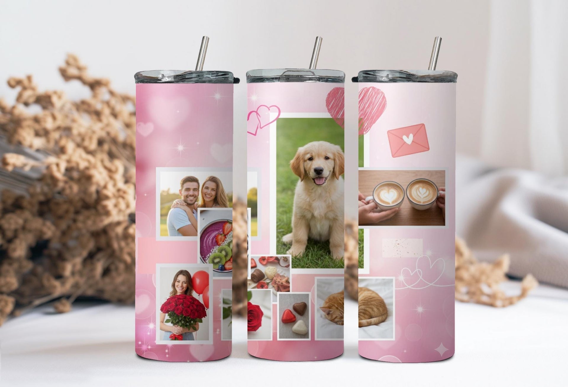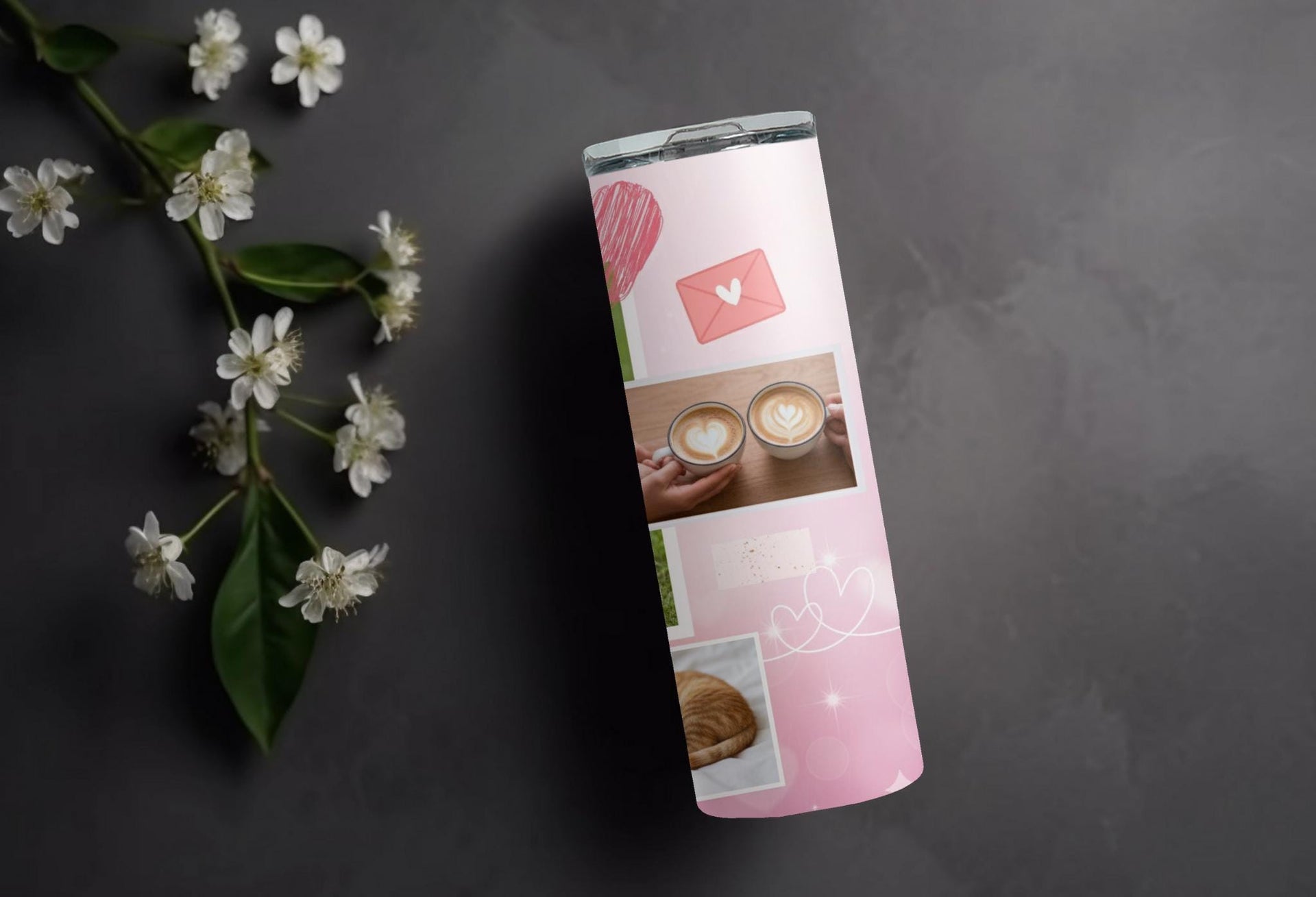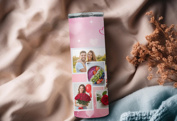 This elegant tumbler features a soft gradient of pink hues, creating a dreamy and affectionate ambiance. The design includes multiple blank spaces for personal photos and can be personalized with a name. Enjoy your favorite beverage hot for up to 6 hours or cold for up to 24 hours!