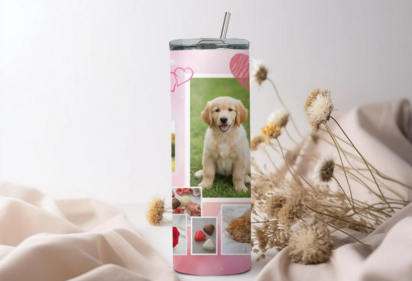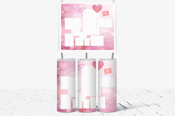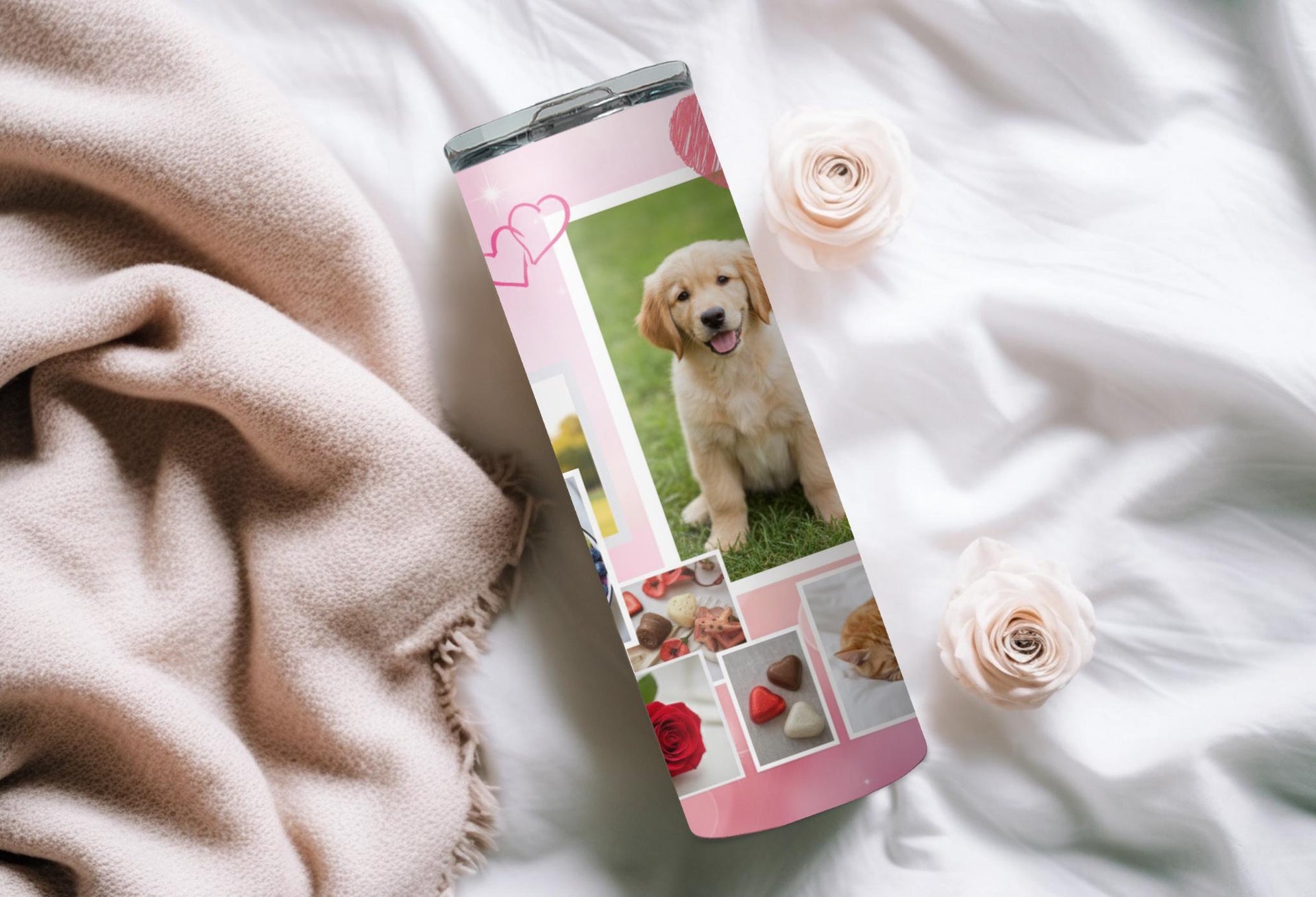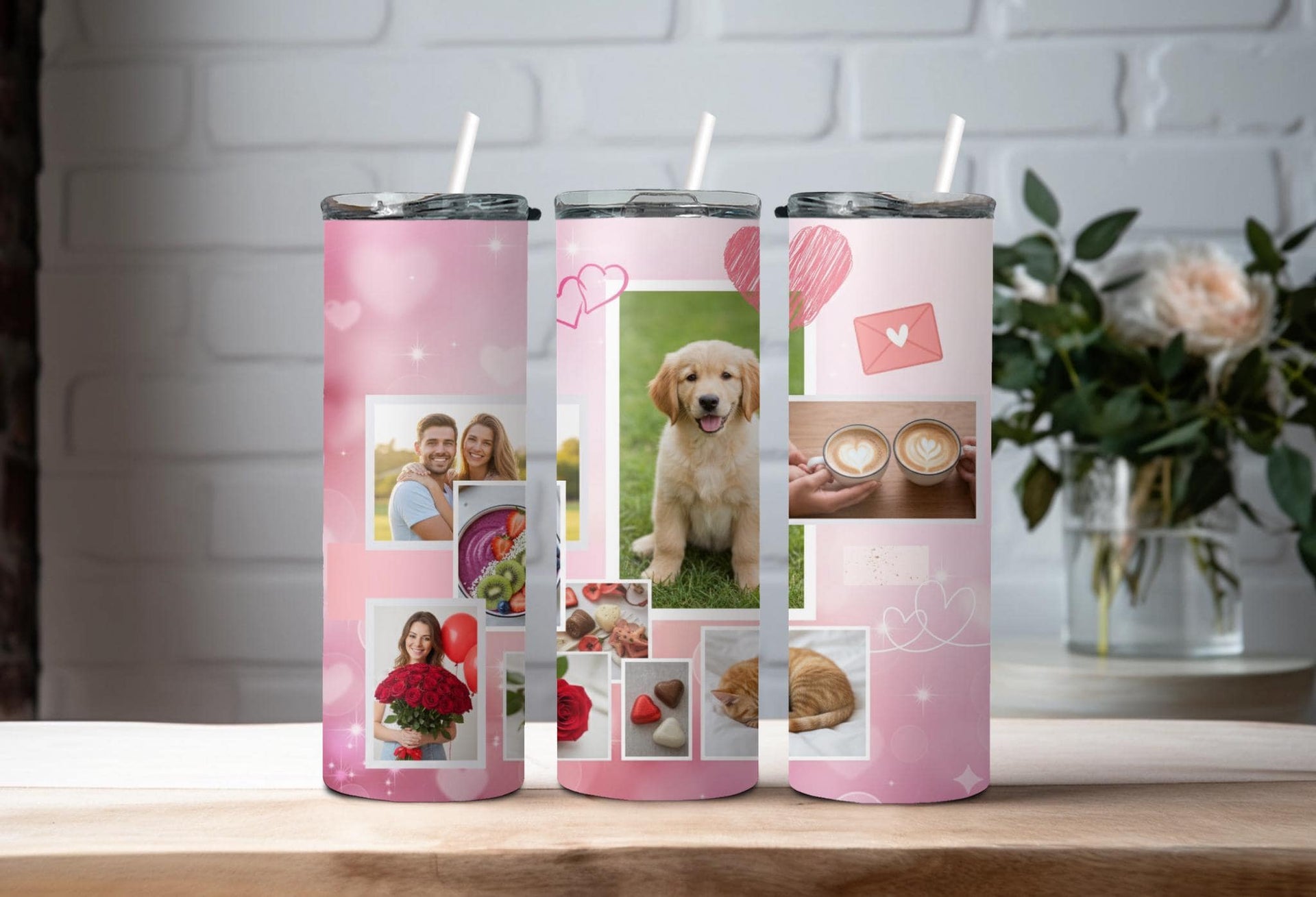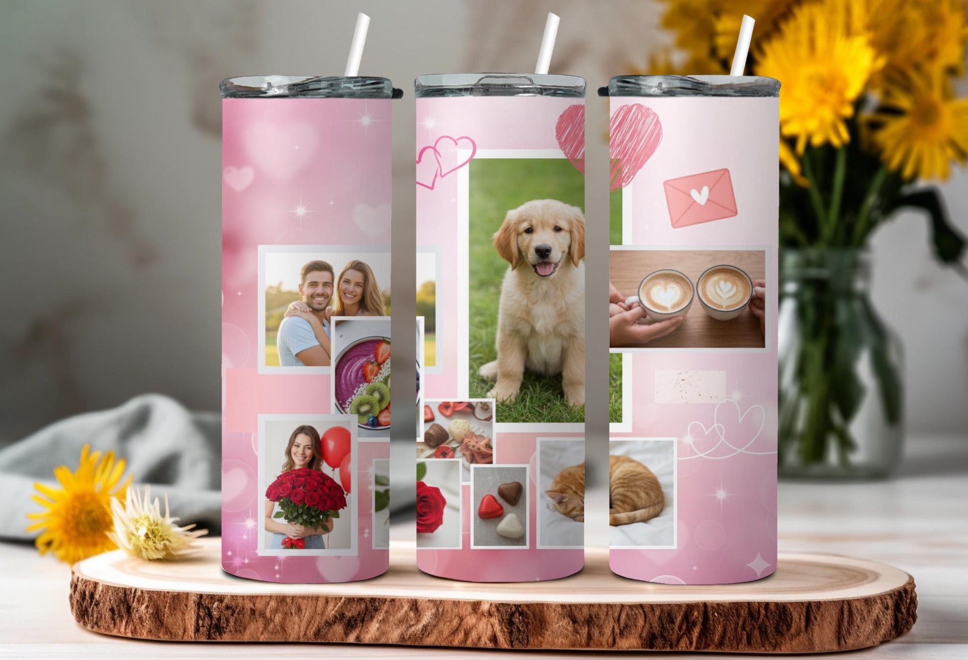 This elegant tumbler features a soft gradient of pink hues, creating a dreamy and affectionate ambiance. The design includes multiple blank spaces for personal photos and can be personalized with a name. Enjoy your favorite beverage hot for up to 6 hours or cold for up to 24 hours!