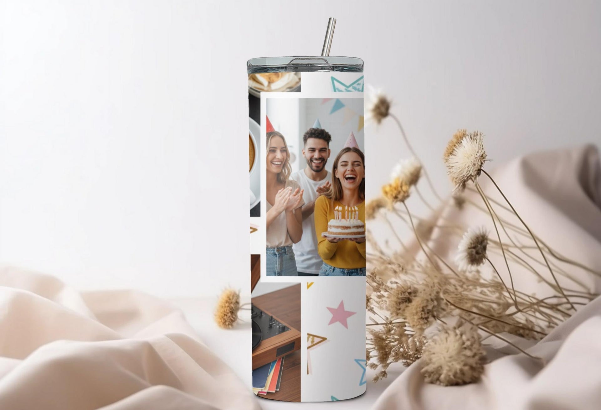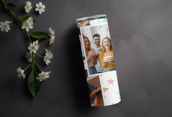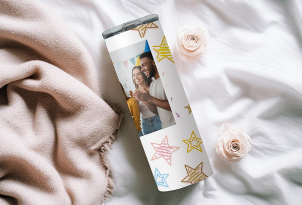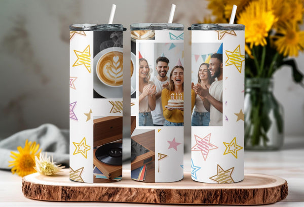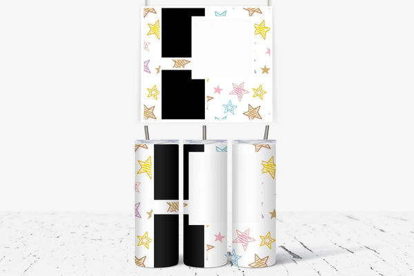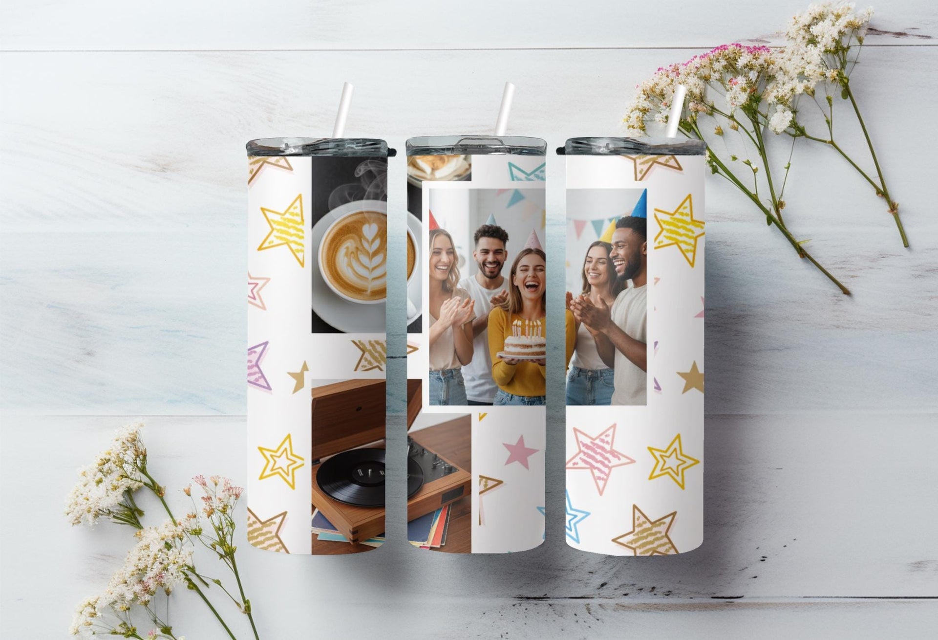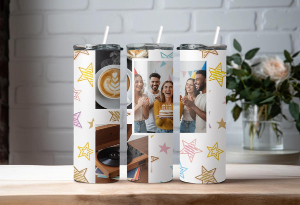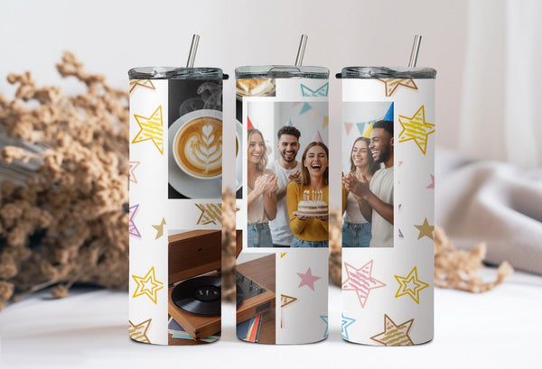 Elevate your daily routine with our Colorful Star Pattern Photo Tumbler! The vibrant and playful design features multicolored stars in unique patterns, surrounded by 2 black spaces and 1 white space for your favorite photos. Keep your drinks hot for 6 hours and cold for 24 hours. Personalize it with a name and make this tumbler truly yours!
