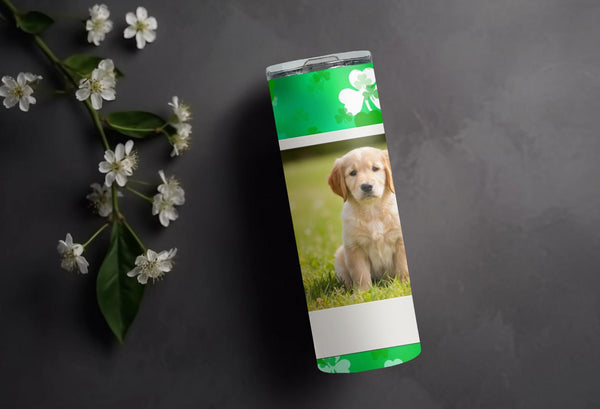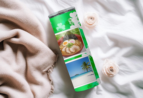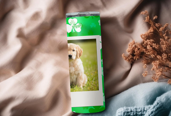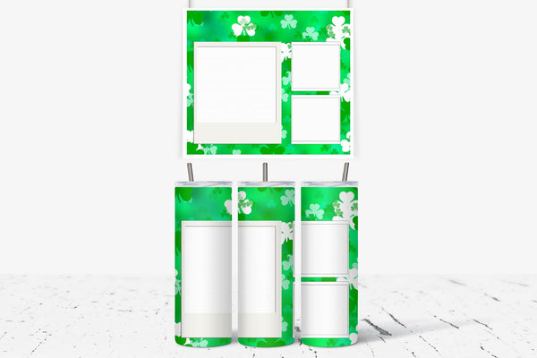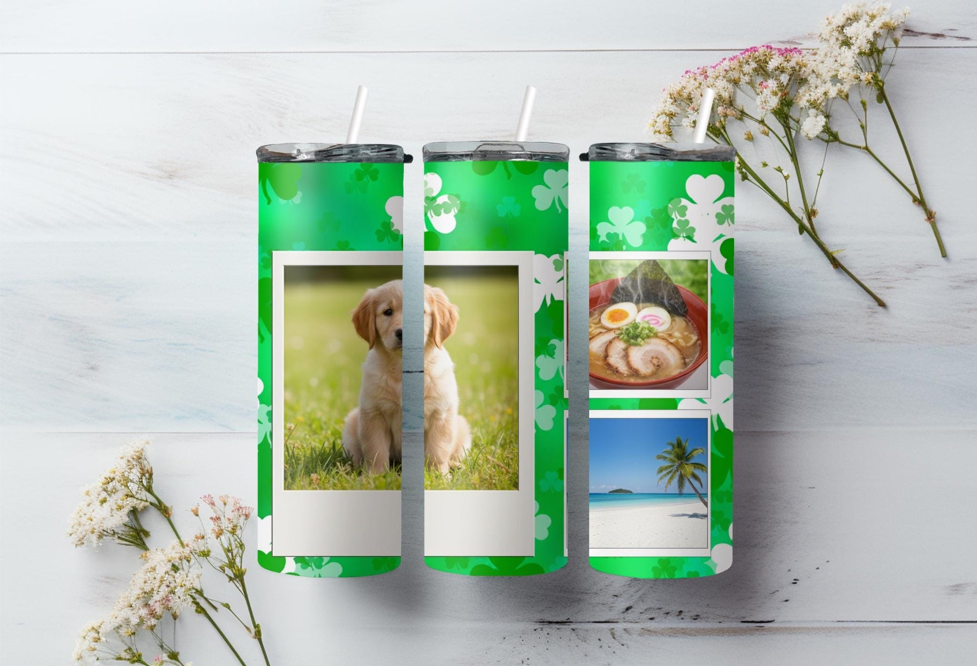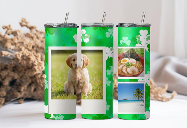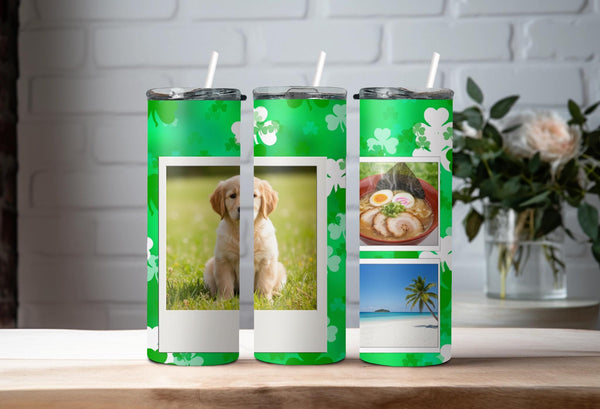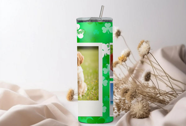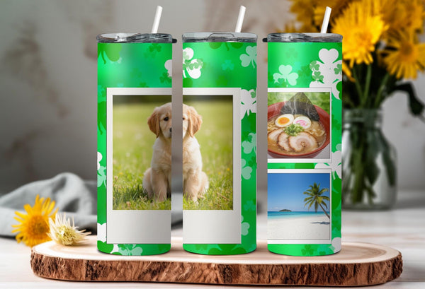 Celebrate the luck of the Irish with our Shamrock-Themed Photo Tumbler! Adorned with vibrant shamrocks, this tumbler features 3 photo spaces and keeps drinks hot for up to 6 hours and cold for up to 24 hours. Personalize it with a name for a unique touch. Cheers to the perfect St. Patrick's Day accessory!
