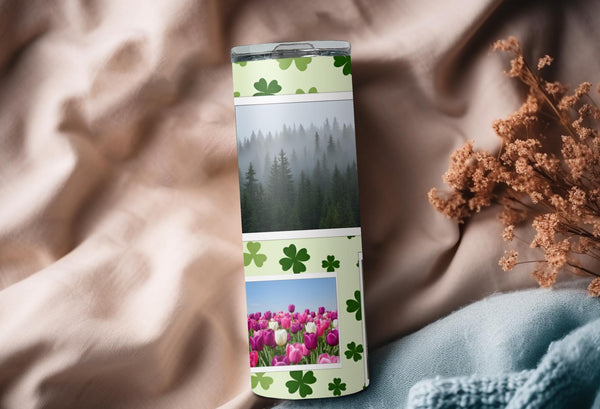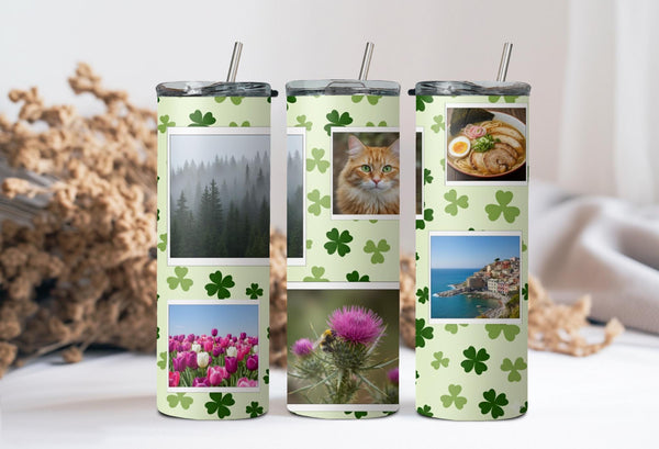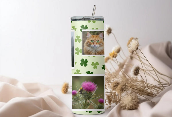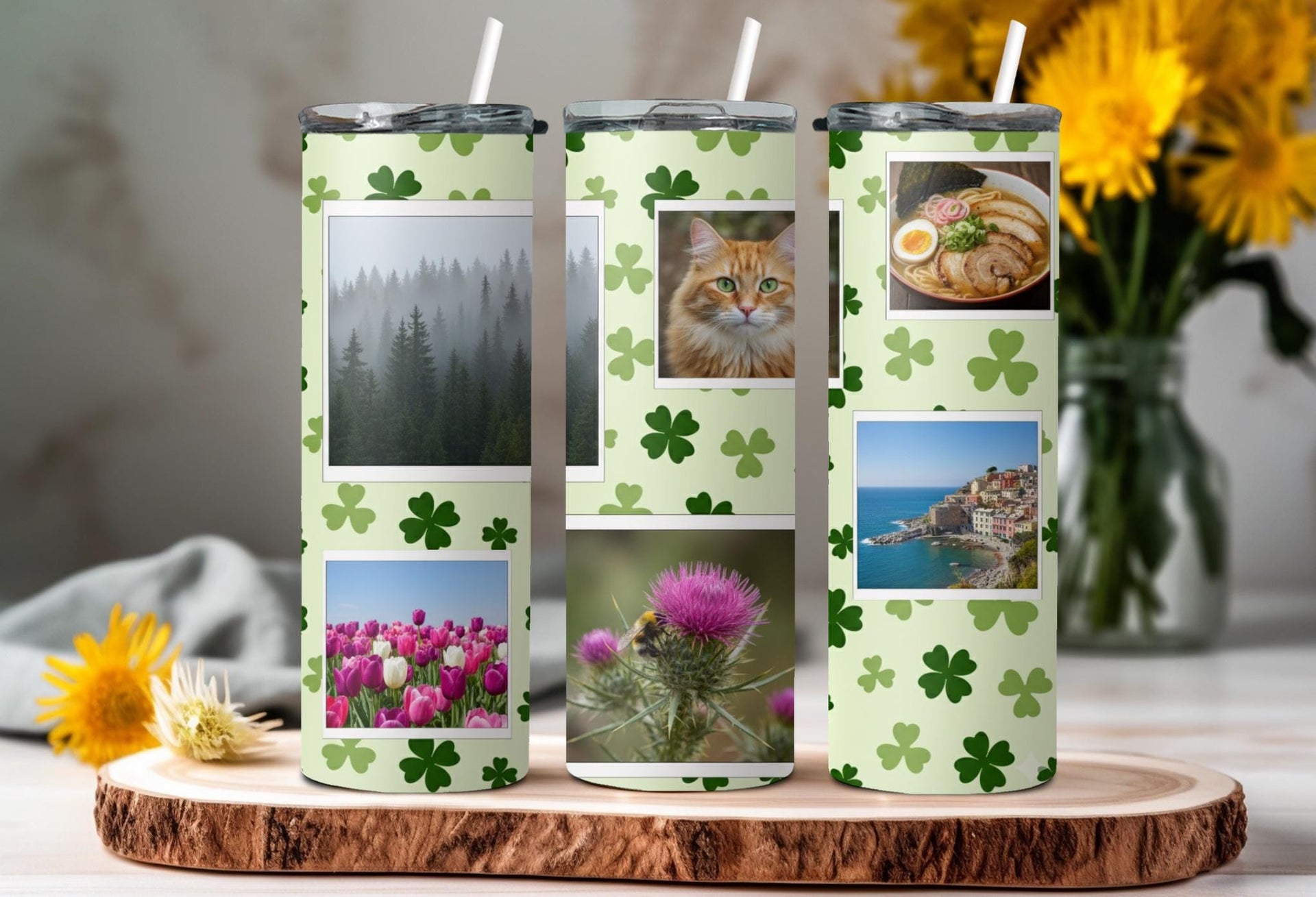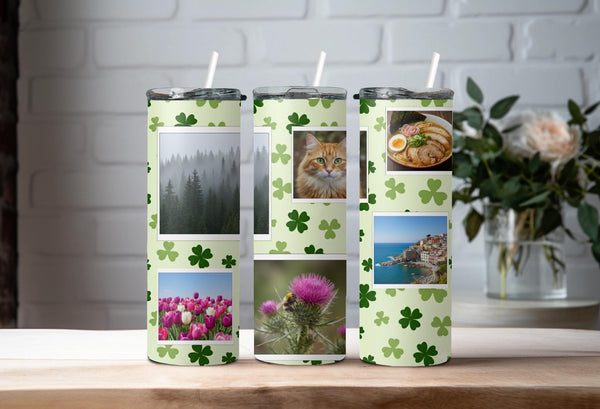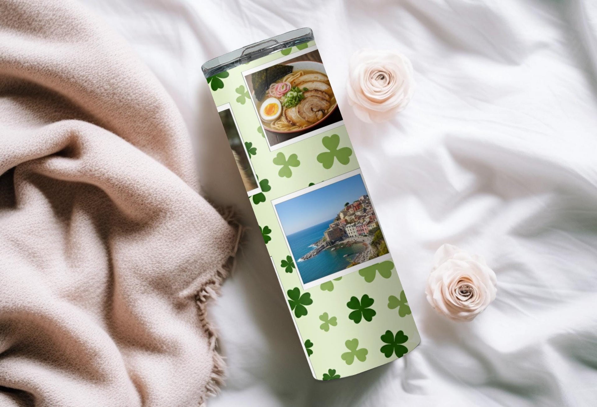 Celebrate St. Patrick's Day with our Clover Photo Tumbler! Adorned with a pattern of green clovers on a light green background, this tumbler holds hot drinks for up to 6 hours and cold drinks for up to 24 hours. Personalize it with a name and add up to 6 photos to make it a unique and cherished gift. Cheers to lasting memories!