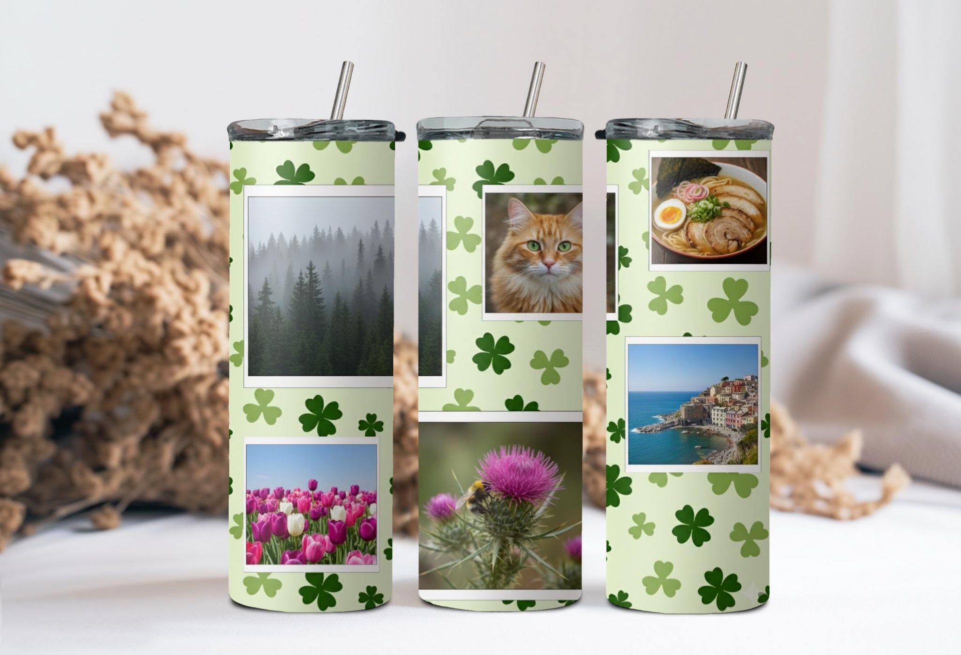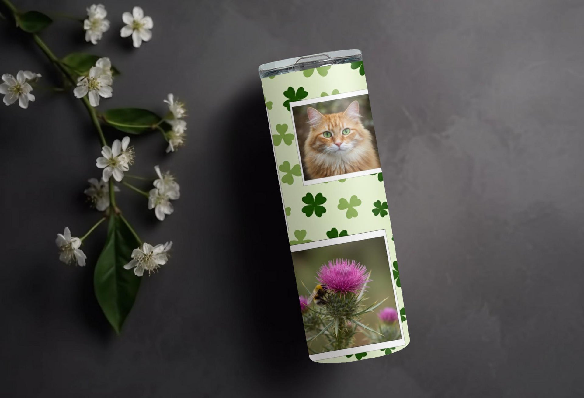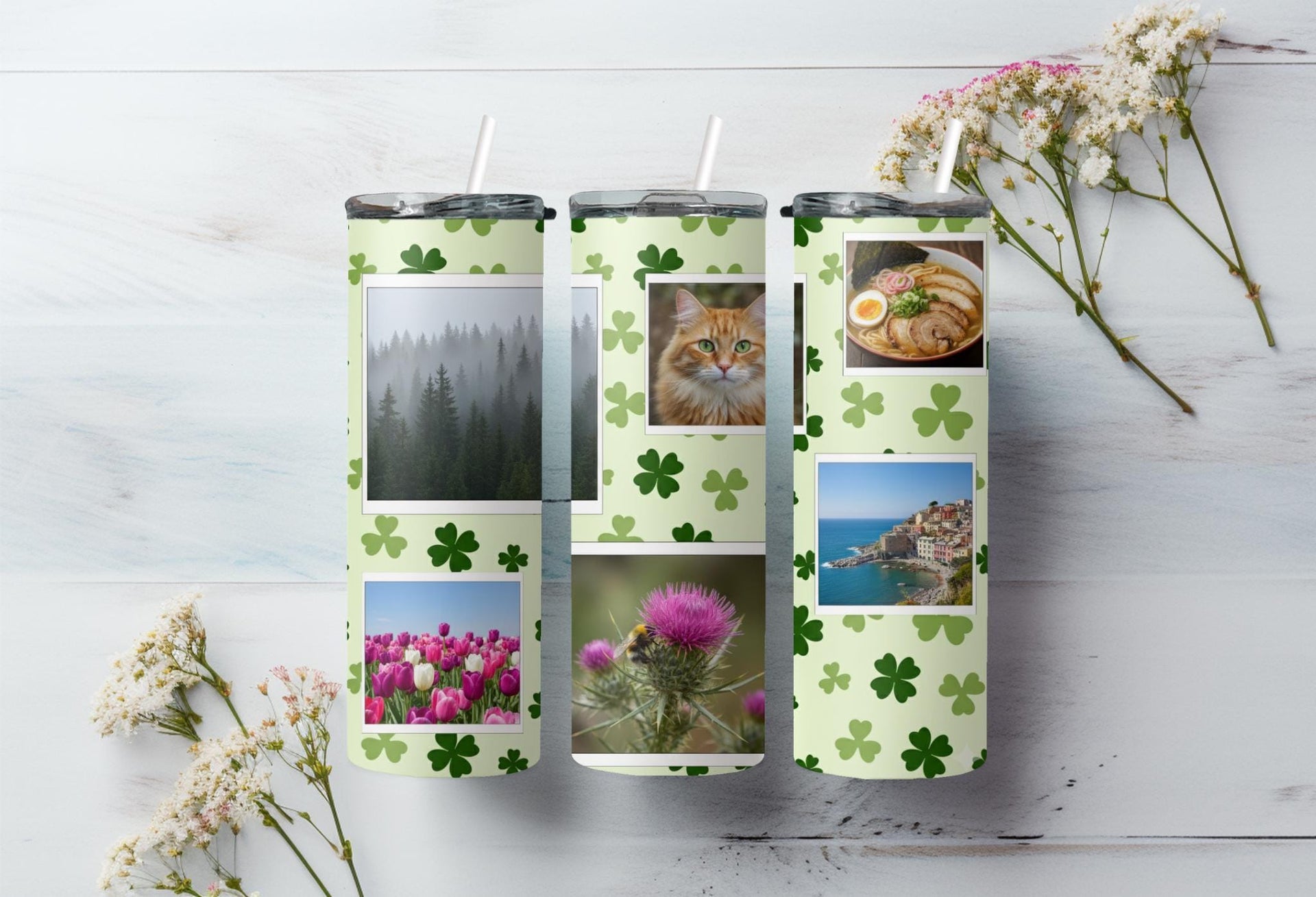 Celebrate St. Patrick's Day with our Clover Photo Tumbler! Adorned with a pattern of green clovers on a light green background, this tumbler holds hot drinks for up to 6 hours and cold drinks for up to 24 hours. Personalize it with a name and add up to 6 photos to make it a unique and cherished gift. Cheers to lasting memories!