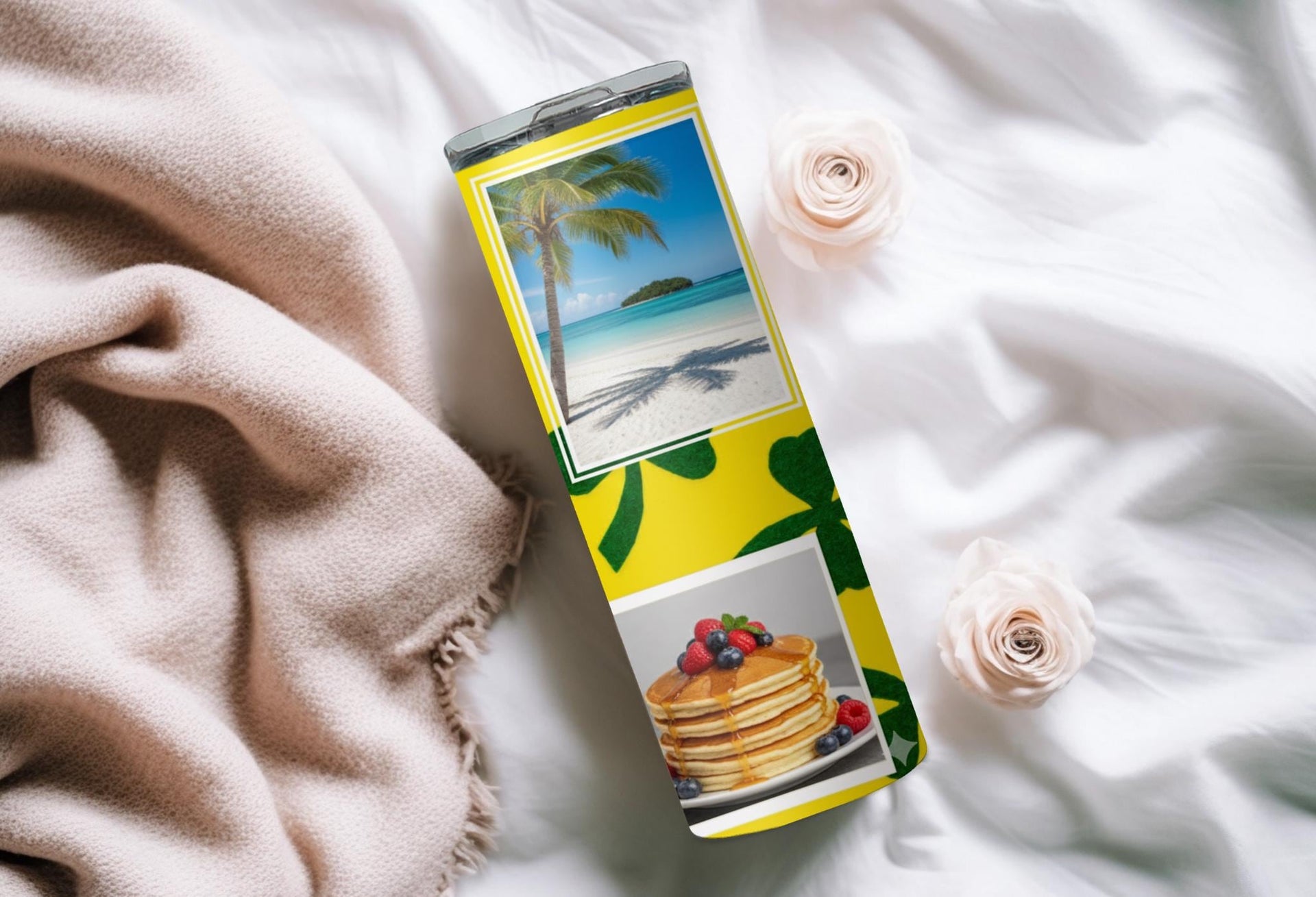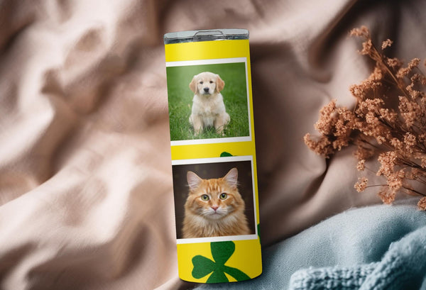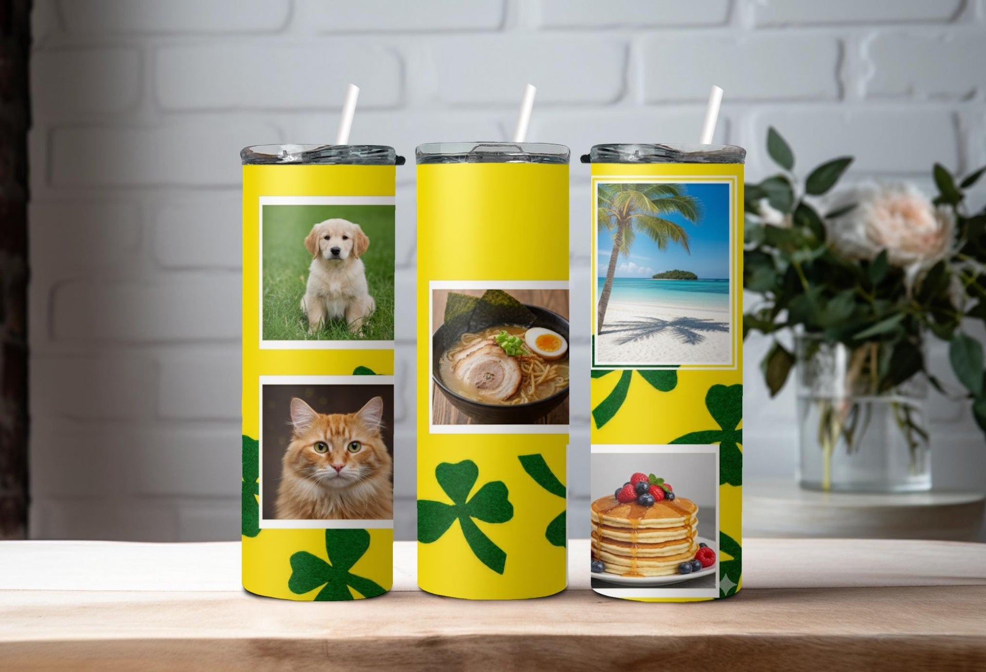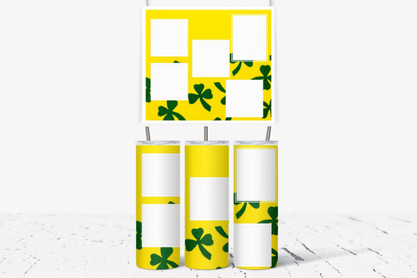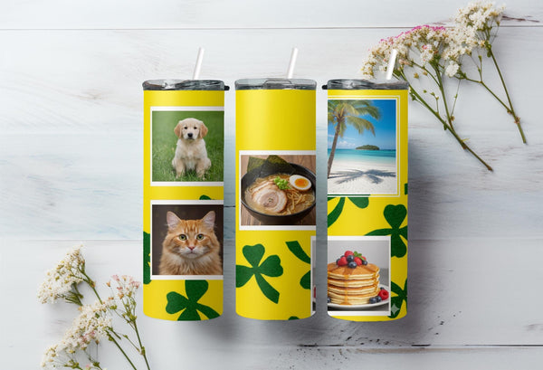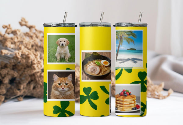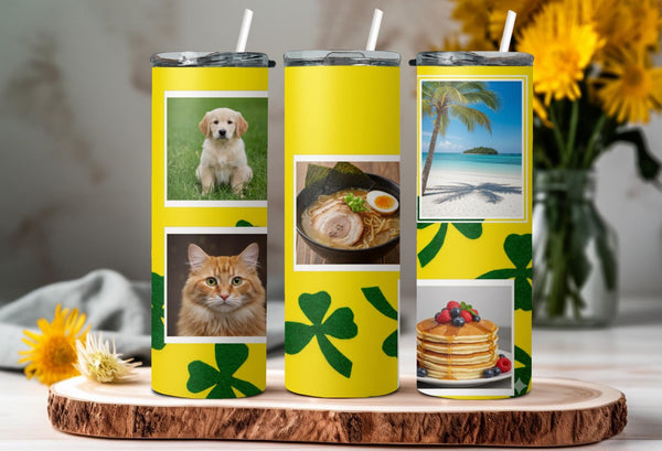 Get ready to celebrate St. Patrick's Day in style with our vibrant yellow tumbler! Adorned with green shamrocks and 5 white spaces for photos, this tumbler is perfect for keeping your drinks hot for up to 6 hours or cold for up to 24 hours. Plus, you can even personalize it with a name. Cheers to a lucky day!