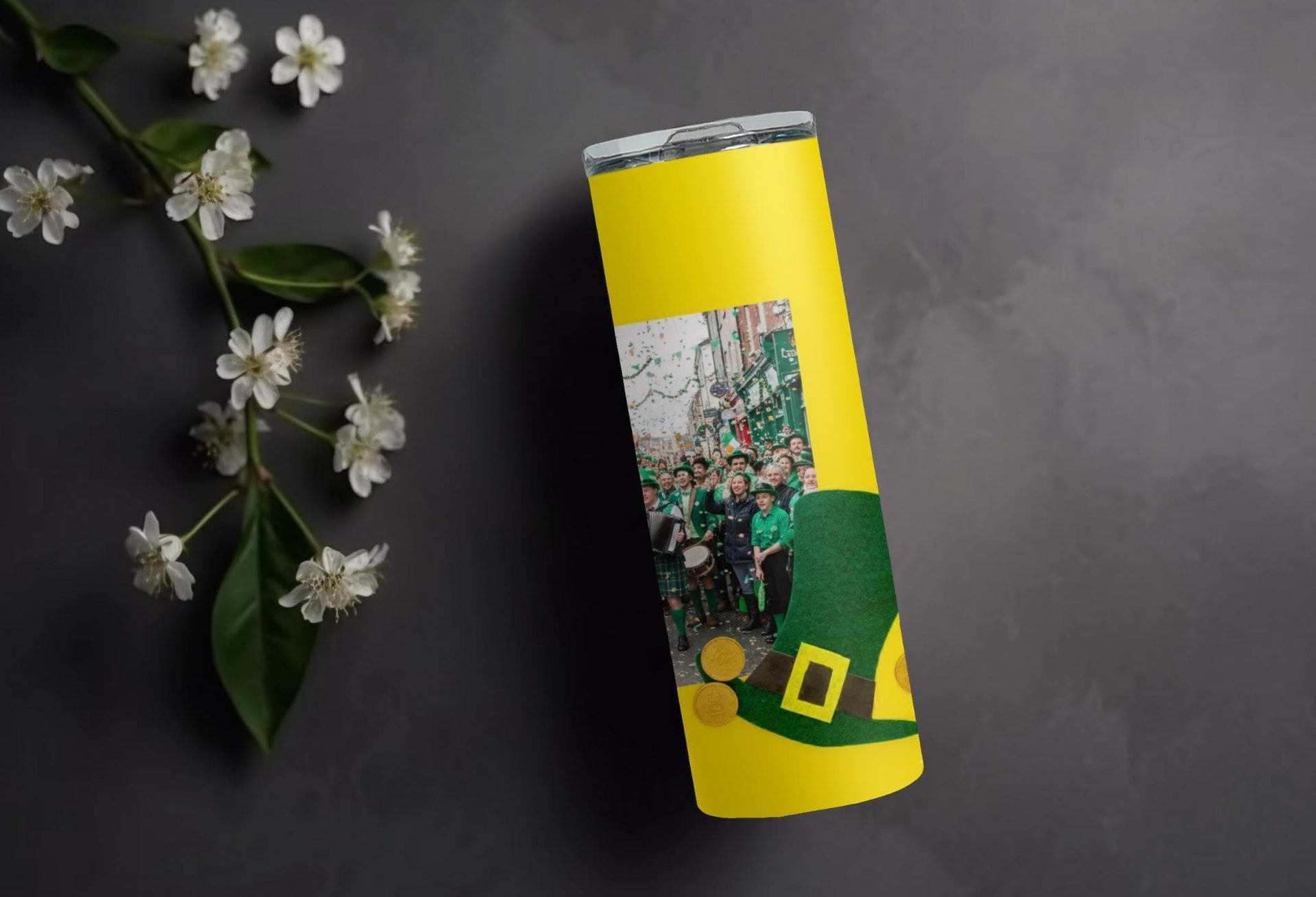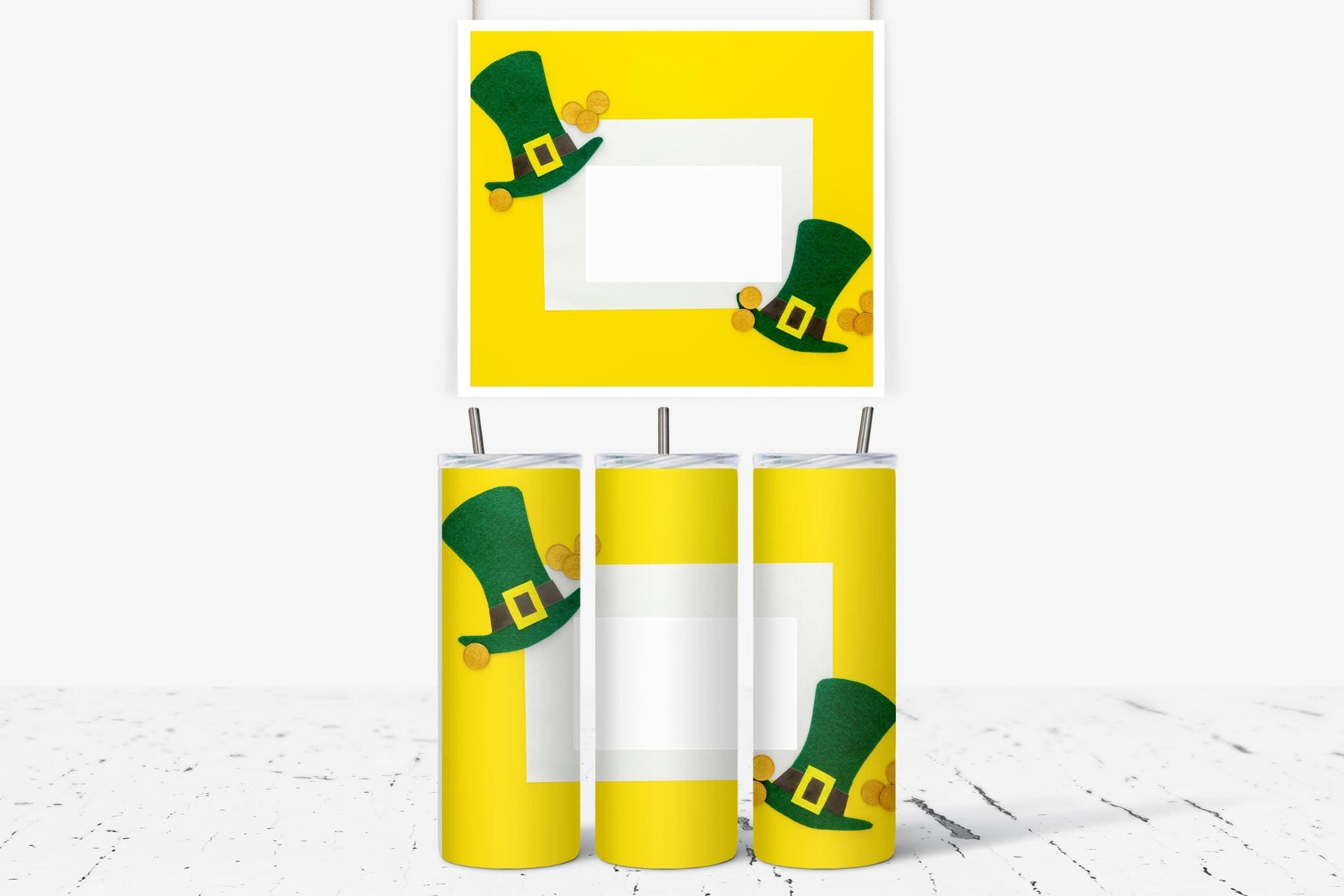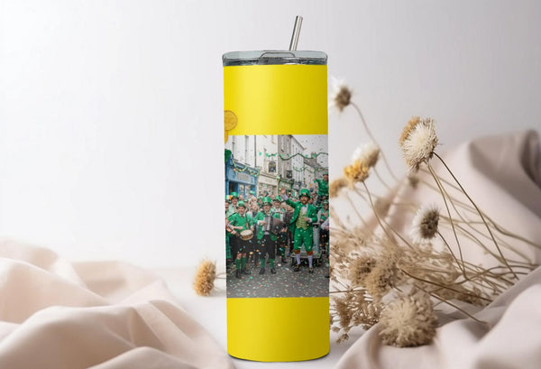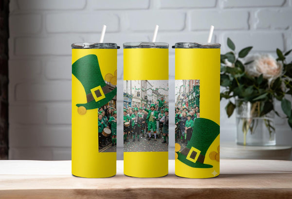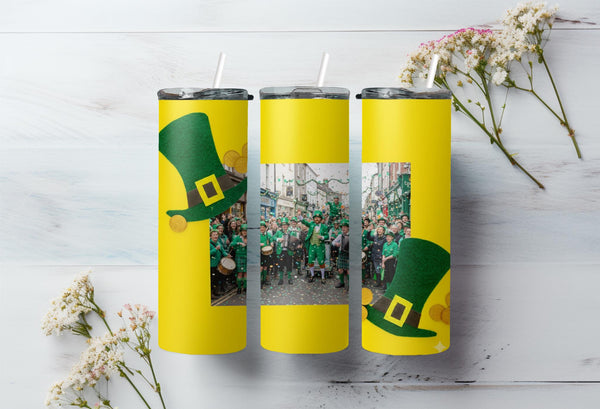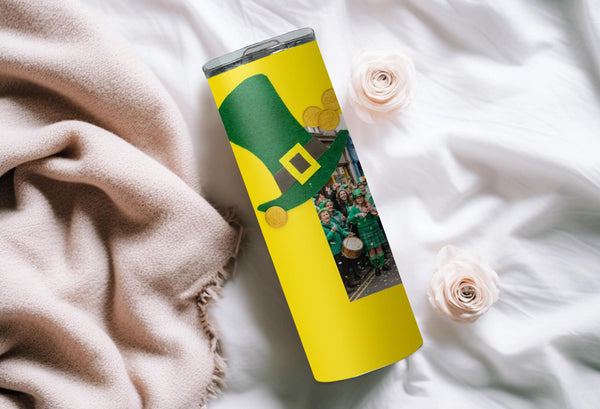 Stay festive and hydrated on St. Patrick's Day with our Leprechaun Hat Photo Tumbler! Adorned with green leprechaun hats, gold buckles, and scattered gold coins, this tumbler features a white space for your personalized photo. Enjoy hot drinks for 6 hours or cold drinks for 24 hours. Perfect for celebrating in style!