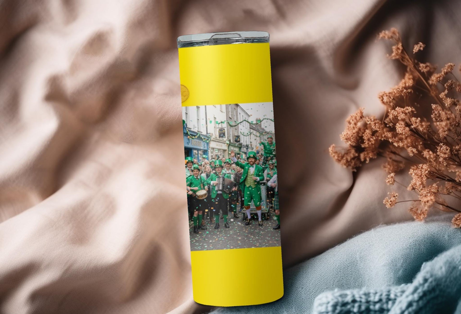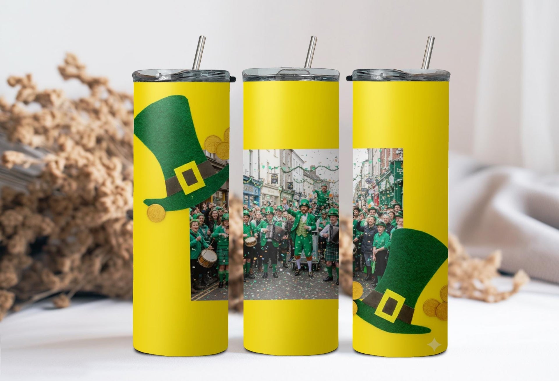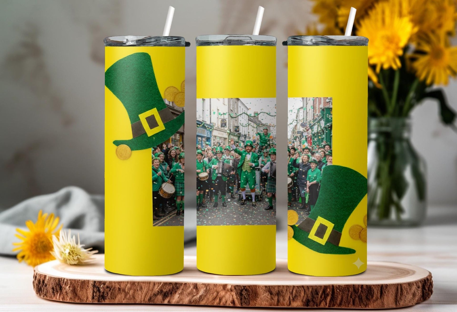 Stay festive and hydrated on St. Patrick's Day with our Leprechaun Hat Photo Tumbler! Adorned with green leprechaun hats, gold buckles, and scattered gold coins, this tumbler features a white space for your personalized photo. Enjoy hot drinks for 6 hours or cold drinks for 24 hours. Perfect for celebrating in style!