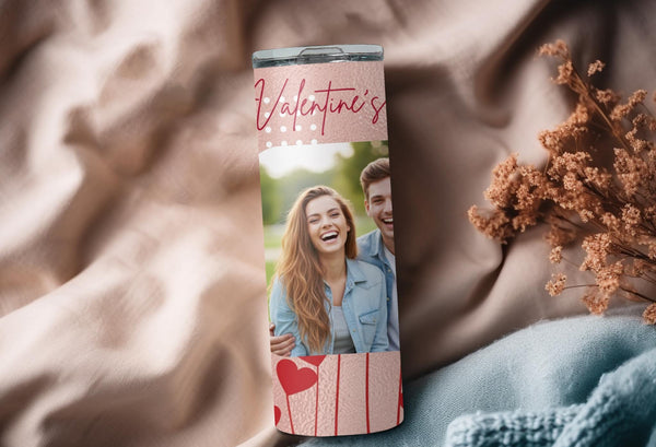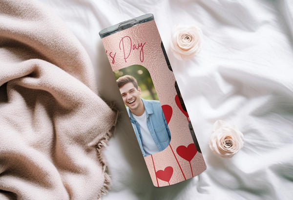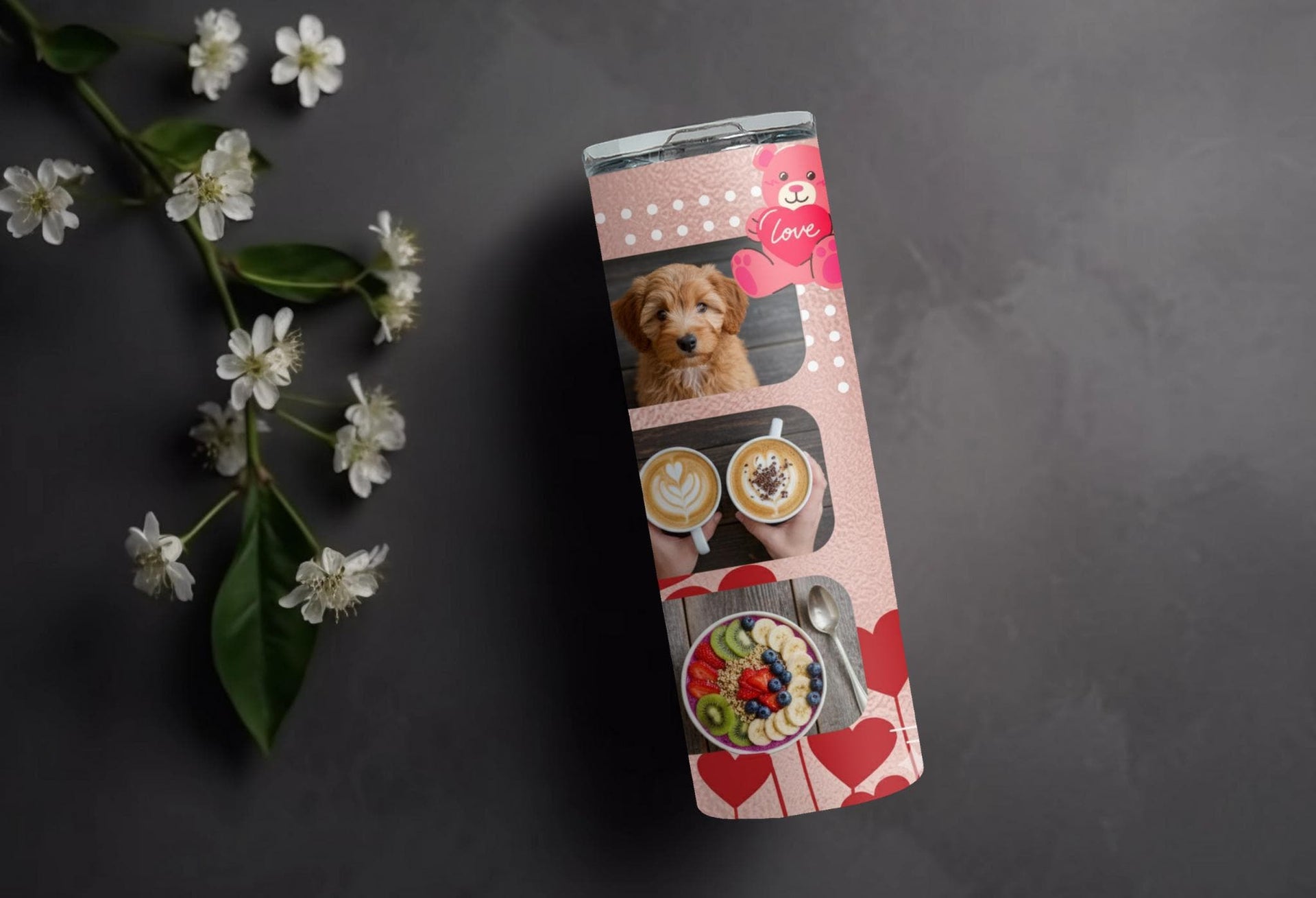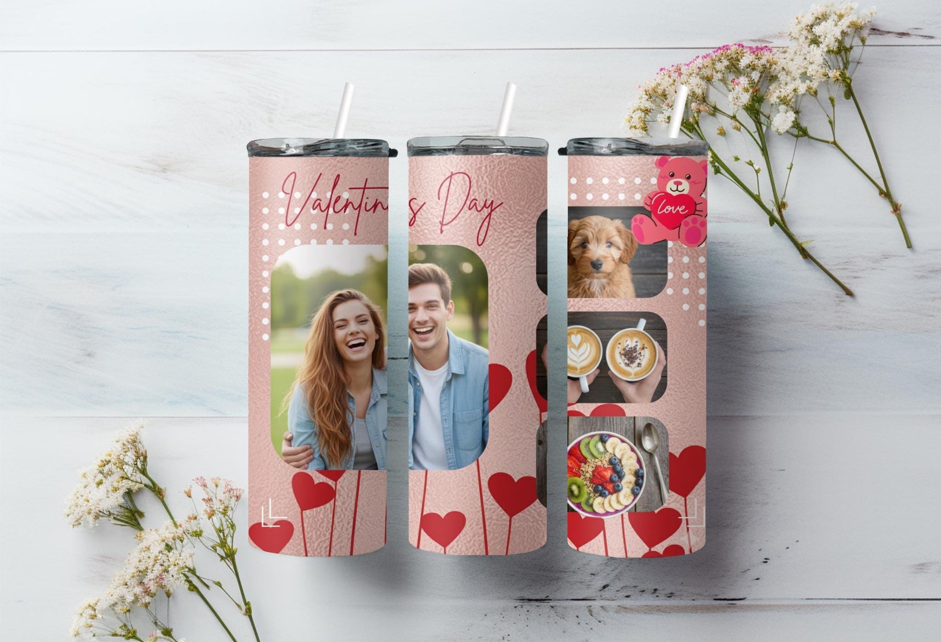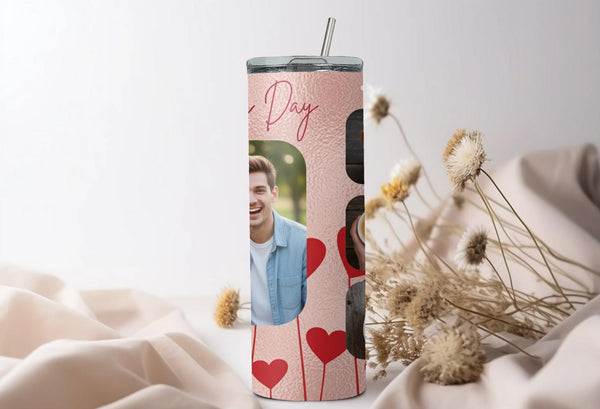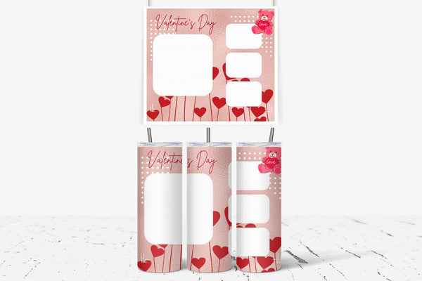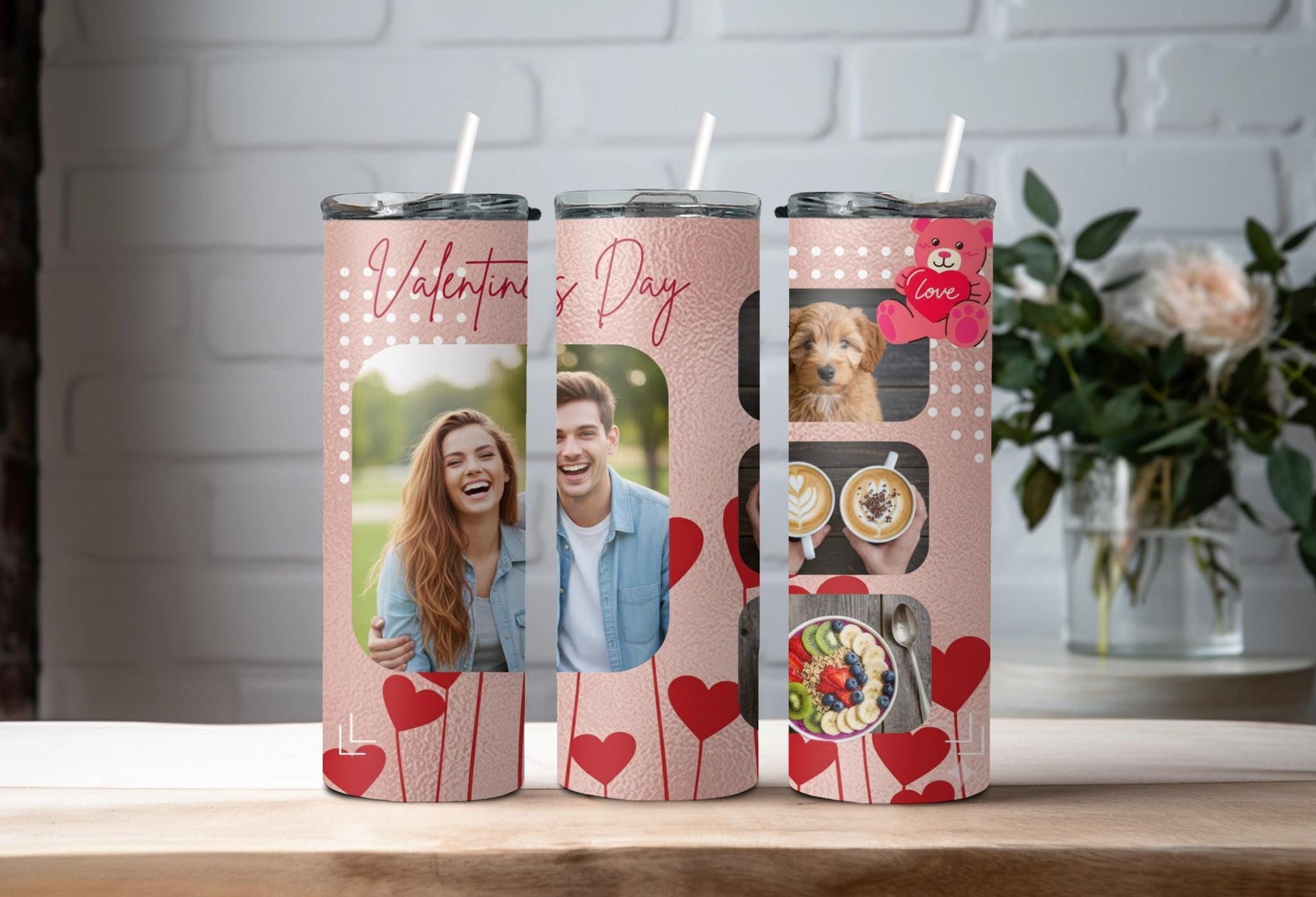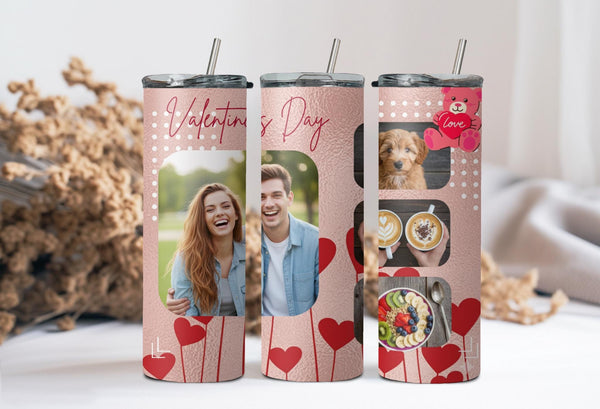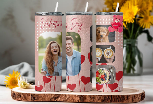 Celebrate love with our Valentine's Day Heart Balloon Photo Tumbler! The pink textured background and red heart-shaped balloons add a touch of romance. Keep beverages hot for 6 hours and cold for 24 hours. Personalize with a name and showcase your special moments in the four photo spaces.