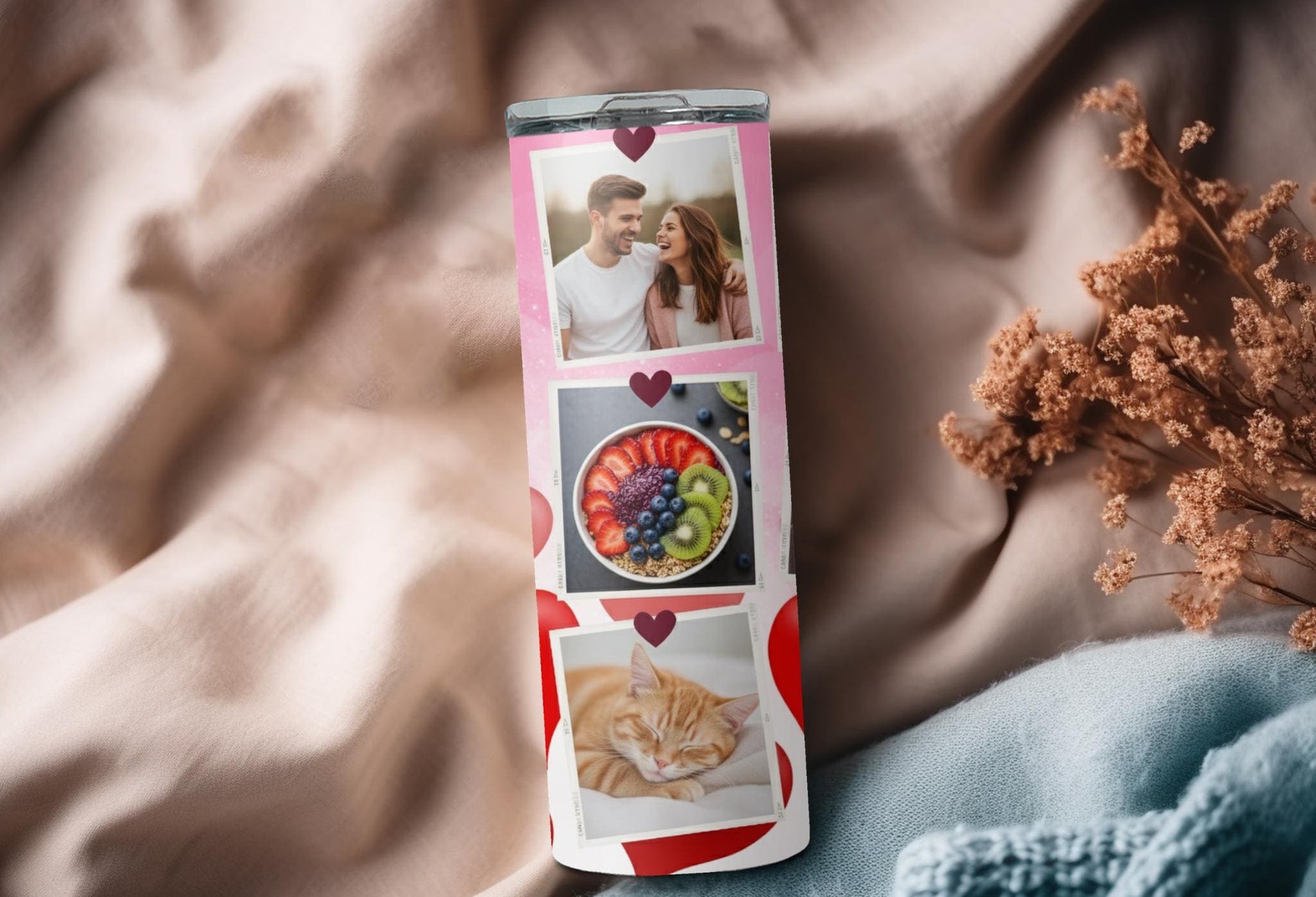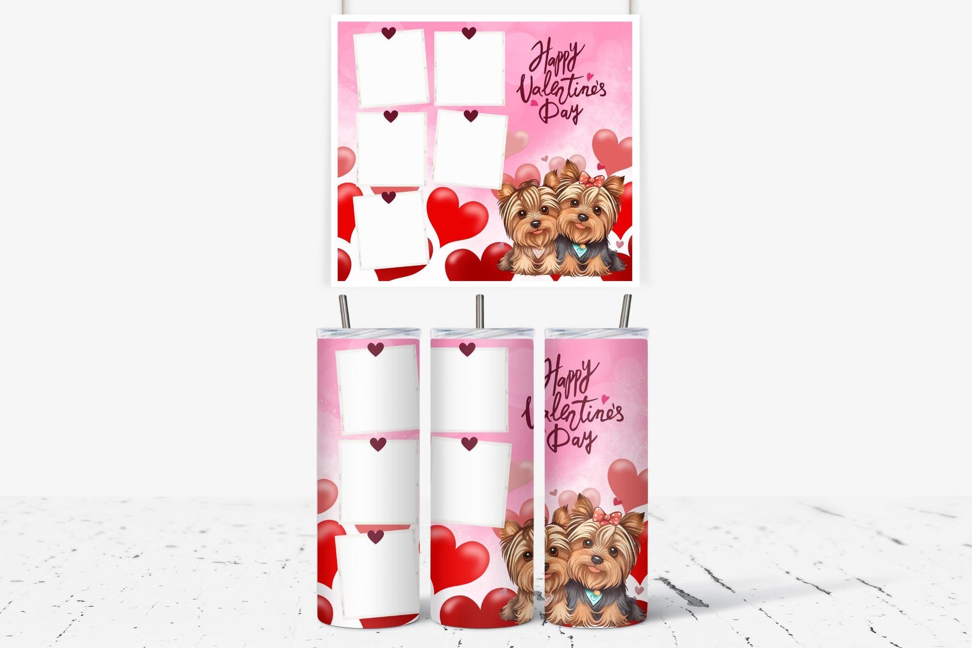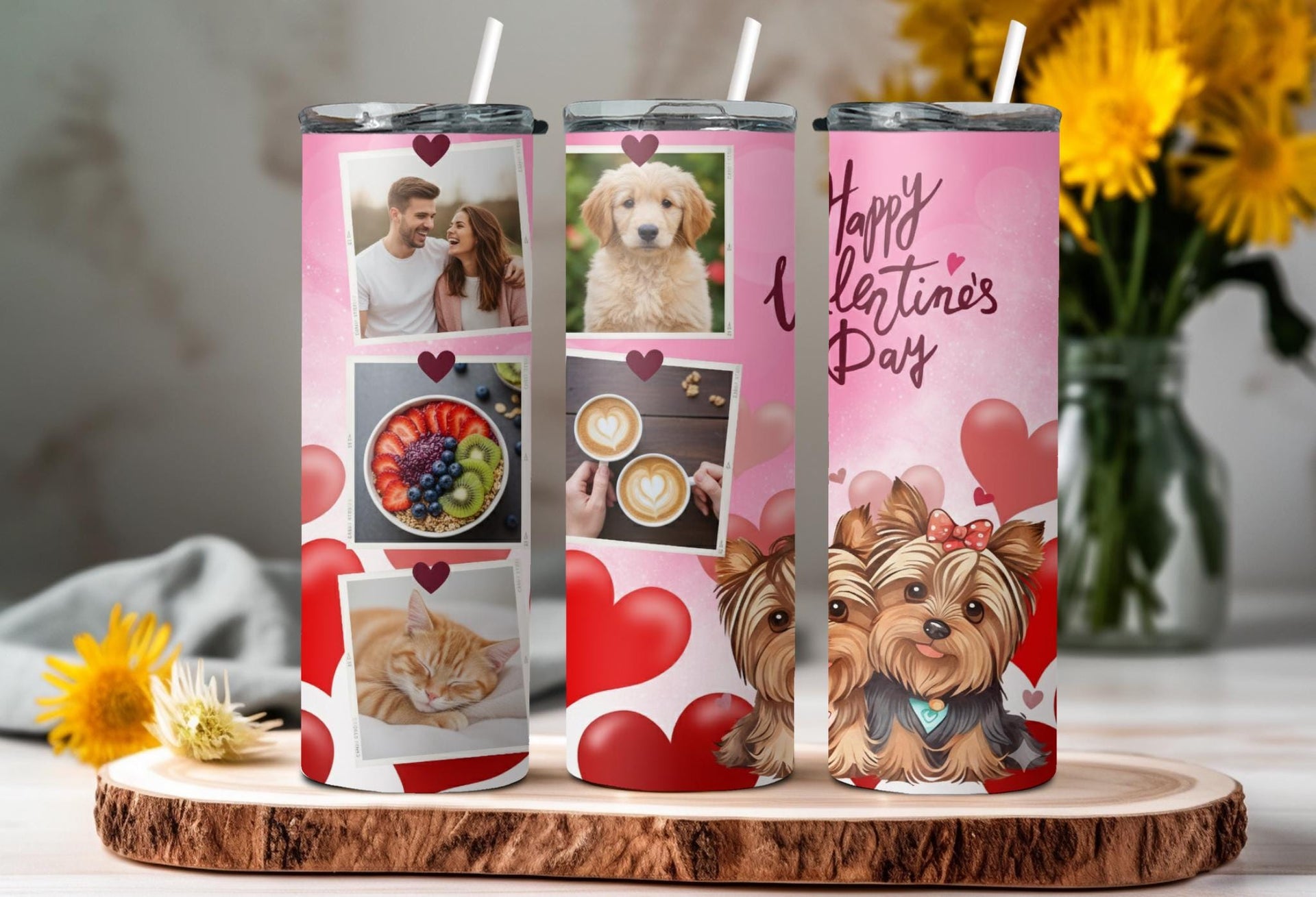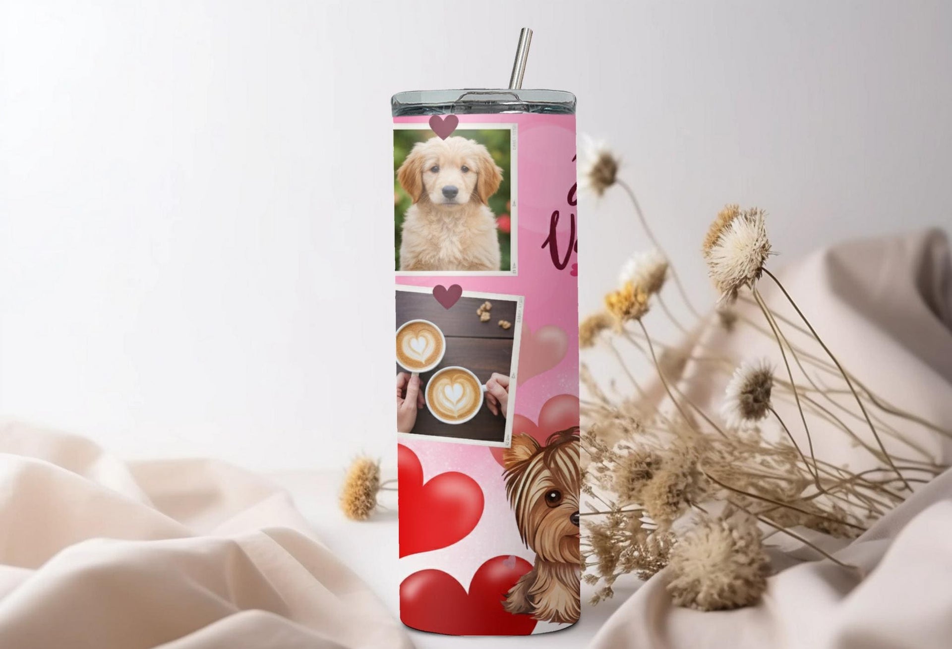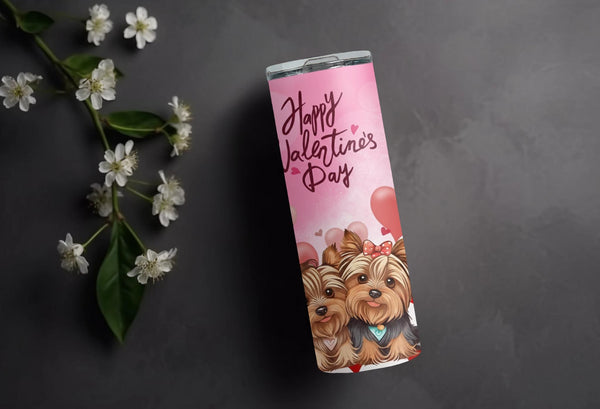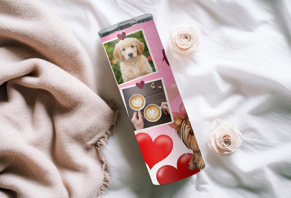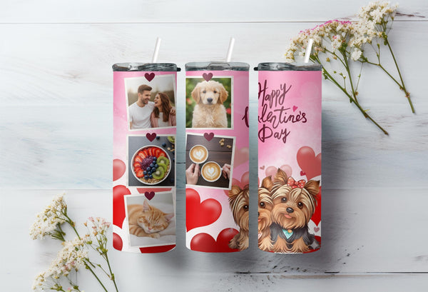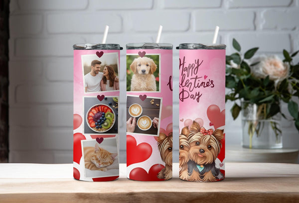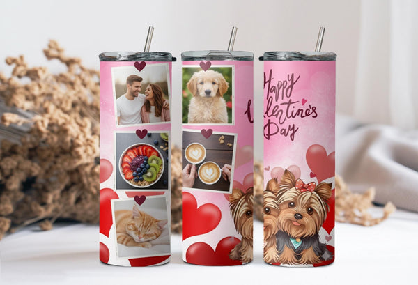 Celebrate love this Valentine's Day with our Yorkie Love Photo Tumbler! The pink background, filled with red and pink hearts, is complemented by adorable Yorkshire Terrier illustrations. Personalize it with your name and add up to 6 hours of hot or 24 hours of cold temperature retention. Order now and share your love in a cute and playful way!