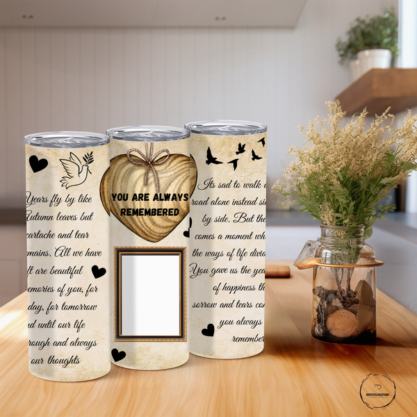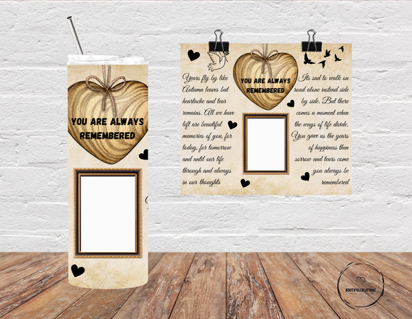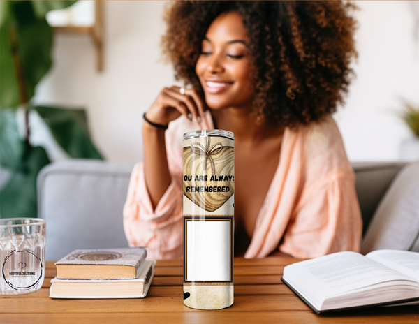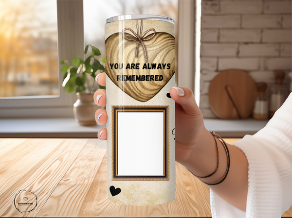 This heartfelt tumbler, featuring a rustic wooden heart and a bow, will always remind you of your loved one. Inscribed with the inspiring words "YOU ARE ALWAYS REMEMBERED" and with a space for a personalized photo, it keeps drinks hot for up to 6 hours and cold for up to 24 hours. Personalize it with a name and keep your memories close.