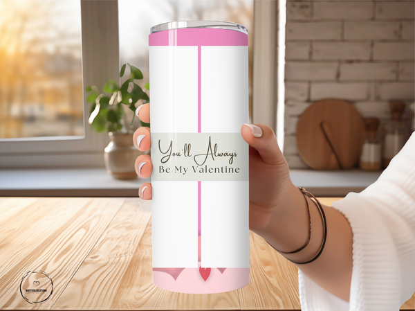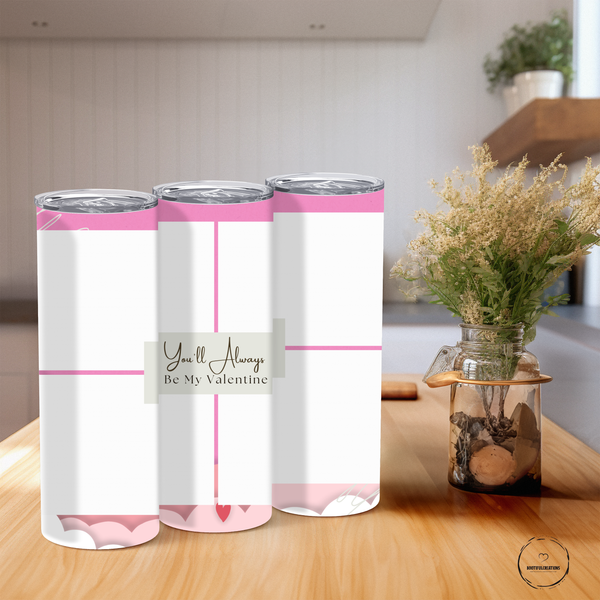 Show your love with the You'll Always Be My Valentine Photo Tumbler! Its soft pink and white color scheme, elegant cursive font, and four photo slots separated by thin pink lines make it a beautiful and personalized gift. Keep your drinks hot for 6 hours or cold for 24 hours. Add a name for a heartfelt touch.