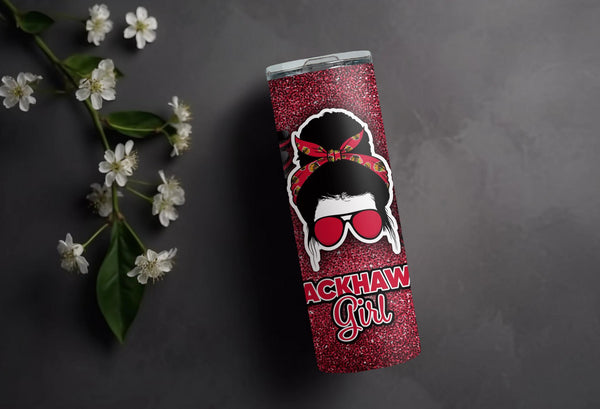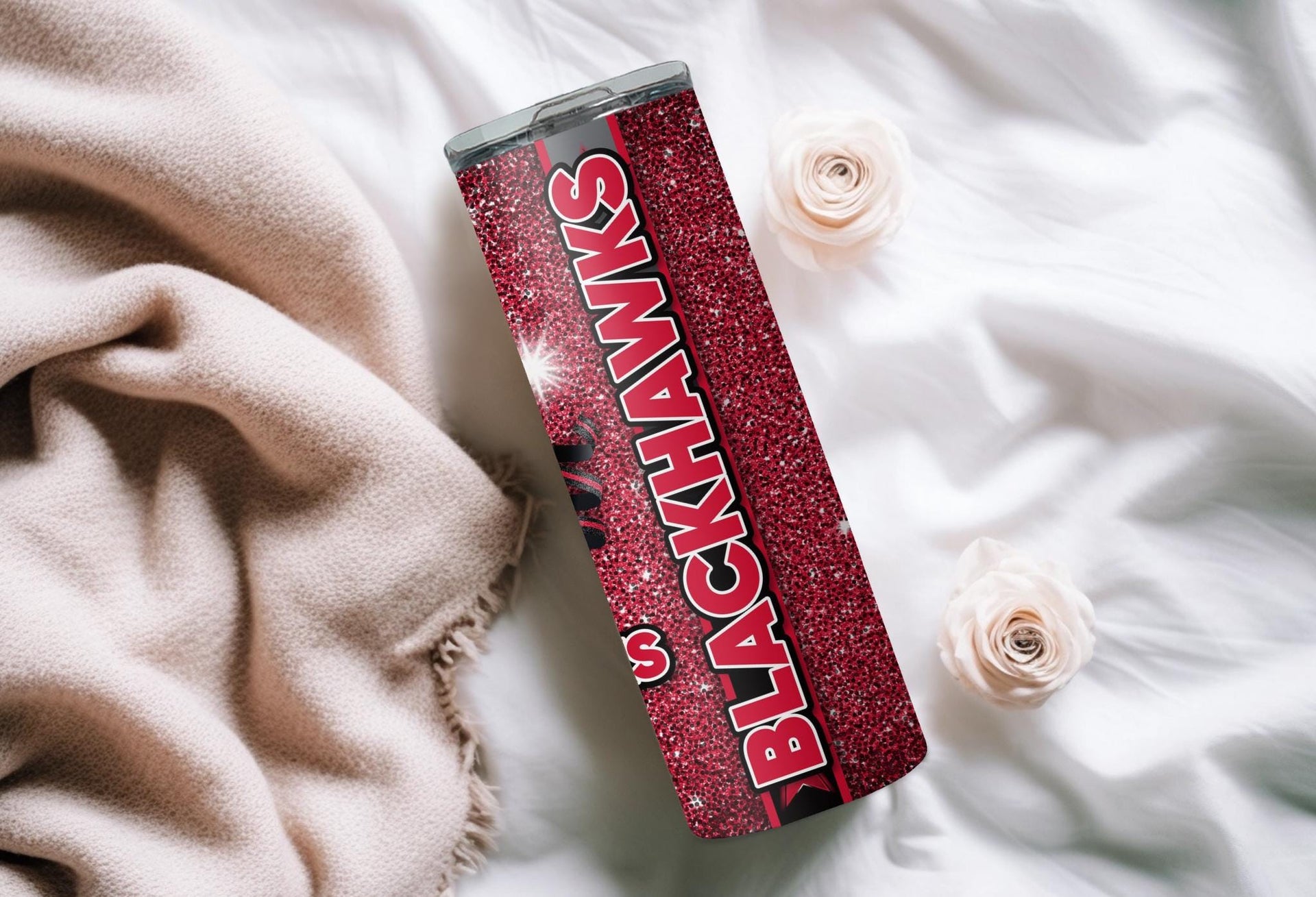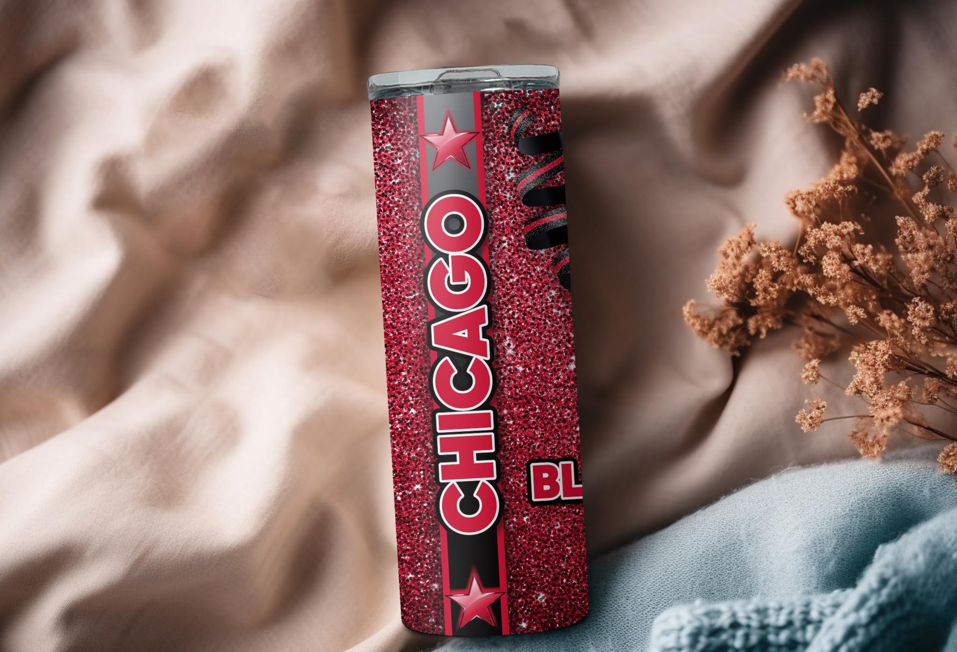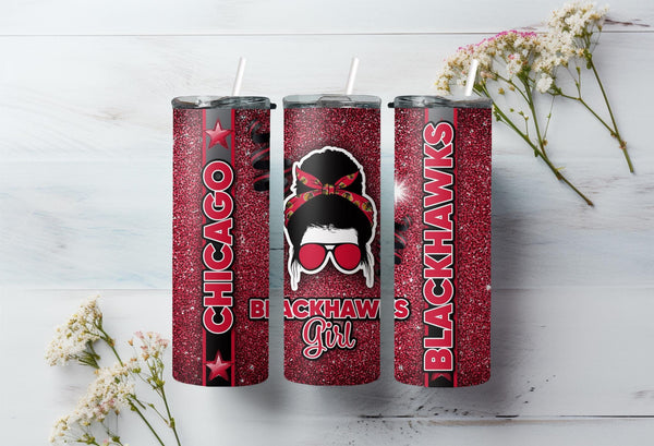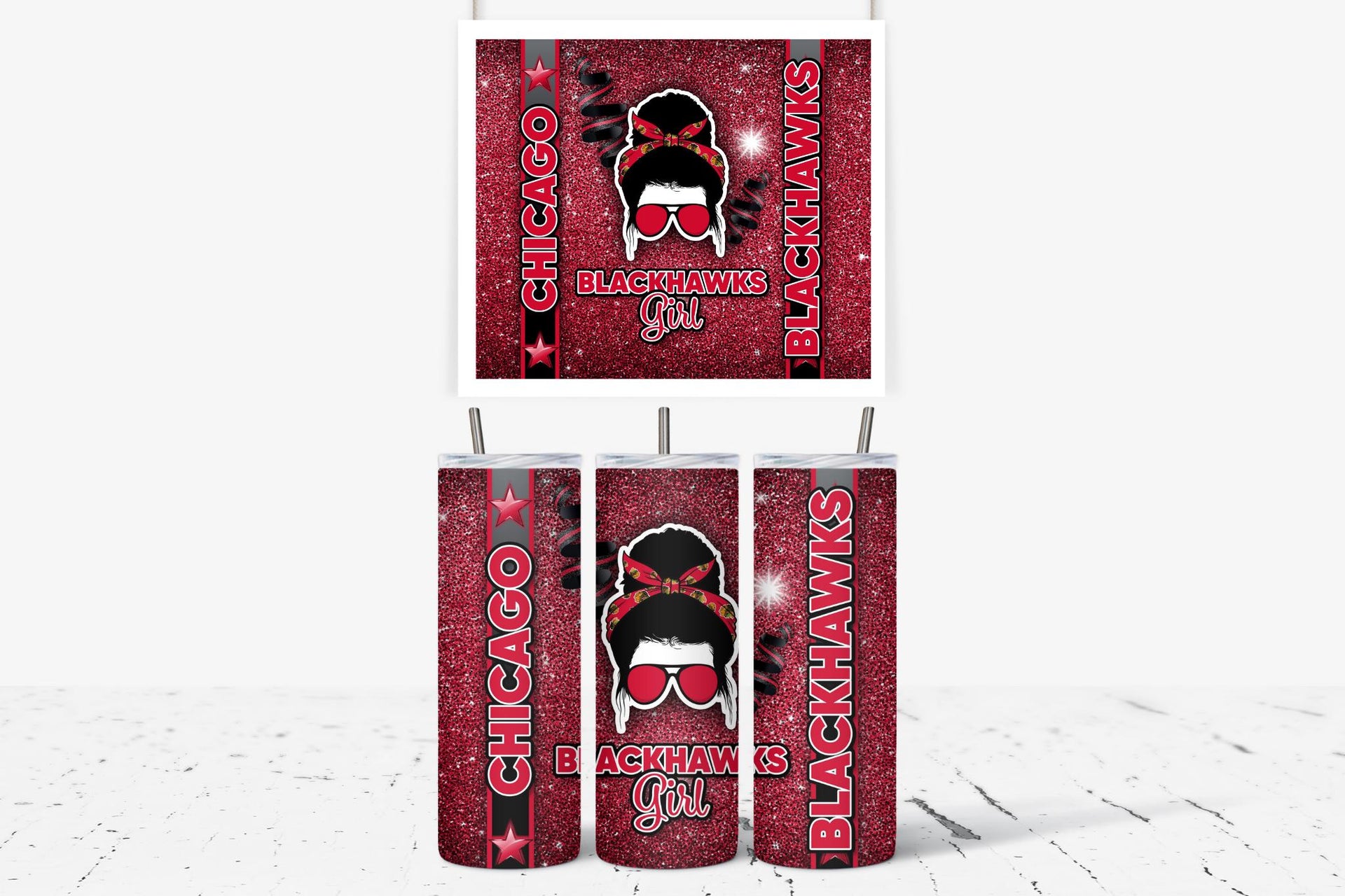 Whether you are heading to the United Center or watching the game from home, this tumbler is the perfect accessory for a dedicated fan. Featuring a vibrant red faux-glitter background and a stylish messy bun design with a team-themed bandana, this cup is ready for puck drop.