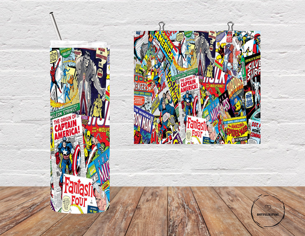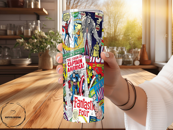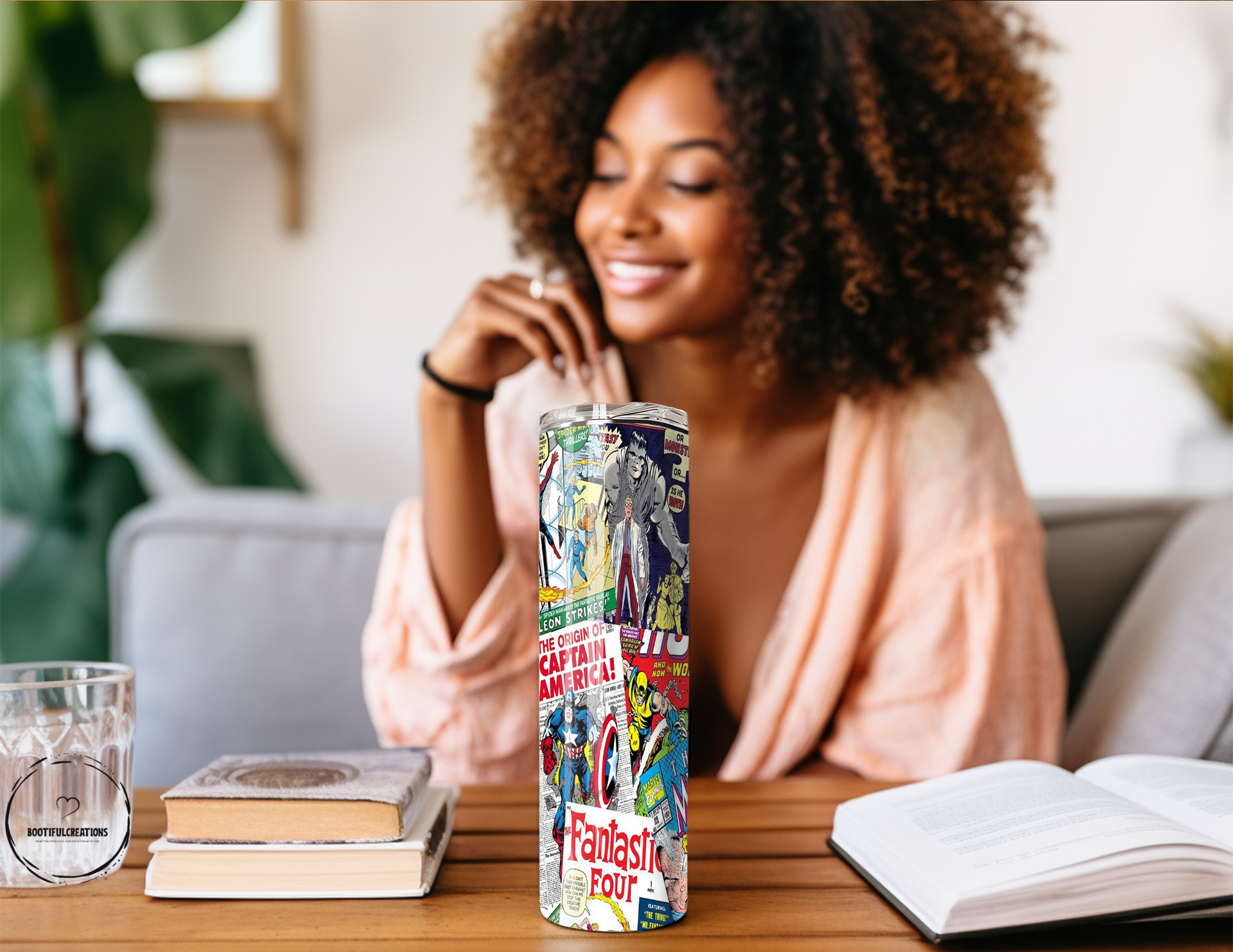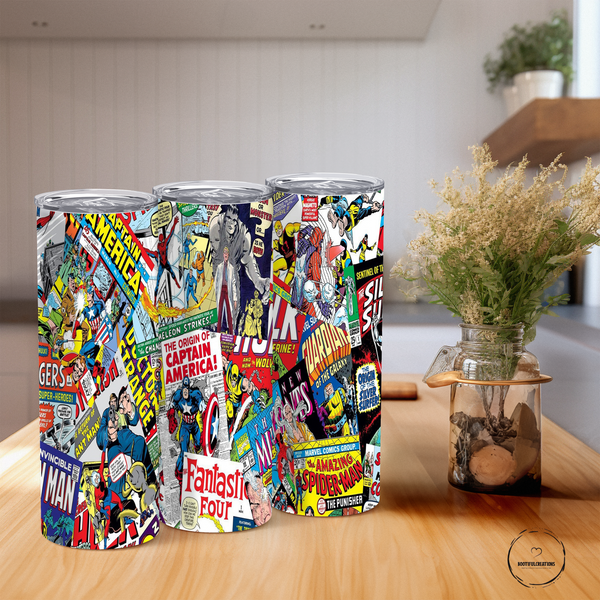 Stay hydrated in style with our Comic Book Tumbler! Featuring a vibrant comic book collage, this tumbler can keep your beverage hot for up to 6 hours and cold for up to 24 hours. Personalize it with a name for a unique touch. Quench your thirst and show off your love for comics with this tumbler.