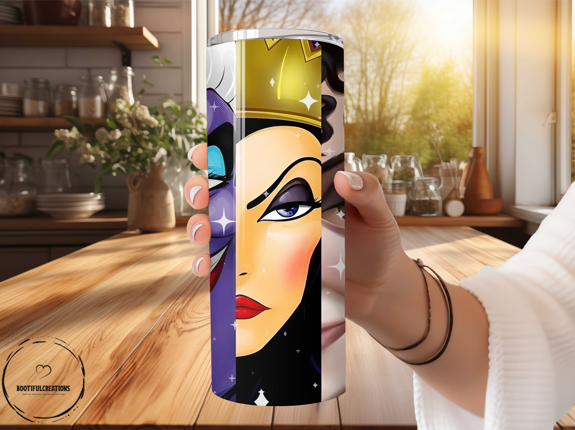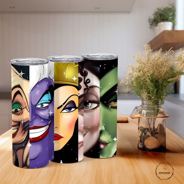 Unleash your inner villain with the Disney Villains Tumbler! Featuring Cruella, Ursula, Evil Queen, and Mother Gothel, this tumbler will keep your drinks hot for up to 6 hours and cold for up to 24 hours. Personalize it with a name and show off your wicked style. Perfect for any Disney fan!