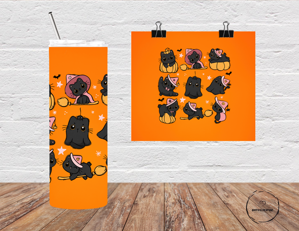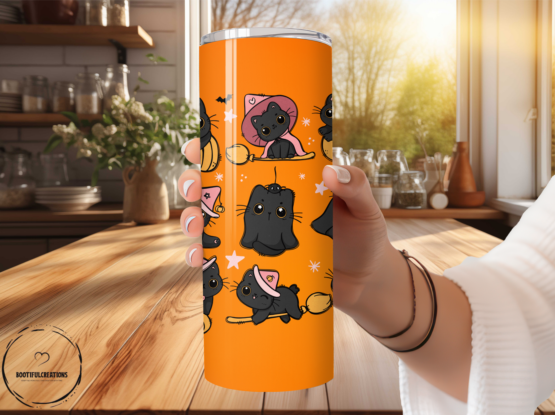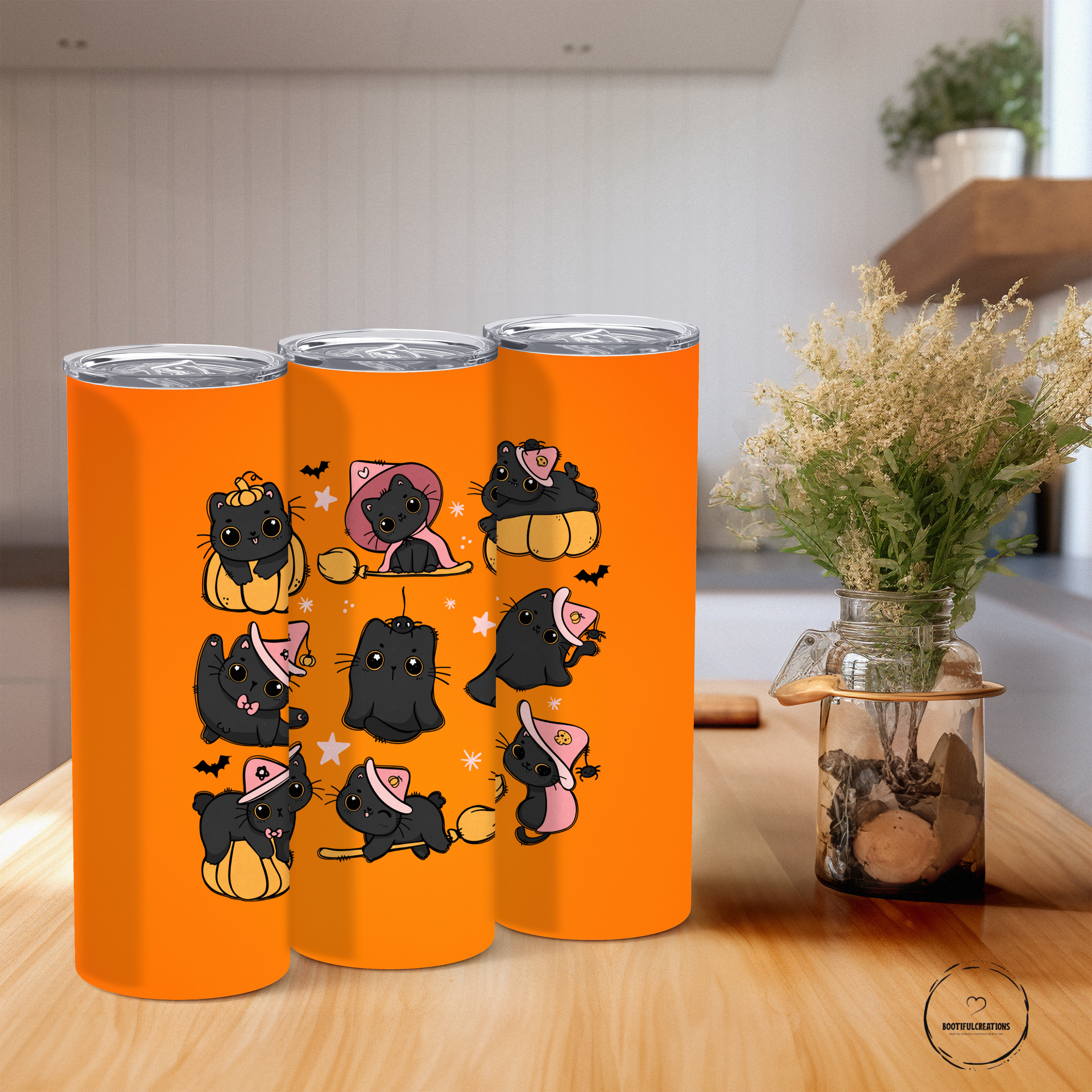Introducing the Halloween Kitty Cat Tumbler, the perfect companion for all your fall adventures! With playful kitties dressed as witches and hiding in pumpkins, this tumbler is both cute and functional. Keep your drinks hot for up to 6 hours or cold for up to 24 hours, and make it yours with a personalized name. Get yours now and make every sip spooktacular!