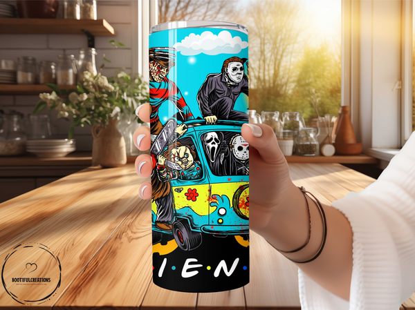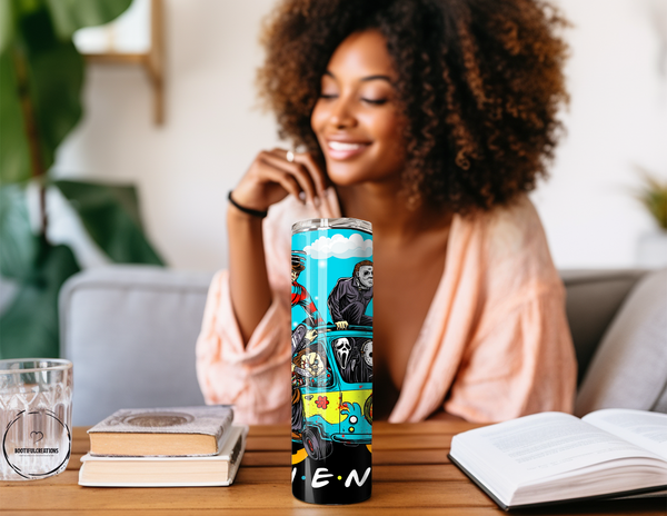Unleash your love for horror with our Horror Friends Mystery Machine Tumbler! Featuring iconic characters from your favorite horror movies, including "FRIENDS" written on the mystery machine, this tumbler keeps your drinks hot for up to 6 hours and cold for up to 24 hours. Personalize it with a name and make it the perfect gift for any horror enthusiast. Get yours now and embrace the horror!