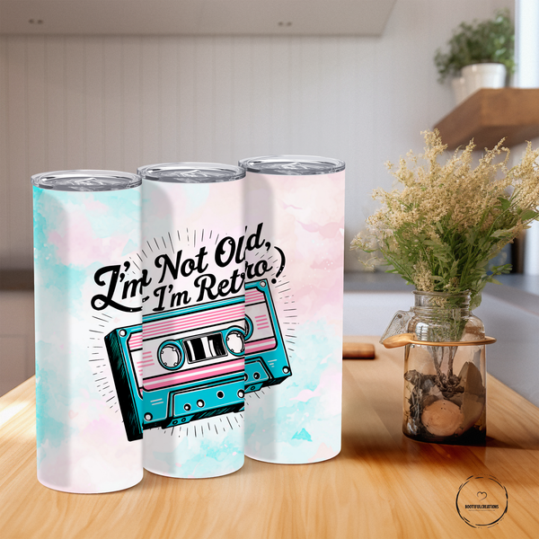 Stay cool and stylish with the "I'm Retro Tumbler" featuring a cassette tape design and the phrase "I'm Not Old, I'm Retro". This tumbler keeps your drinks hot for up to 6 hours and cold for up to 24 hours, perfect for any on-the-go adventure. Personalize it with your name and embrace your retro vibes!