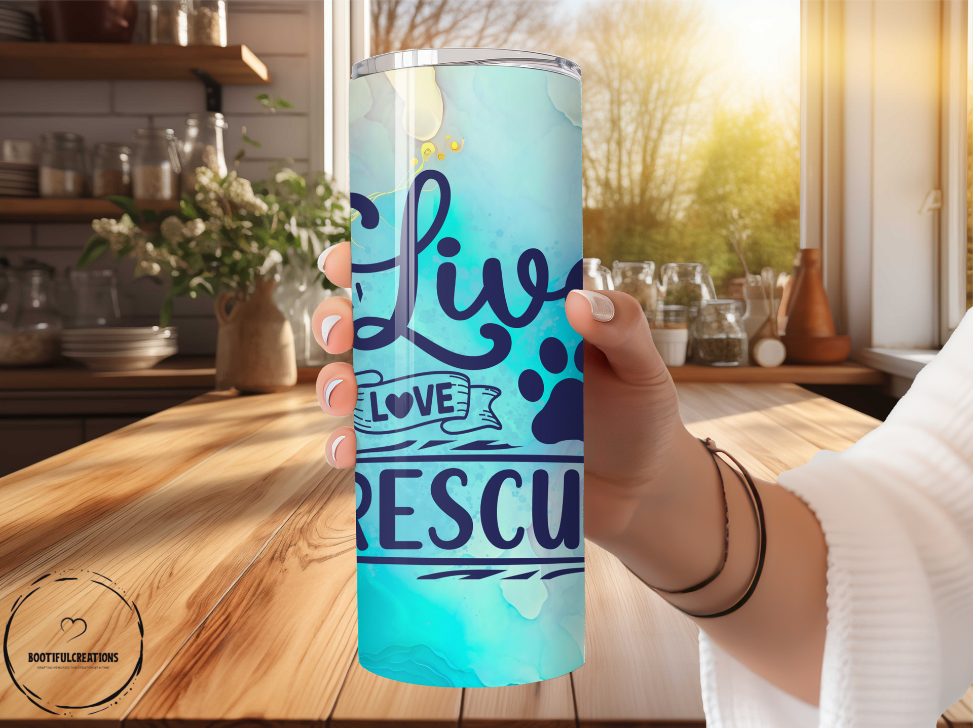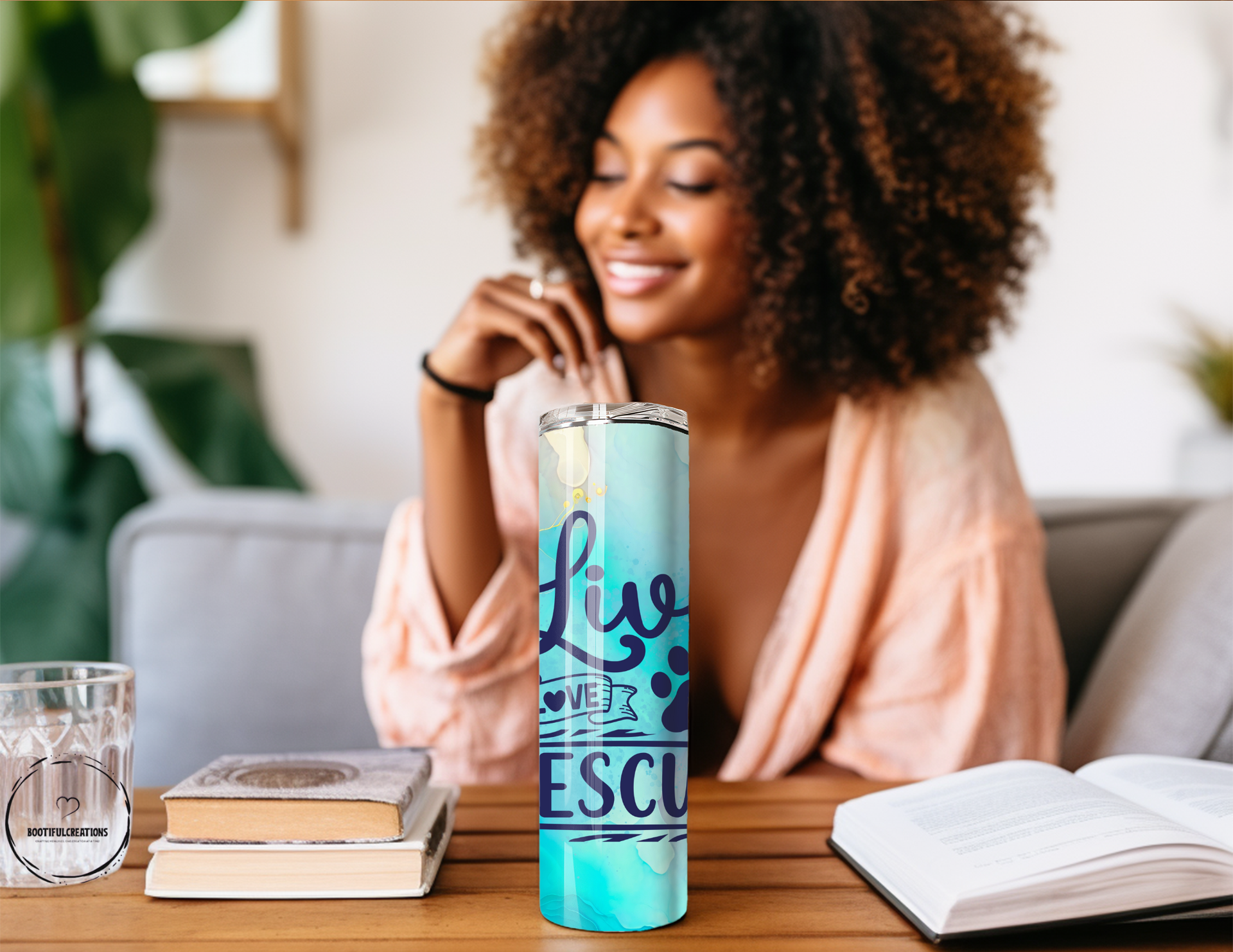 Stay hydrated with the Live Love Rescue Tumbler! Keep your drink hot for up to 6 hours or cold for up to 24 hours. Show your love for rescue animals with the unique "Live Love Rescue" design. Personalize it with a name for an extra special touch.