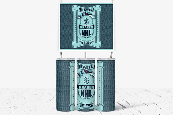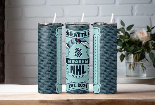 This tumbler showcases a detailed, textured banner design with the official Seattle Kraken "S" logo, team name, and "EST. 2021" to commemorate their inaugural season. The deep sea blue and ice blue color scheme is perfect for any dedicated fan.