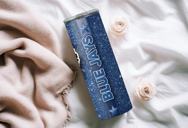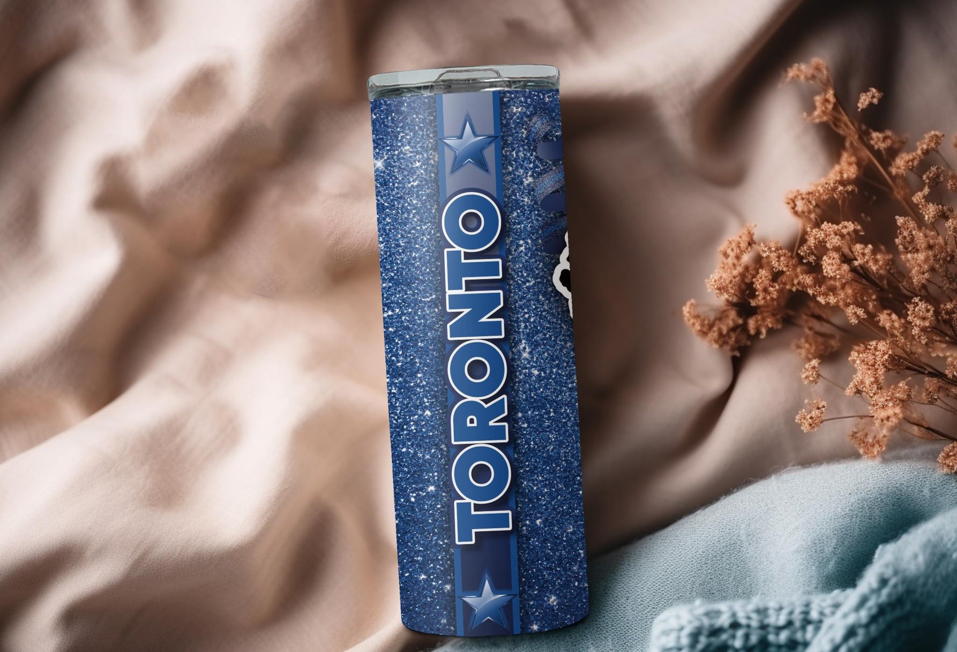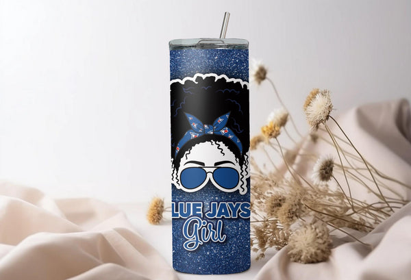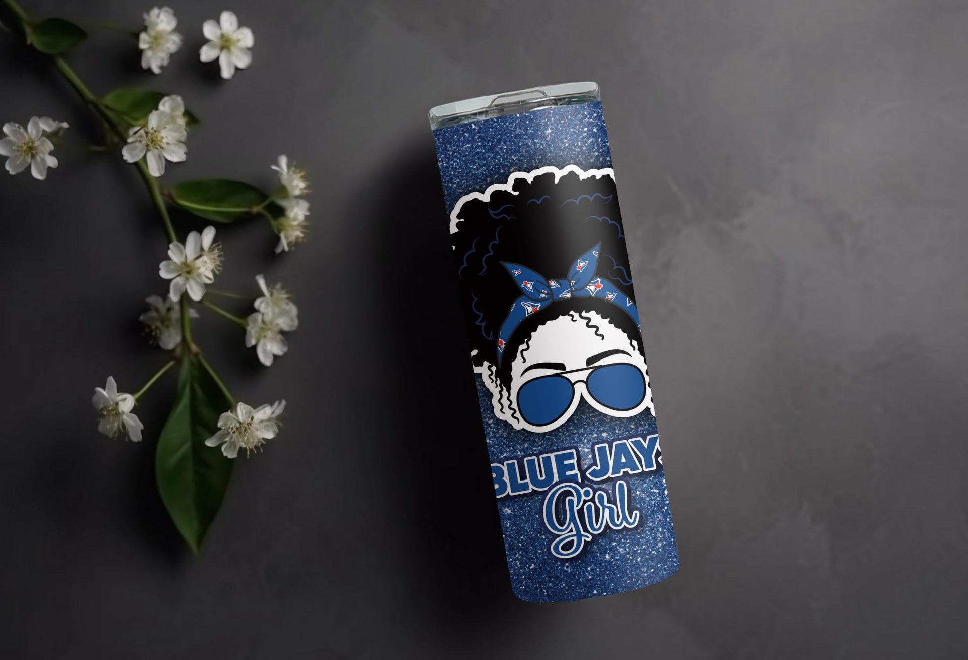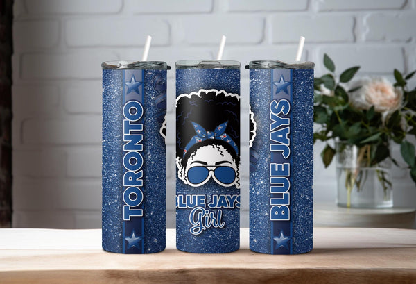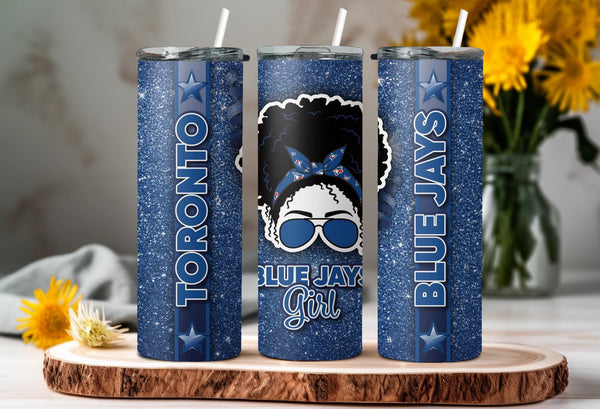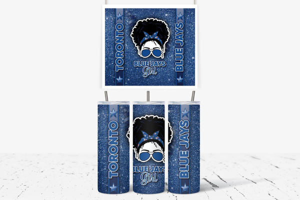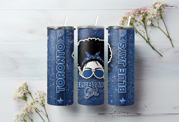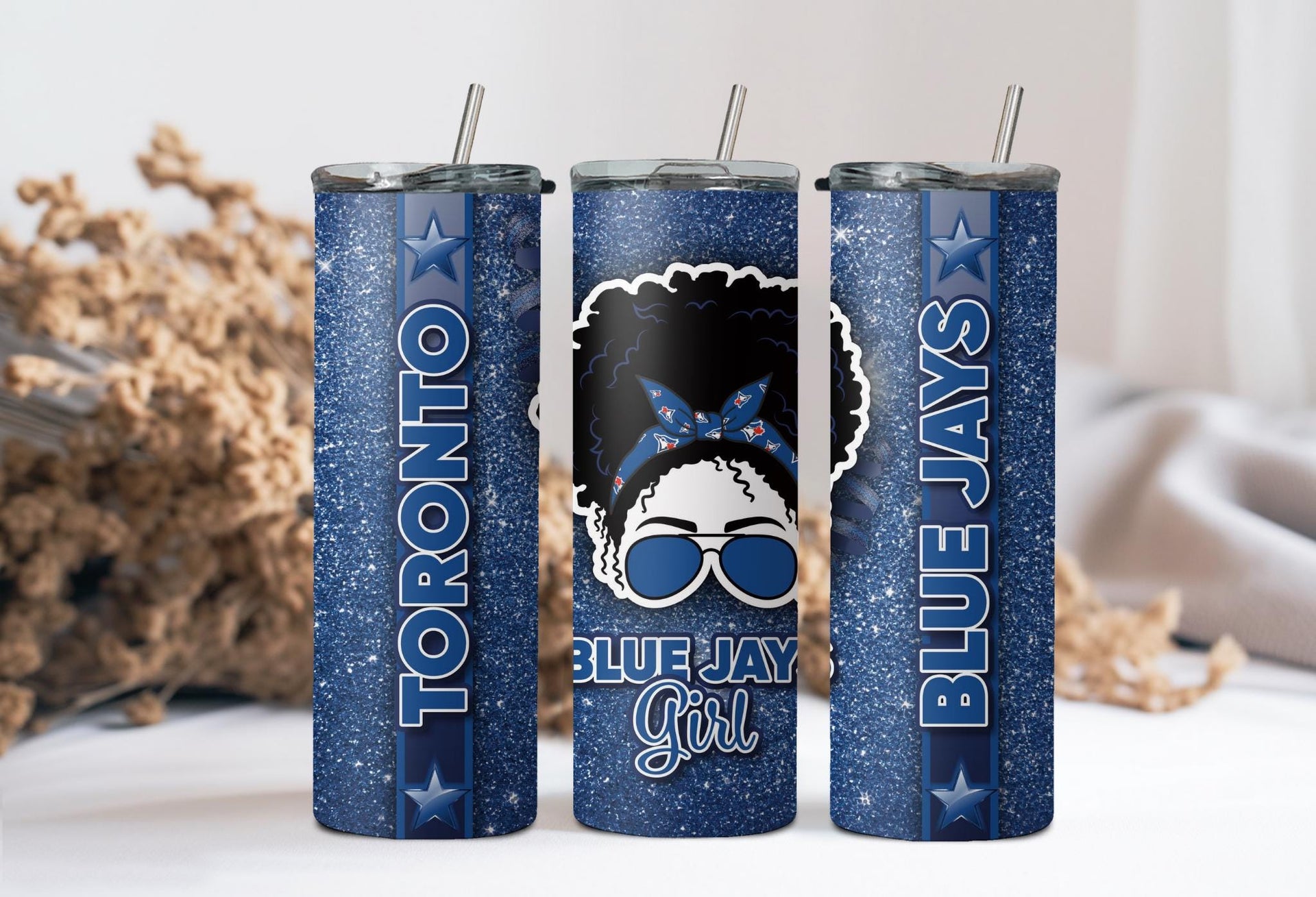 Toronto Baseball Girl 20oz Skinny Tumbler, Navy Blue Glitter Cup, Afro Puff, Baseball Mom