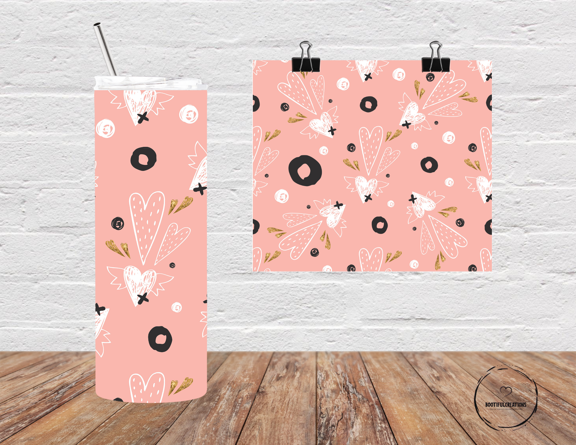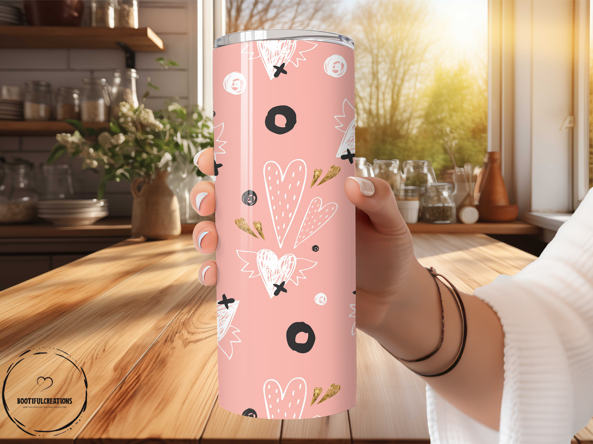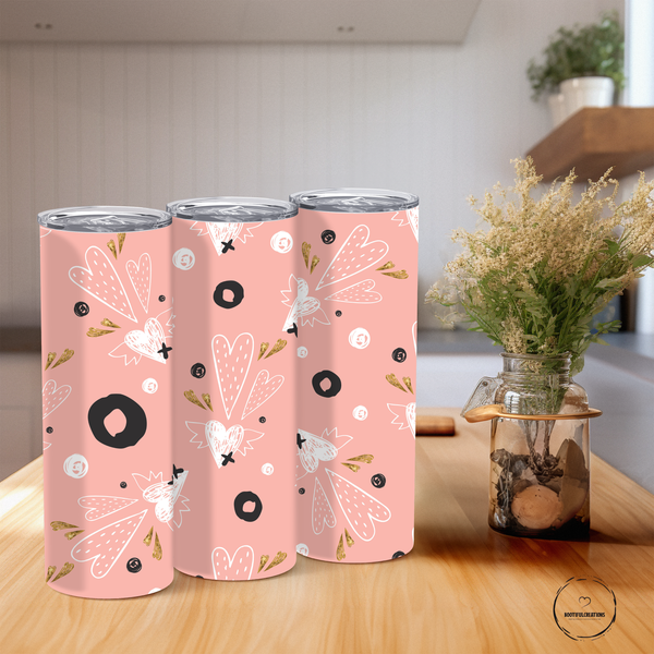 Stay stylish and hydrated on-the-go with our Whimsical Hearts and Doodles Tumbler! Featuring playful white and pink hearts, black circles, and subtle gold accents on a peach-colored background, this tumbler keeps your drink hot for up to 6 hours and cold for up to 24. Personalize with a name for the perfect touch!
