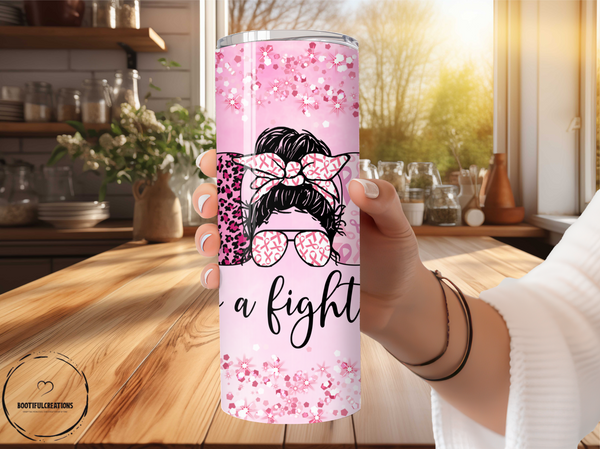 Stay strong and hydrated with the A Fighter Tumbler! Featuring a "Mom is A Fighter" design and pink cancer ribbons, this tumbler keeps drinks hot for up to 6 hours and cold for up to 24 hours. Personalize it with a name for a unique touch. A perfect gift for the strong and courageous.