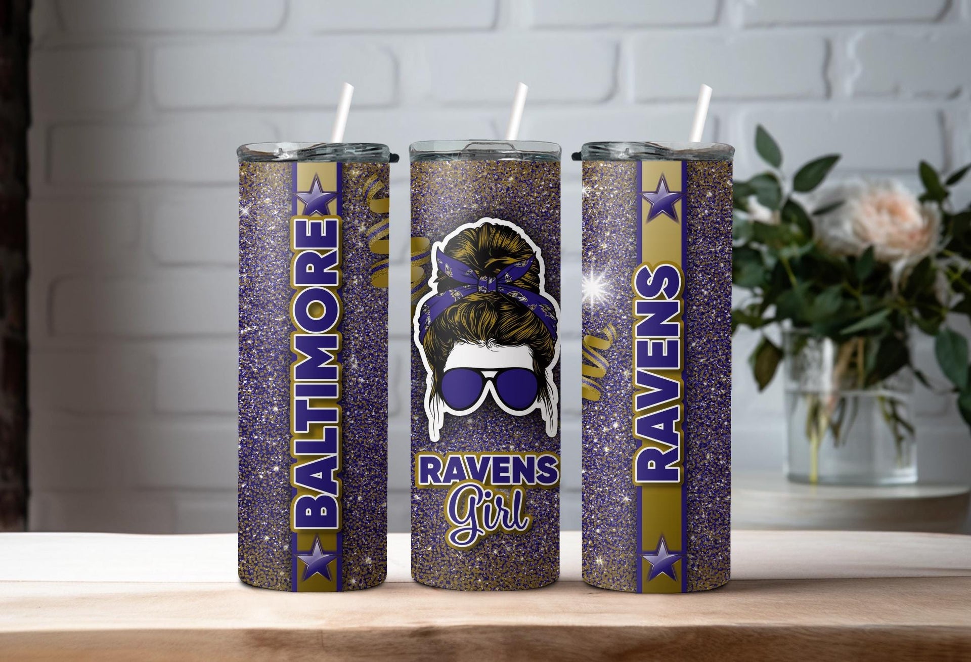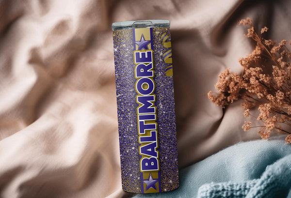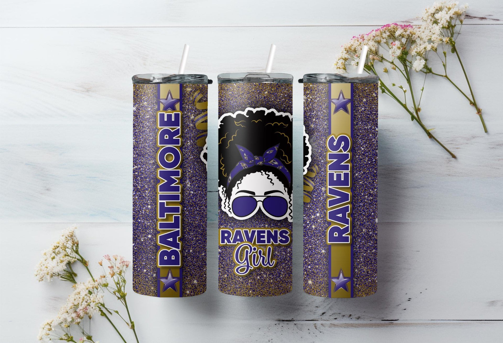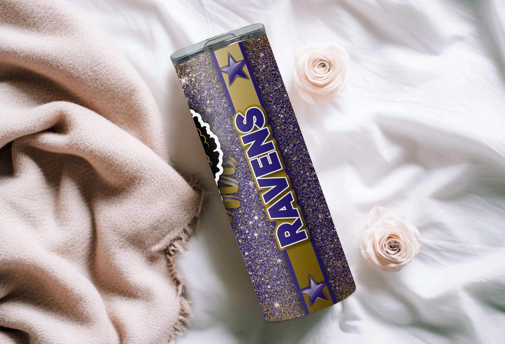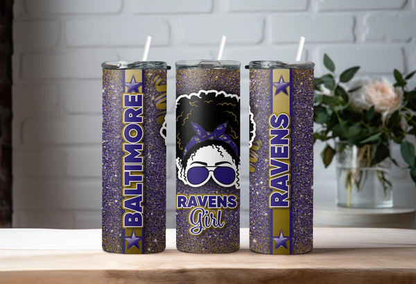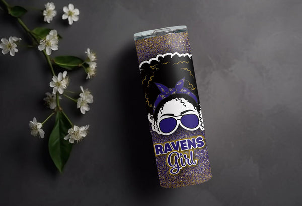 Baltimore Football Girl 20oz Skinny Tumbler, Purple and Gold Glitter Cup, Afro Puff & Messy Bun Options, Football Mom