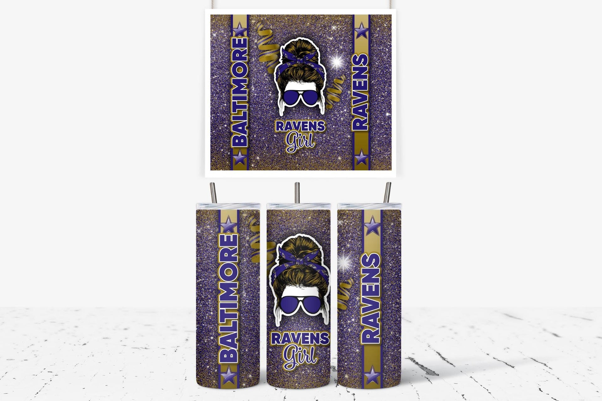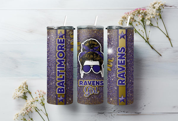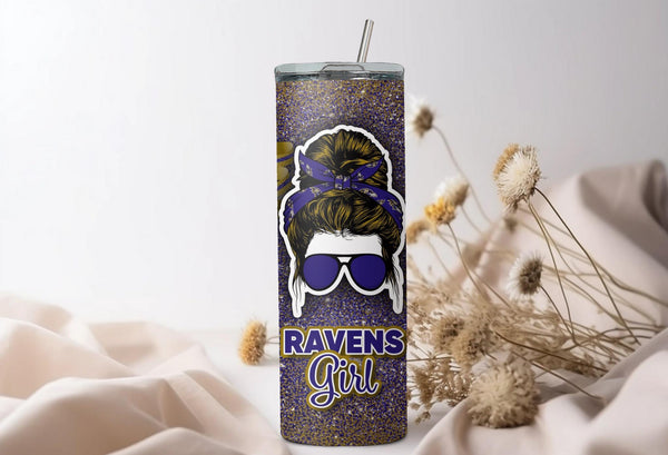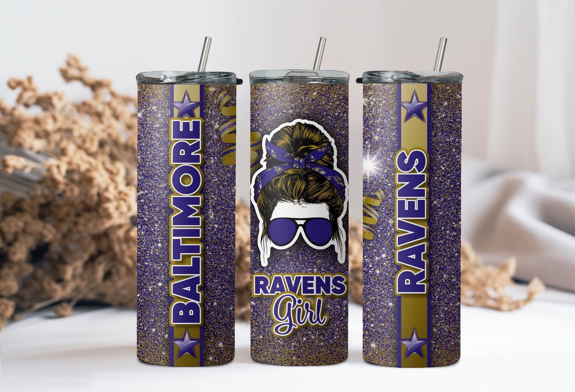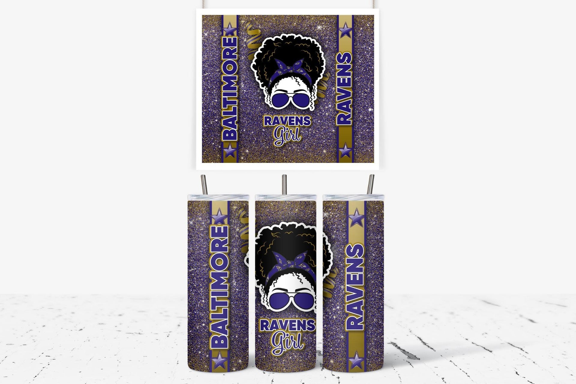 Baltimore Football Girl 20oz Skinny Tumbler, Purple and Gold Glitter Cup, Afro Puff & Messy Bun Options, Football Mom