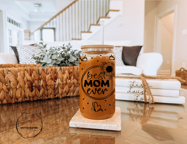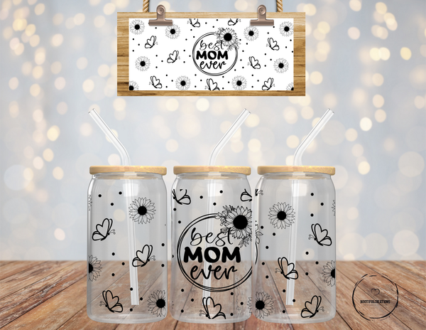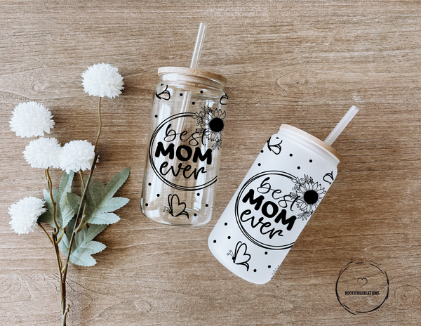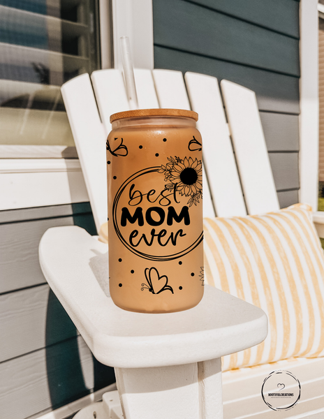 Show your Mom how much she means to you with our "Best Mom Ever" Glass Cup. Adorned with vibrant sunflowers and delicate butterflies, this 16oz cup is the perfect gift. Choose between clear or frosted for a unique touch. Cheers to the best Mom ever!