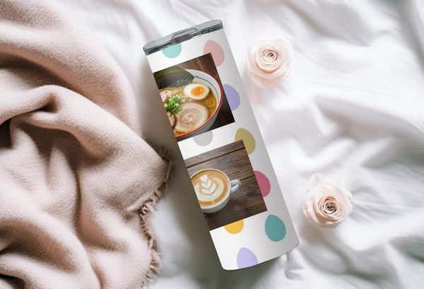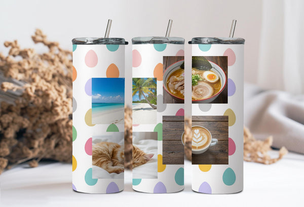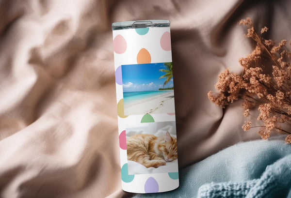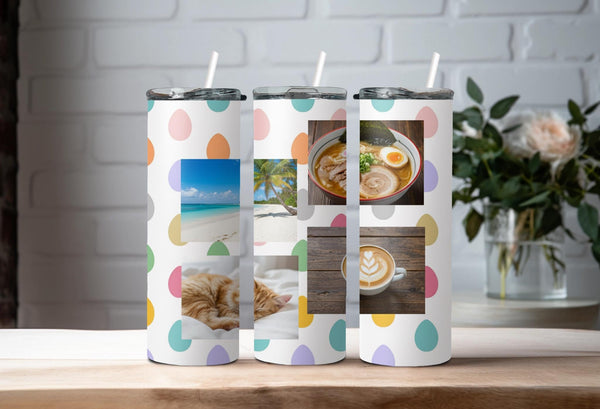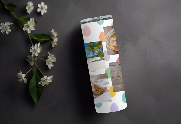 Celebrate the spring season with our vibrant and playful polka dot pattern tumbler! Perfect for all your hot or cold drinks, this tumbler keeps beverages at the perfect temperature for up to 6 hours hot and 24 hours cold. Customize with a name and showcase your favorite memories with 4 white spaces for photos.