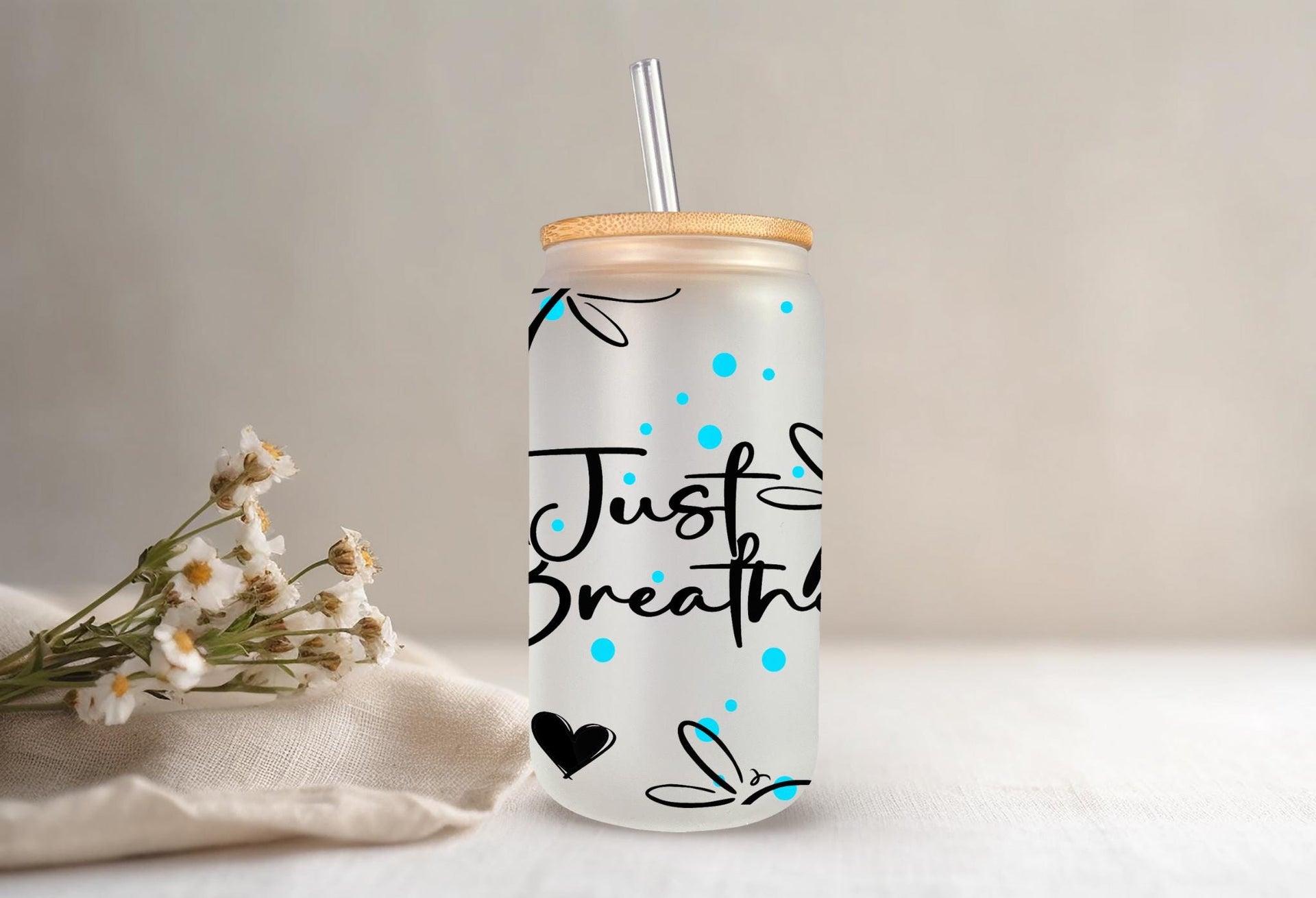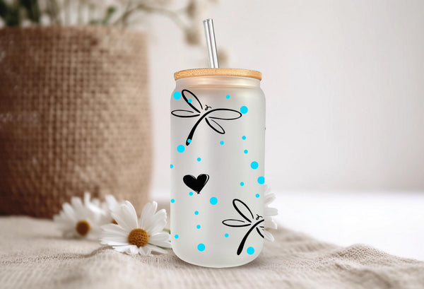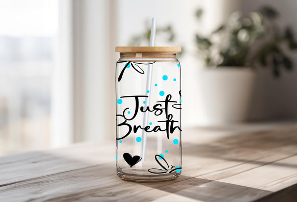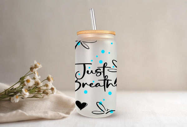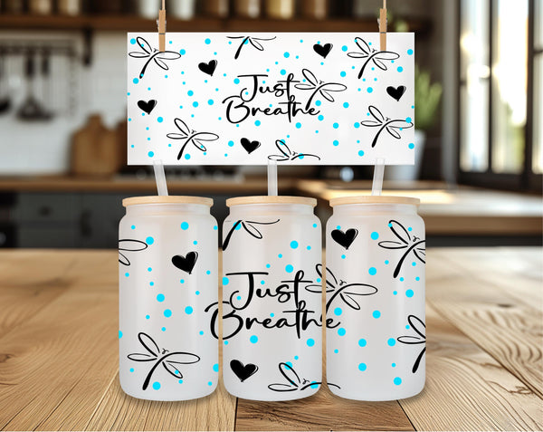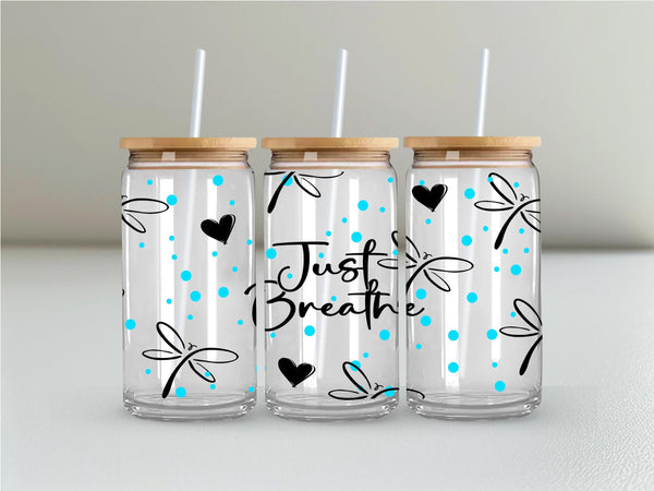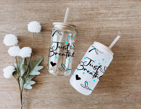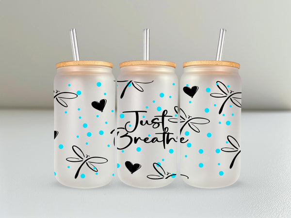 Experience a moment of calm with our Just Breathe Glass Cup. Featuring delicate dragonflies, this 16oz cup can be enjoyed in clear or frosted glass. Savor your favorite beverage and let the message on the cup remind you to take deep breaths and appreciate the present. Perfect for self-care or as a gift for loved ones.