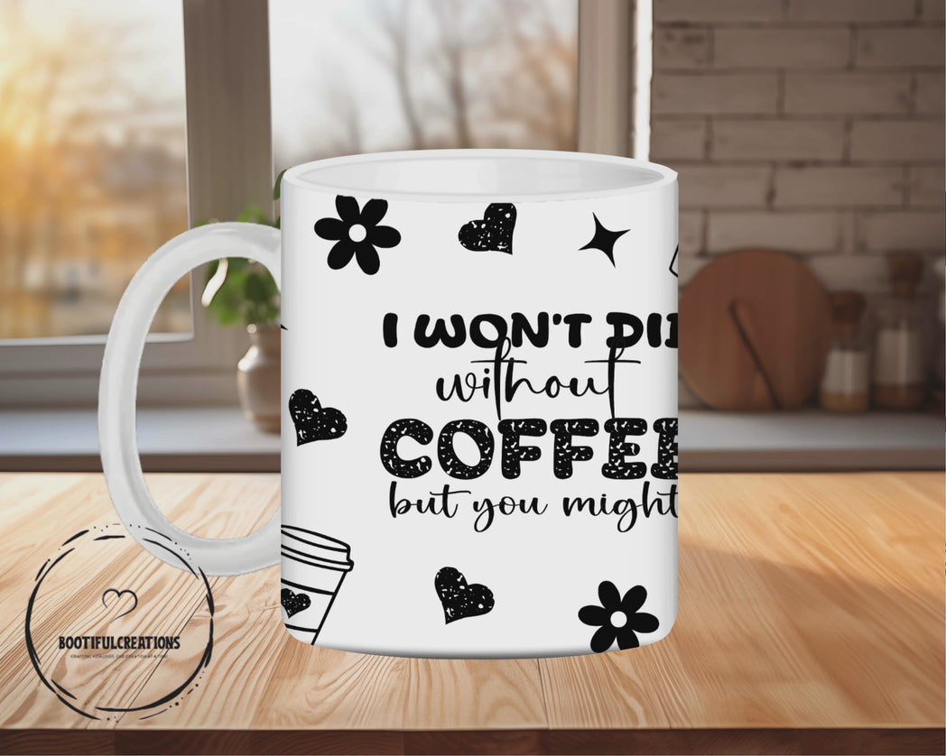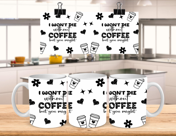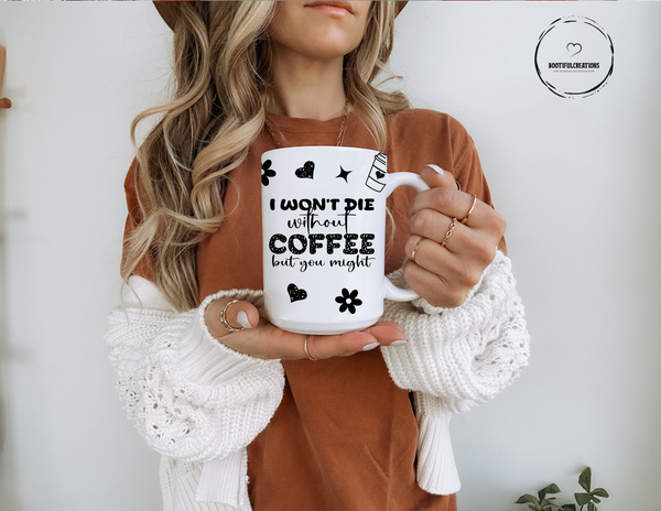 Start your day off right with our "I Won't Die" coffee mug! Made of durable ceramic, it comes in two sizes - 11oz or 15oz - perfect for your morning caffeine fix. With its bold statement, "I Won't Die Without Coffee but You Might", this mug is a must-have for any coffee lover. Get yours today and never fear a coffee-less morning again!