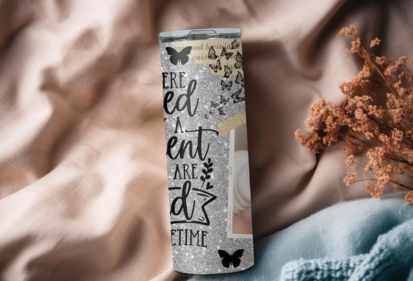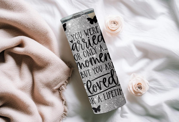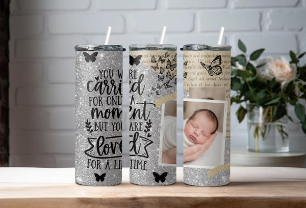 Capture and cherish your precious memories with our Carried for a Moment, Loved for a Lifetime Photo Tumbler. The heartfelt design features the phrase "You were carried for only a moment but you are loved for a lifetime" adorned with glittery silver and vintage text, butterflies, and floral accents. Keep your drinks hot for up to 6 hours or cold for up to 24 hours. Personalize it with your name for a truly special touch.