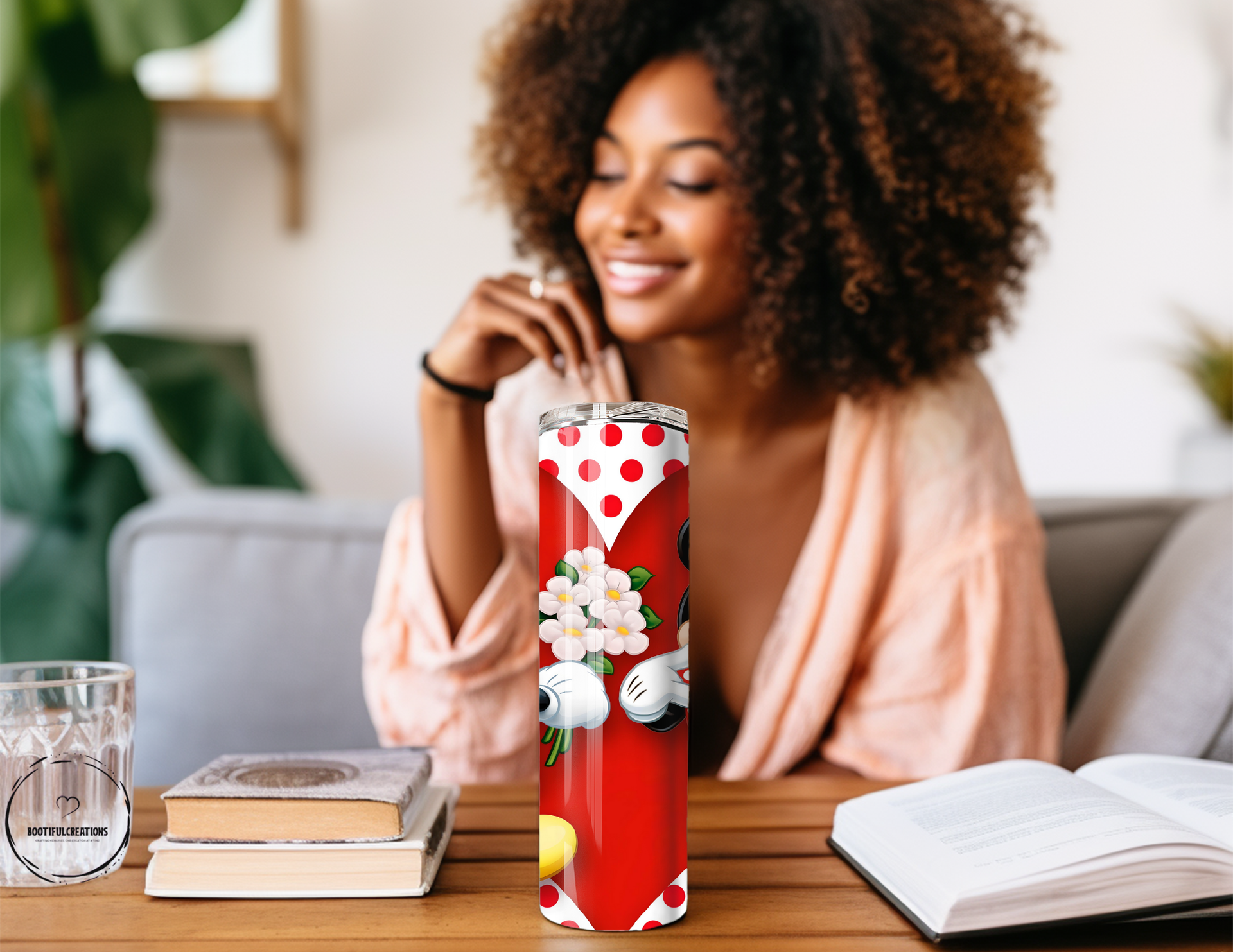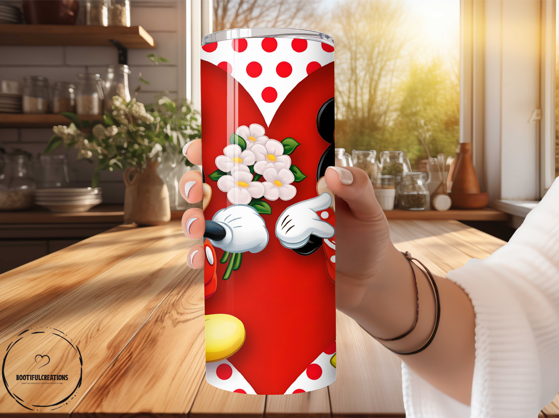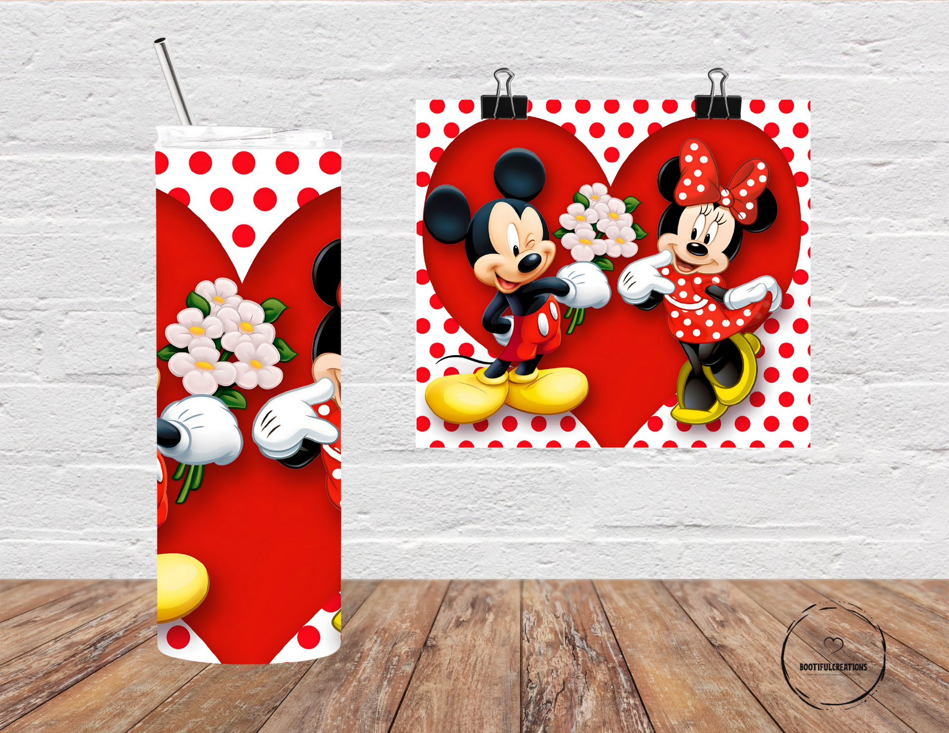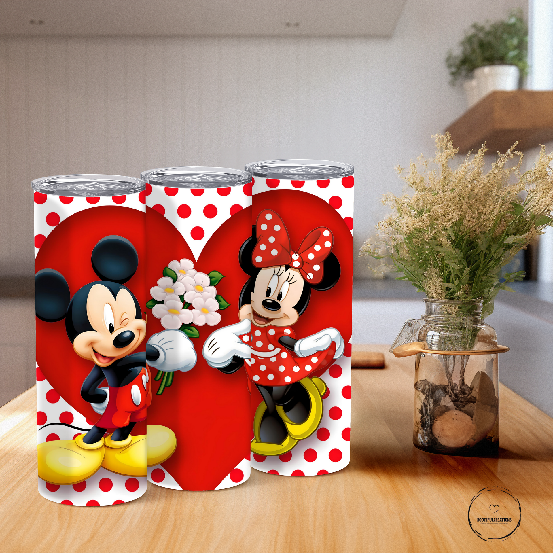 Spread the love this Valentine's Day with our Mickey and Minnie themed tumbler featuring a big red heart and playful red polka dots. Keep your drinks hot for up to 6 hours or cold for up to 24 hours. Personalize it with a name for an extra special touch. Share the magic with your loved one now!