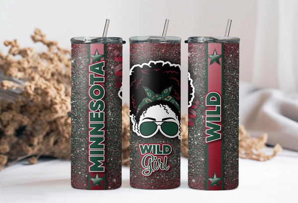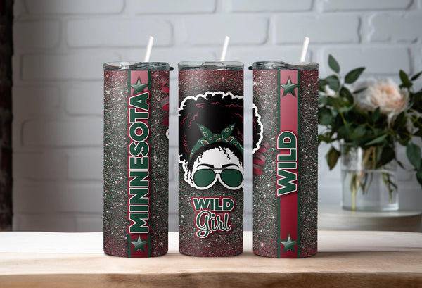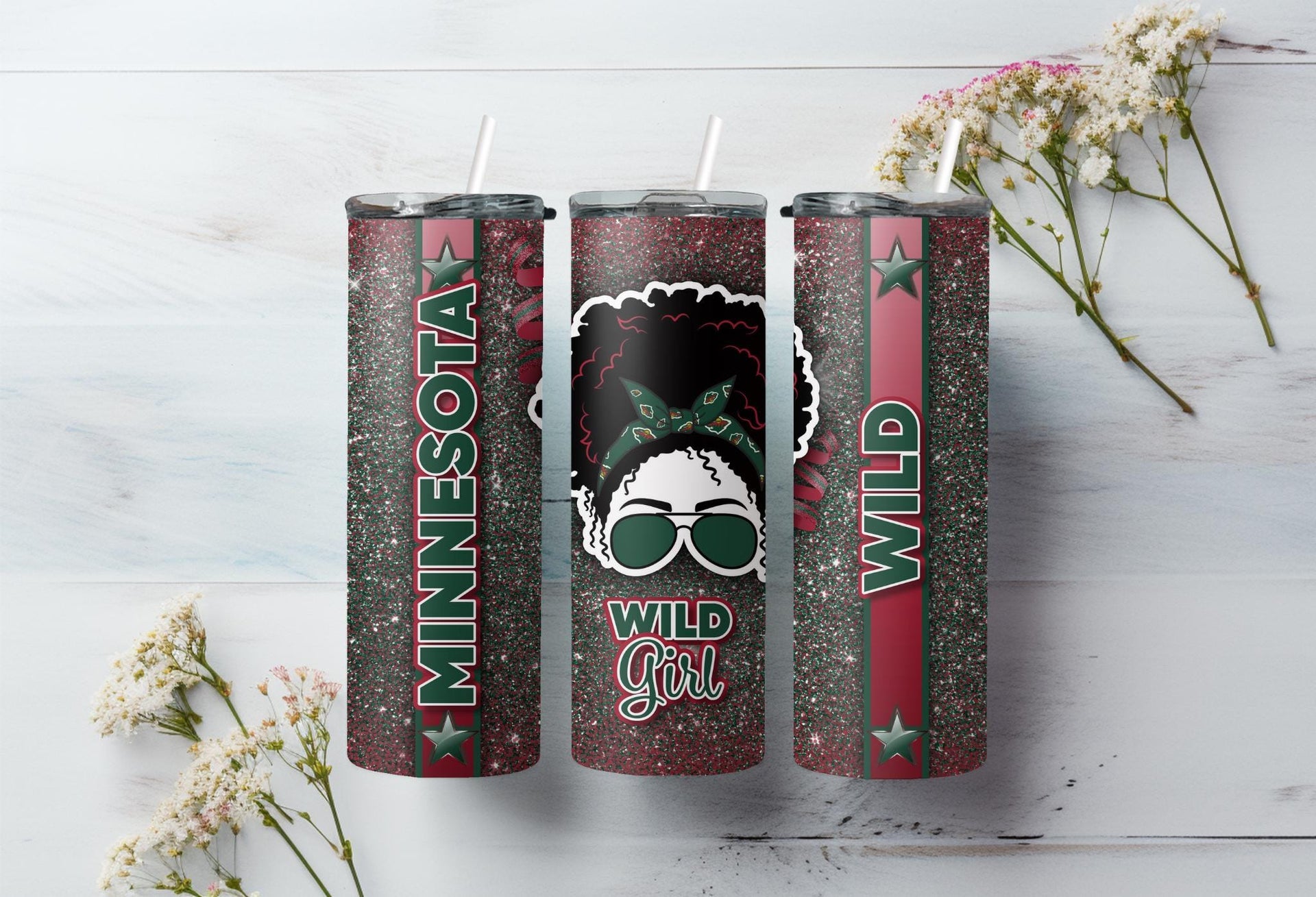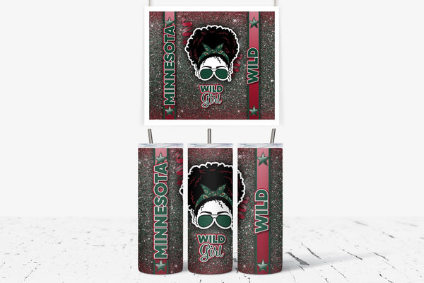 Design: "Minnesota Wild Girl" with vertical stripes and star accents on a dark glitter effect background.