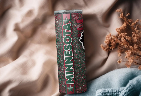 Whether you are cheering at the Xcel Energy Center or watching from the comfort of your home, this tumbler is the perfect way to show your team spirit. Featuring a rich forest green and red faux-glitter design, this cup is essential for any Minnesota fan.