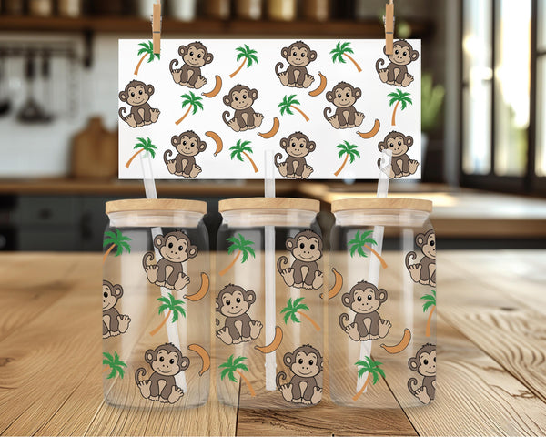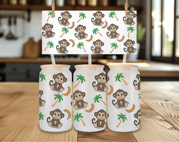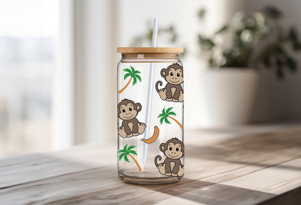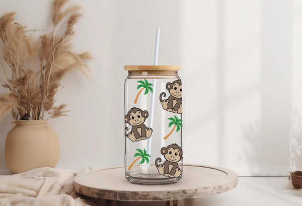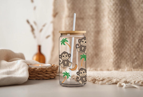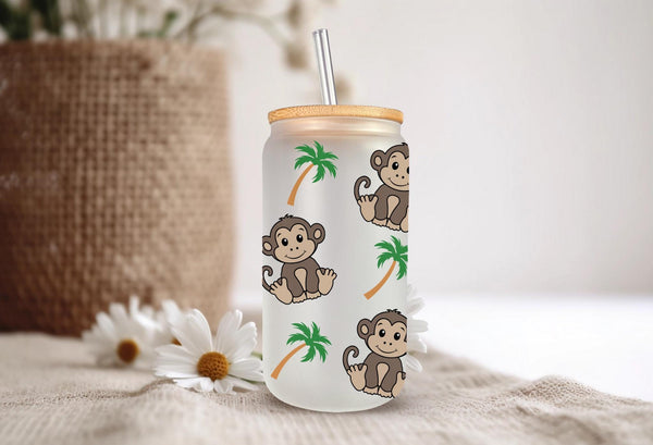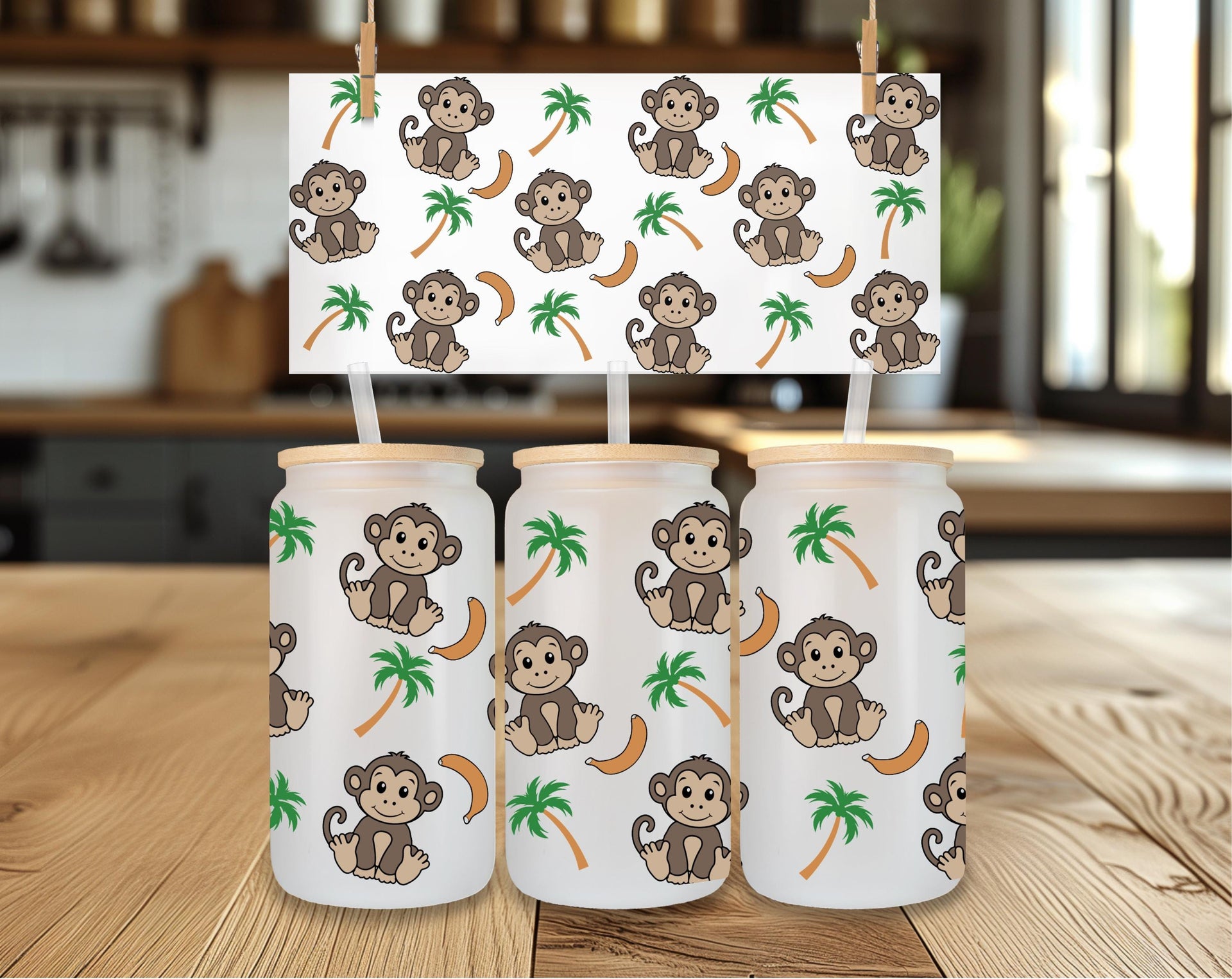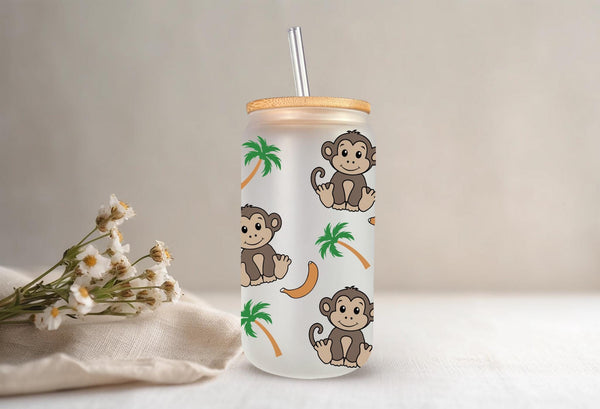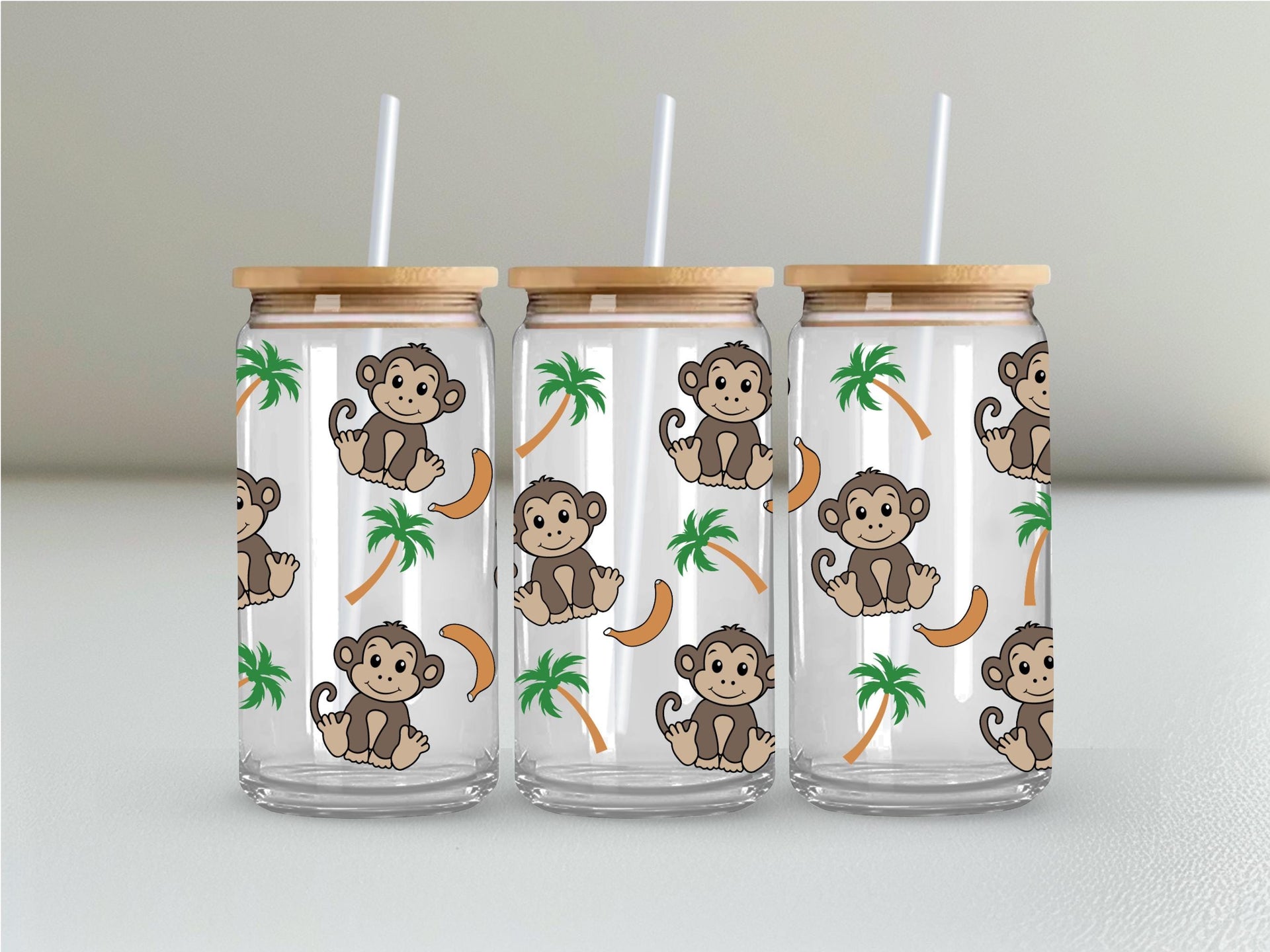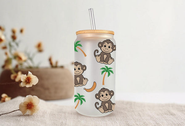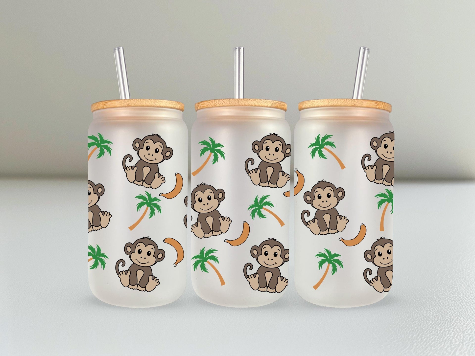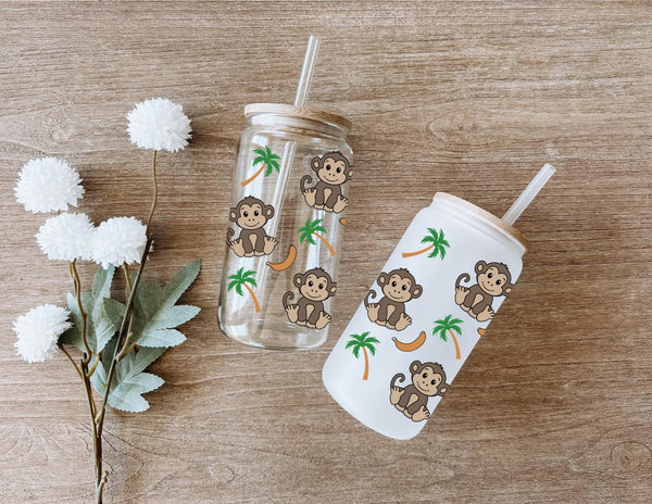 Experience the jungle in your own home with our Monkey Glass Cup! Featuring a playful design of monkeys, palm trees, and bananas, this 16oz glass cup is sure to bring a touch of tropical fun to your daily routine. Choose between a clear or frosted design and quench your thirst in style.
