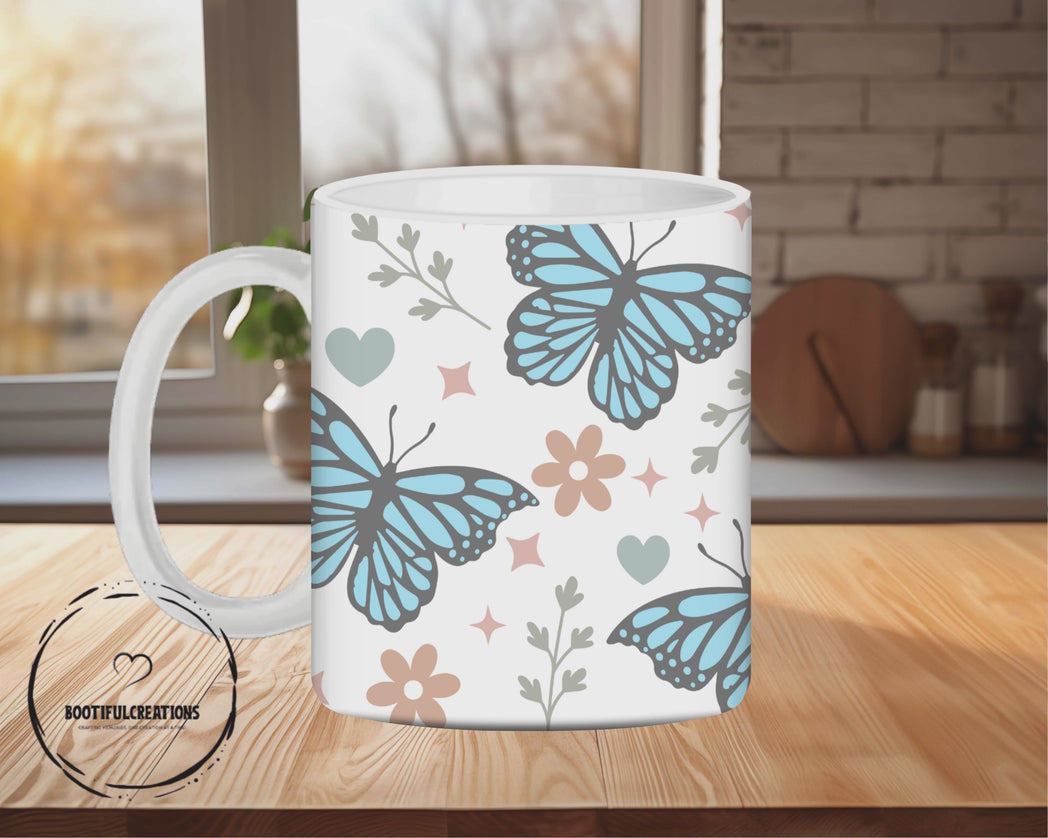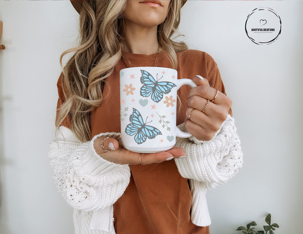 Indulge in your morning coffee with our Pastel Blue Butterfly Coffee Mug! Featuring delicate pastel blue butterflies, this ceramic mug comes in both 11oz and 15oz sizes for your preferred caffeine fix. Brighten up your day with every sip and add a touch of beauty to your daily routine.