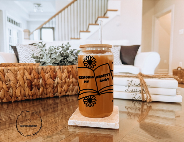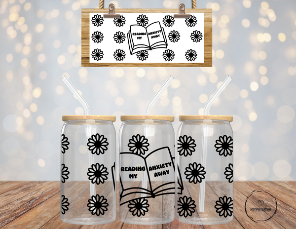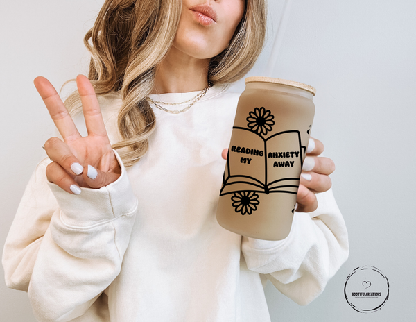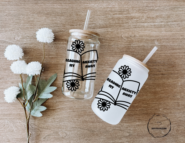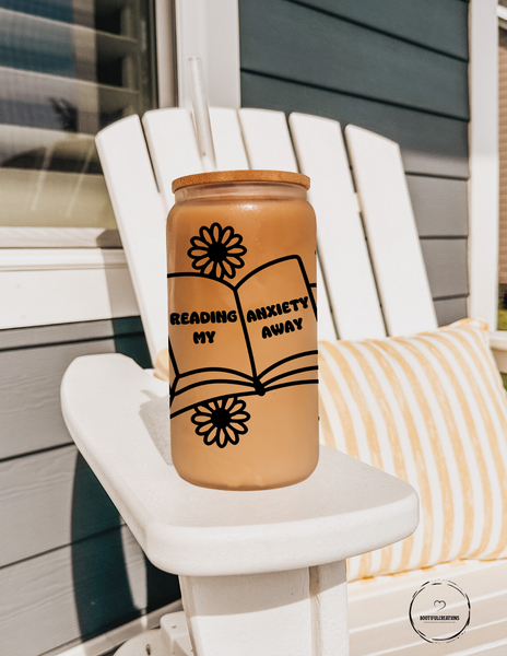 Indulge in self-care with the "Reading My Anxiety Away" Glass Cup. With its beautiful floral design, this 16oz cup comes in clear or frosted. Relax and unwind while sipping your favorite drink, and let the words on the cup inspire you to read your worries away.