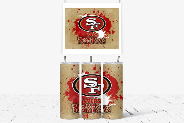 49ers Nation: A high-energy, artistic design featuring a tan/gold background with vibrant red paint splatters and stylized "49ers Nation" text.