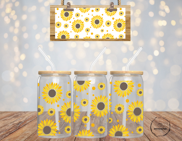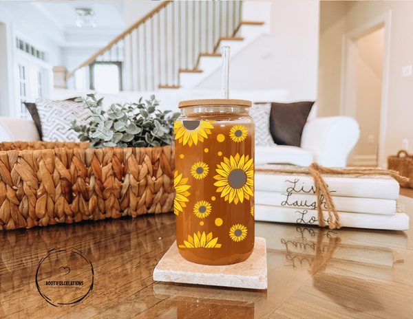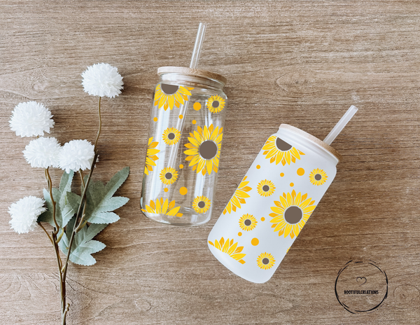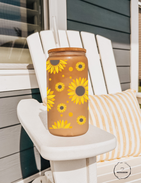 Indulge in your love for sunflowers with our 16oz glass cup featuring beautiful sunflower designs. You can choose between a clear or frosted cup, adding a touch of nature to your daily routine. Sip in style and be inspired by the vibrant colors of this magnificent flower!