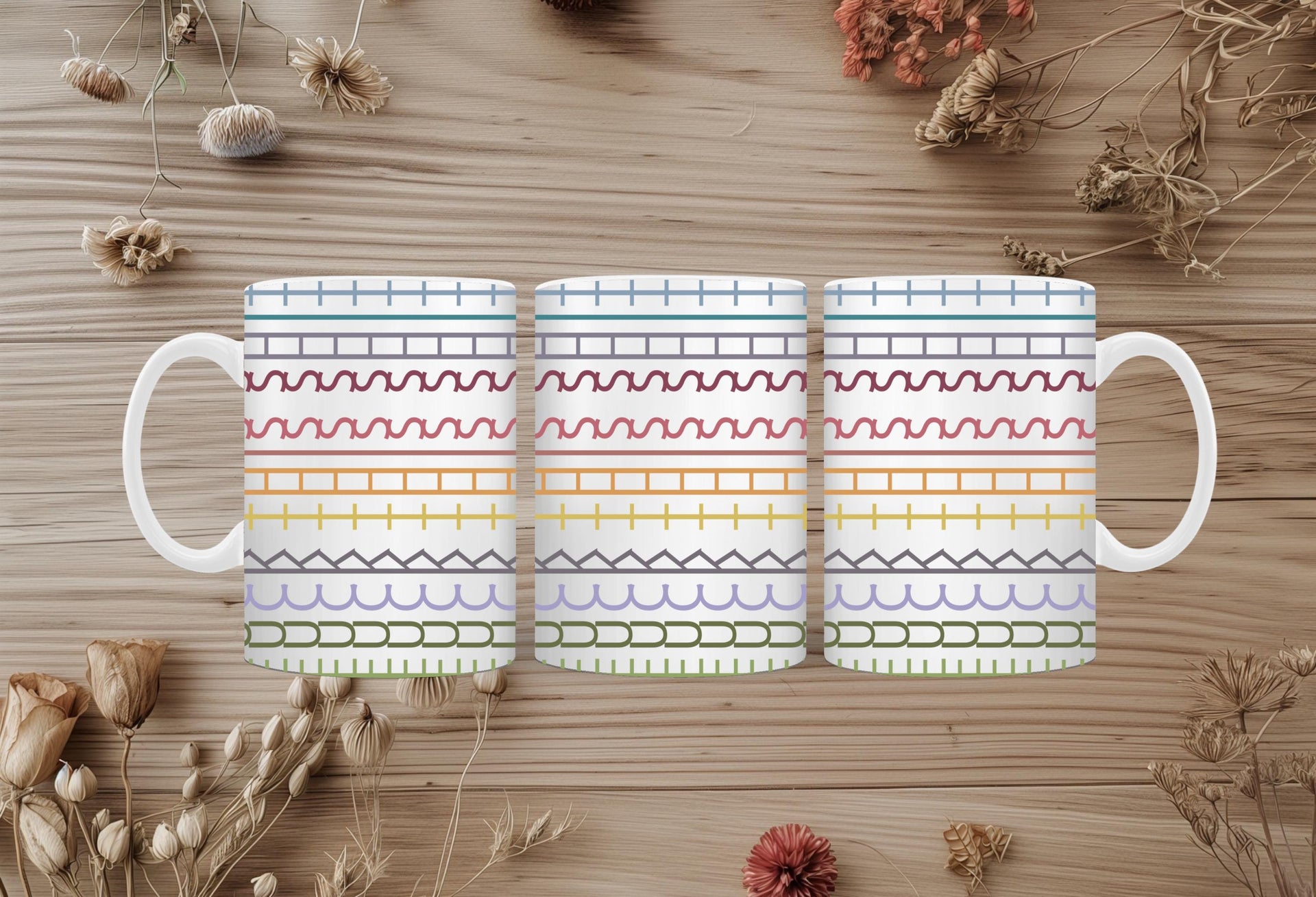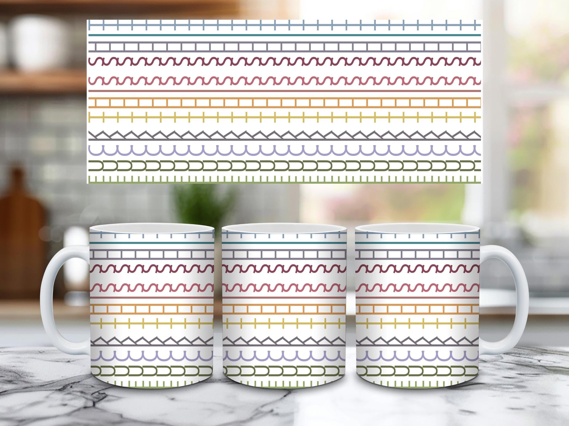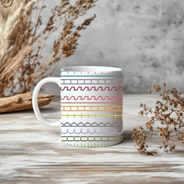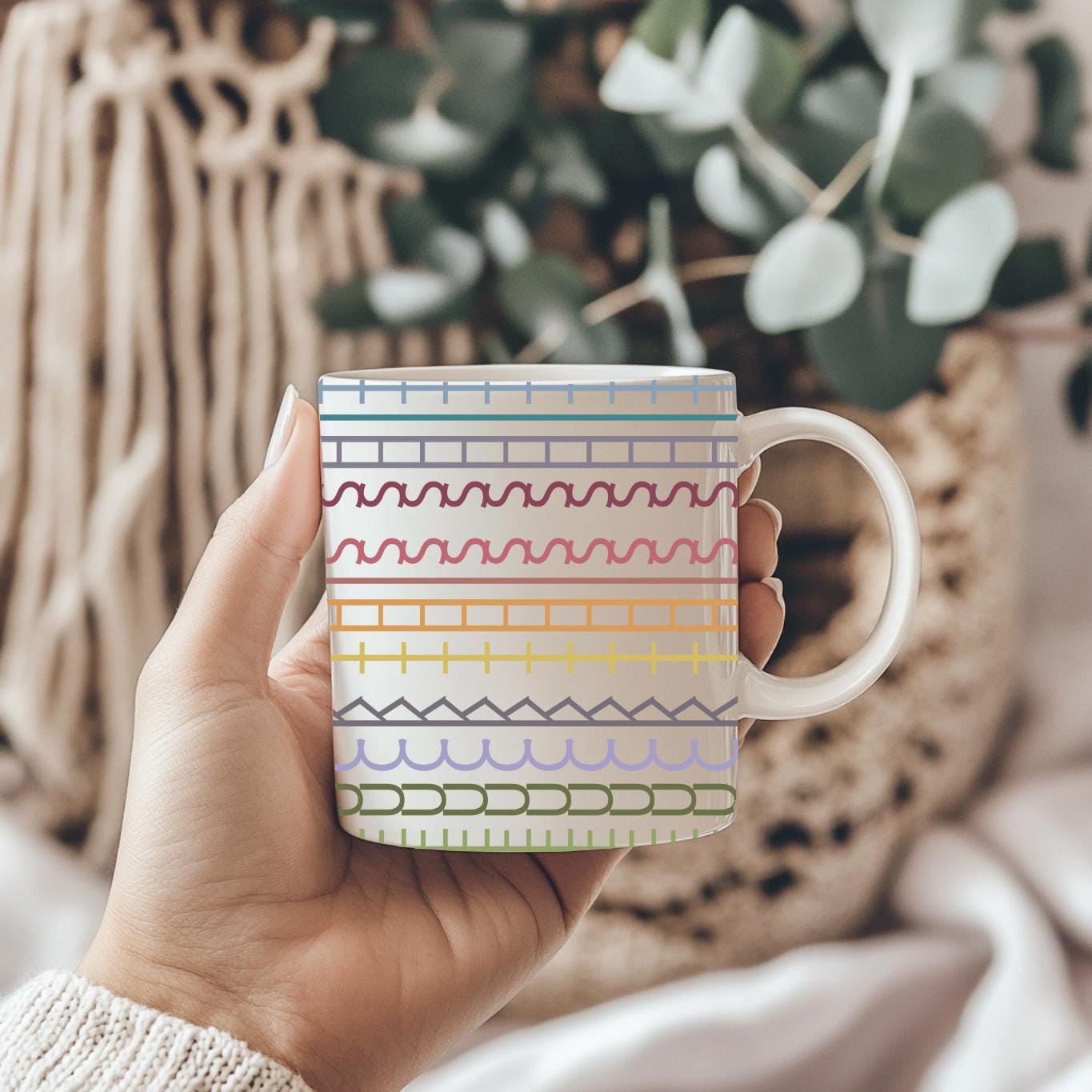 From a distance, this mug appears to feature a beautiful, calming, abstract boho stripe pattern in warm, earthy colors. It’s perfect for adding a touch of cozy, artistic flair to your desk or kitchen...