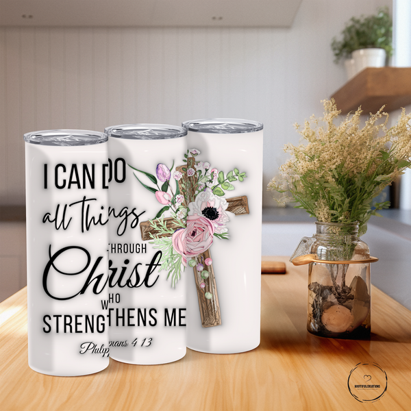 Stay hydrated and inspired with our "Through Christ" tumbler! With uplifting words and a beautiful floral cross design, it's perfect for hot or cold beverages and keeps drinks at their desired temperature for hours. Personalize it with a name for an extra special touch. Let your faith shine through with every sip!