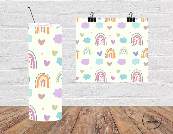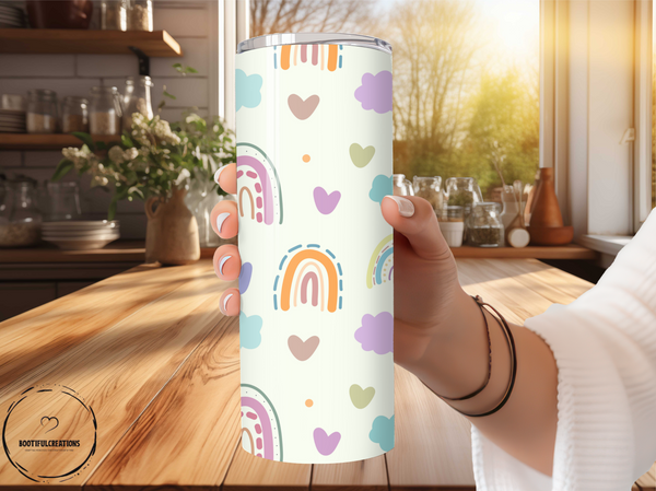 Stay hydrated in style with our Whimsical Rainbow and Heart Pattern Tumbler! Featuring playful and cheerful colorful rainbows, hearts and clouds in pastel shades, this tumbler will brighten up your day. Keep your drinks hot for up to 6 hours and cold for up to 24 hours, and personalize it with your name for a unique touch. Stay happy and hydrated with our tumbler!