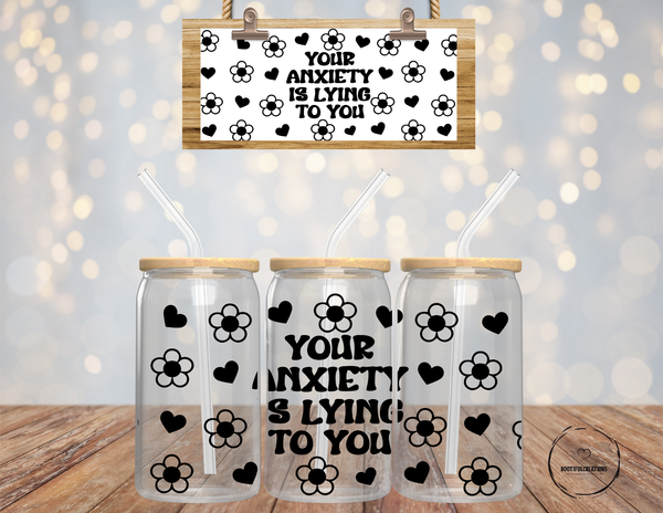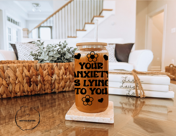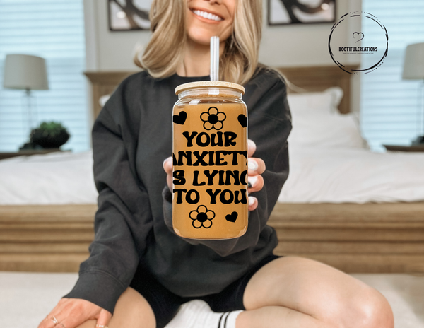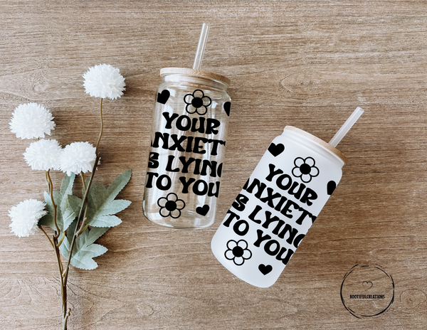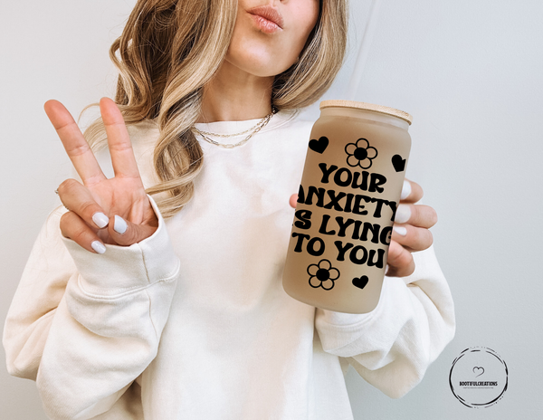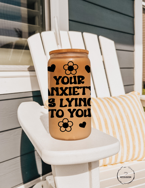 Believe in the power to overcome anxiety with our "Your Anxiety is Lying to You" glass cup! This 16oz clear or frosted cup serves as a daily reminder to trust yourself and your inner strength. Let go of doubt and embrace a positive mindset with every sip.
