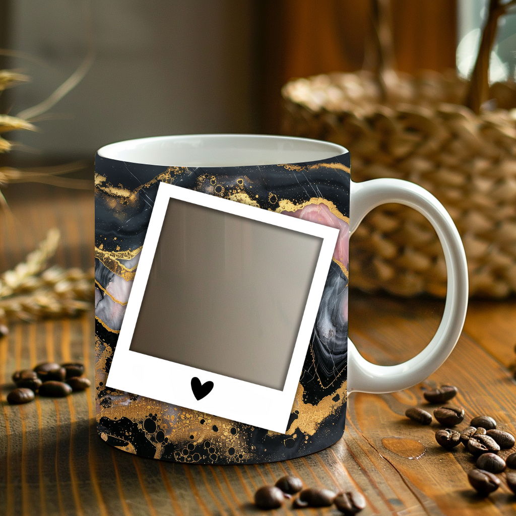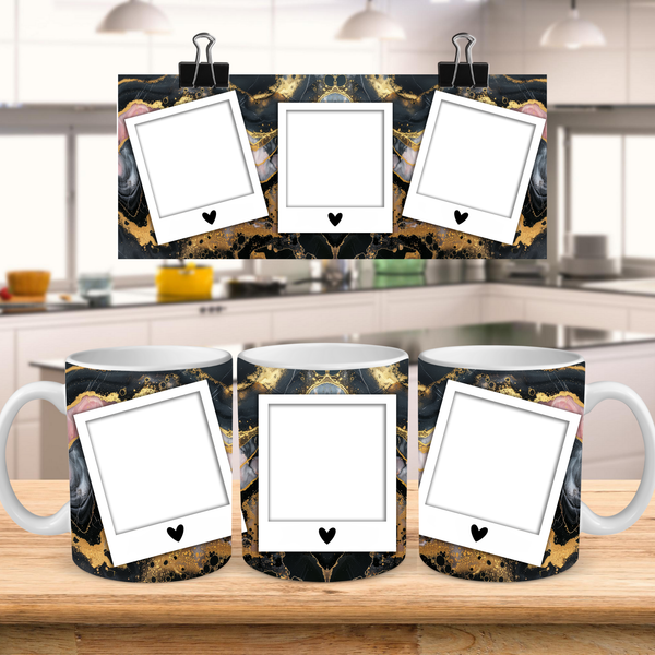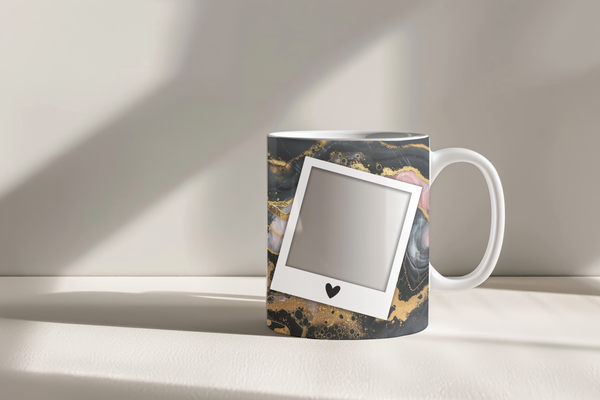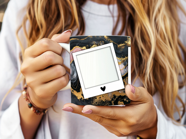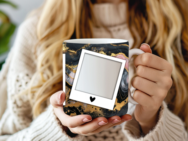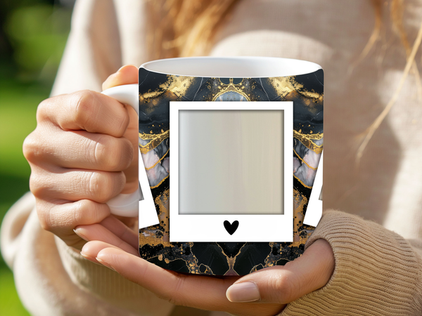 Elevate your coffee experience and showcase cherished memories with our stunning customizable Photo Frame Coffee Mug! This elegant mug features a striking abstract design of black and gold marble, creating a sophisticated and artistic backdrop for your favorite moments. Each mug is thoughtfully designed to display three of your beloved photos within classic polaroid-style frames, each subtly adorned with a charming heart detail. Perfect for your daily coffee, tea, or any hot beverage, this mug transforms into a unique personal keepsake or a thoughtful gift for family and friends on any special occasion. It's available in both a convenient 11oz size and a more generous 15oz capacity to suit your preference. Simply add your desired photos to create a truly personalized and heartwarming mug that will be treasured for years to come!